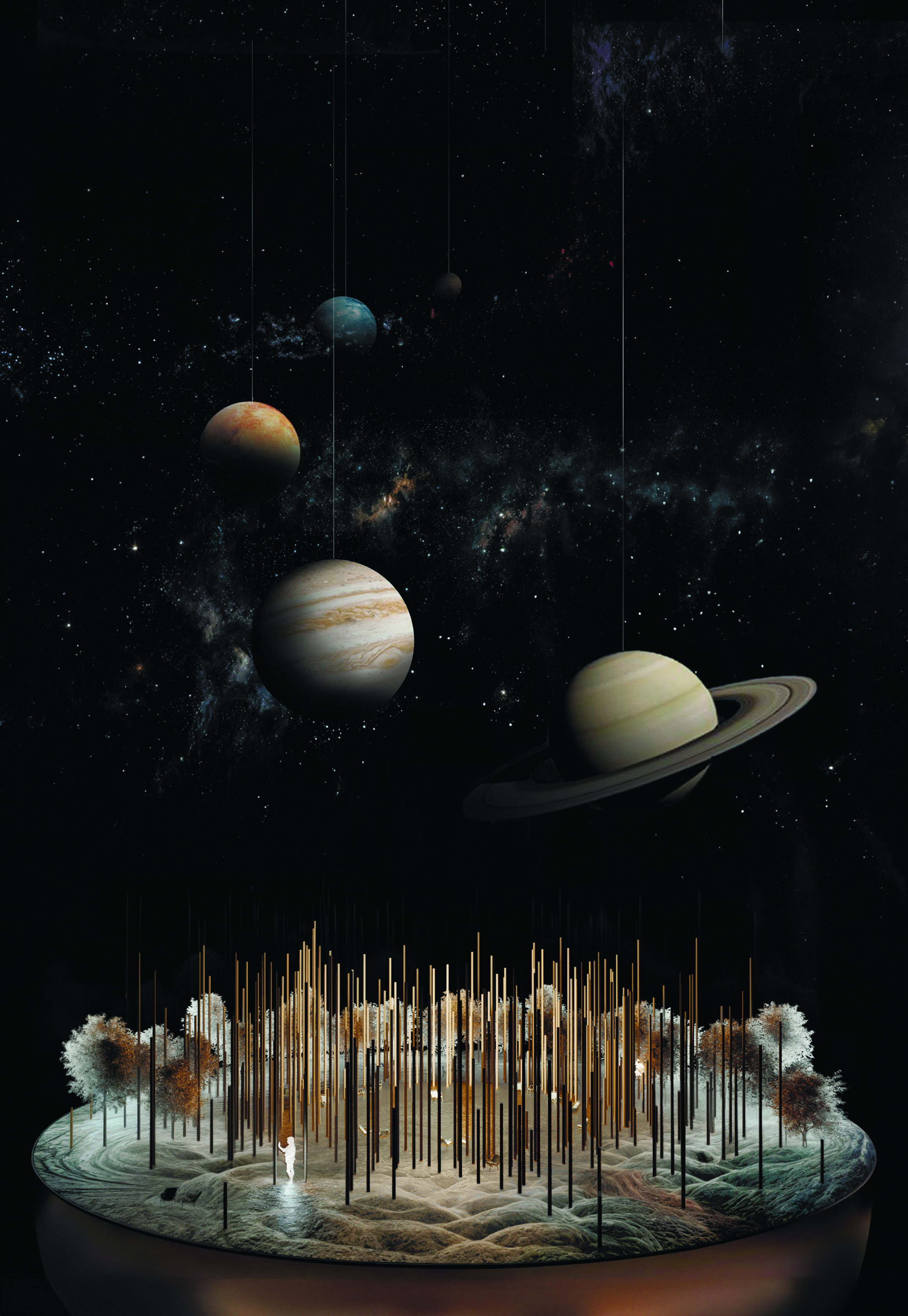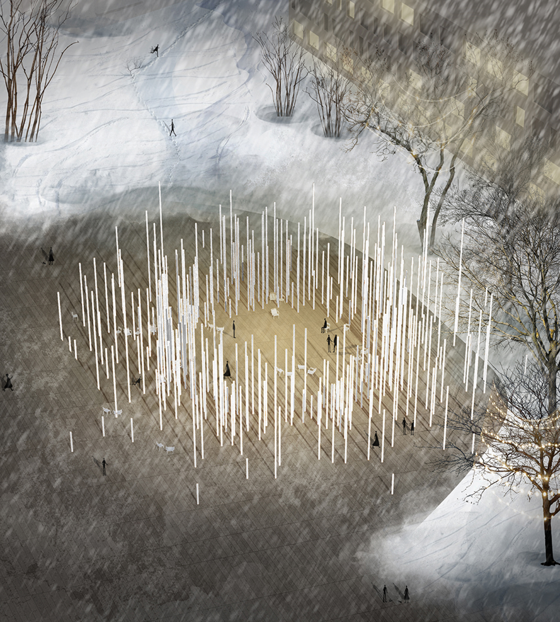 Спроектированный объект представляет собой круговую композицию из бетонных колонн разной высоты, создающих эффект леса. Колонны расположены согласно особой драматургии — их плотность нарастает по мере движения к центру, где открывается свободное пространство под открытым небом.