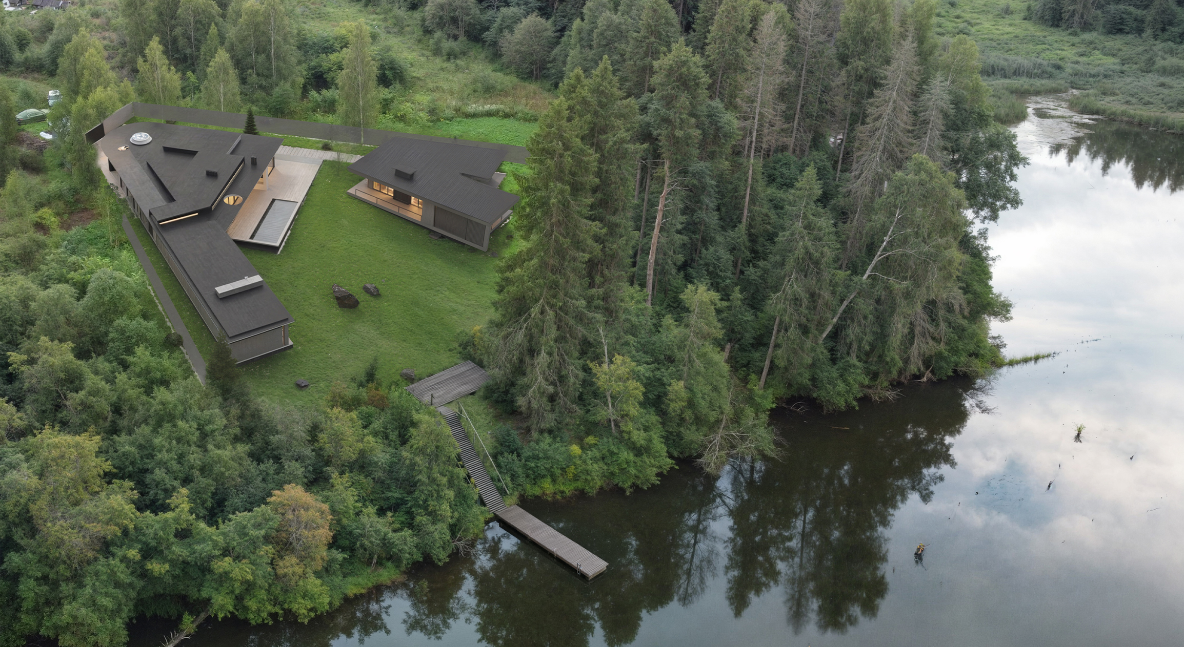 Расположение зданий на участке продиктовано ориентацией по сторонам света. Вход организован в той точке, где сходятся две линии треугольника участка, создавая ось симметрии, ведущую к главному дому. Участок расширяется к реке, где открывается панорамный вид на воду. Архитектура комплекса при этом остается скрытой от посторонних глаз. Большие окна ориентированы так, чтобы впускать максимум естественного света. Конфигурация домов и жилых комнат, обращенных внутрь участка, призвана создать пространство интеракции для обитателей дома. Центральной точкой притяжения стала терраса с уличной кухней и просторная гостиная главного дома.