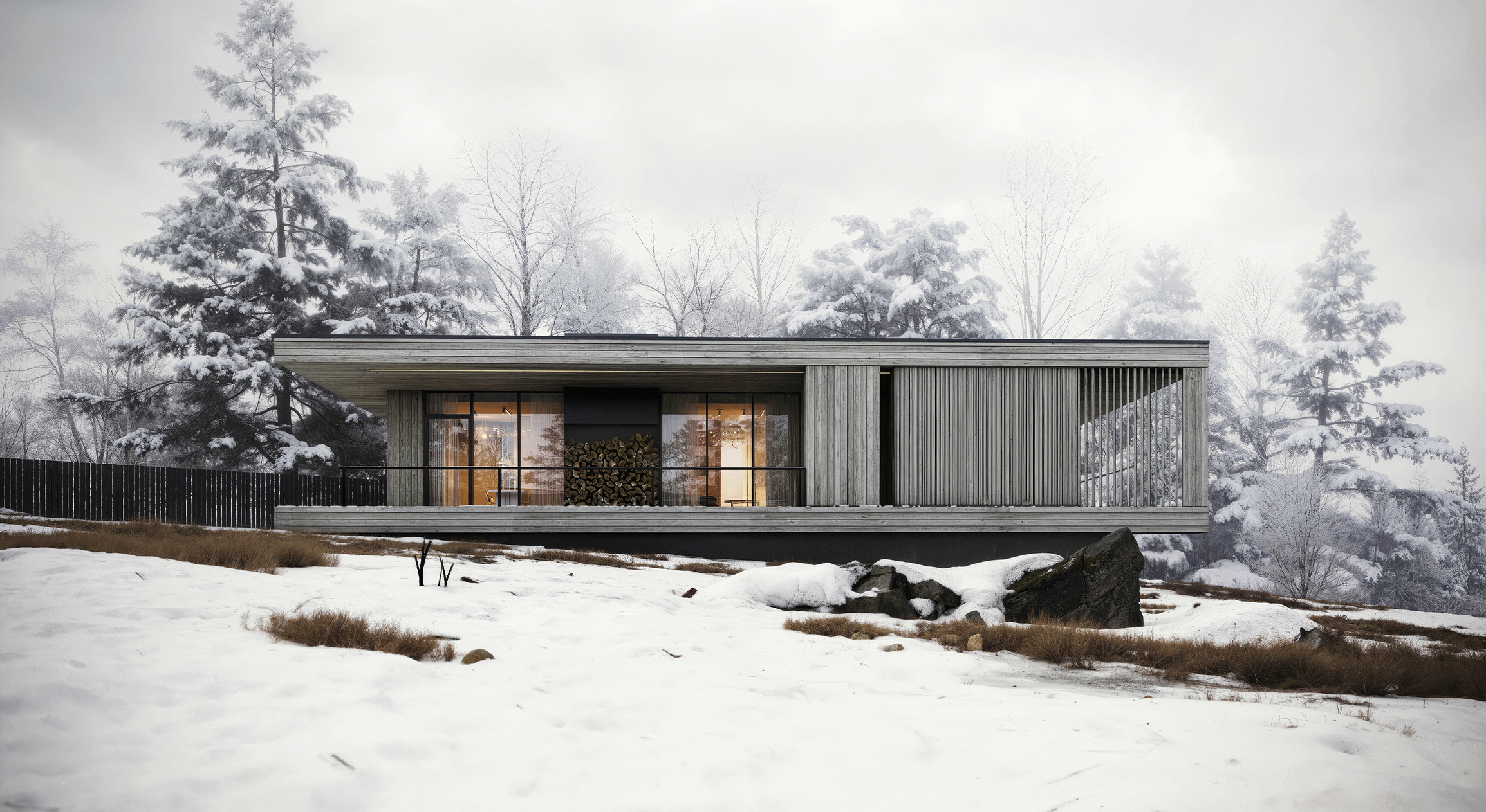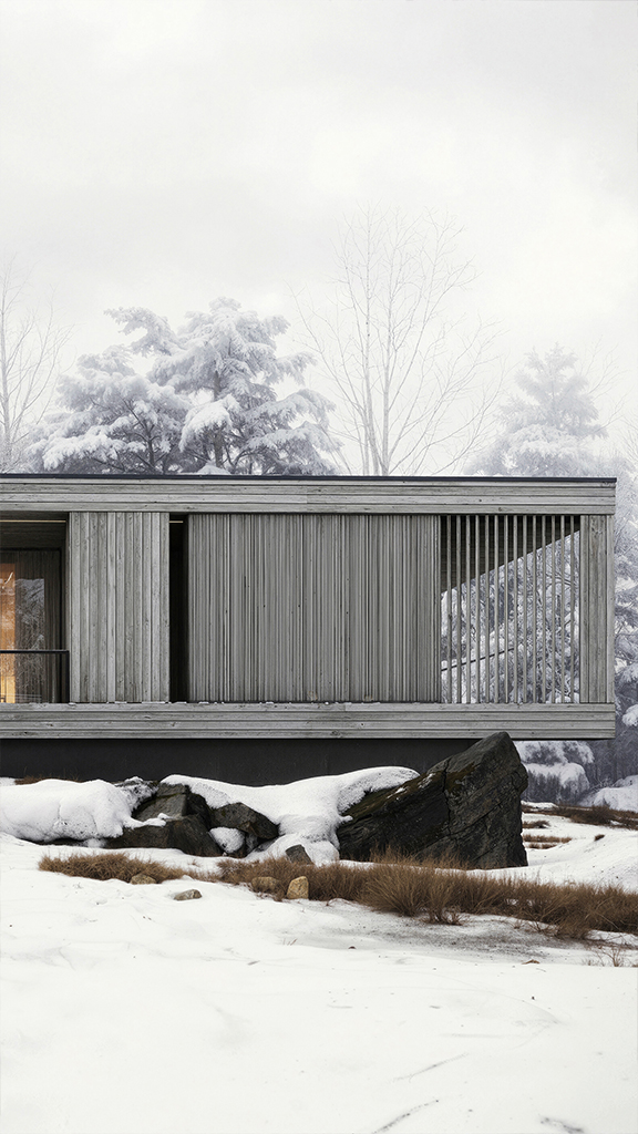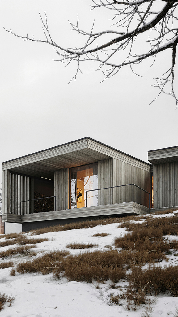 Гостевой дом, напротив, выполнен из массива дерева по технологии CLT (кросс-ламинированная древесина). Это решение не только подчеркивает природную эстетику, но и создает контраст с бетонным объемом. Здесь архитектура словно раскрывается навстречу окружающему пейзажу, его мягкости и изменчивости.
