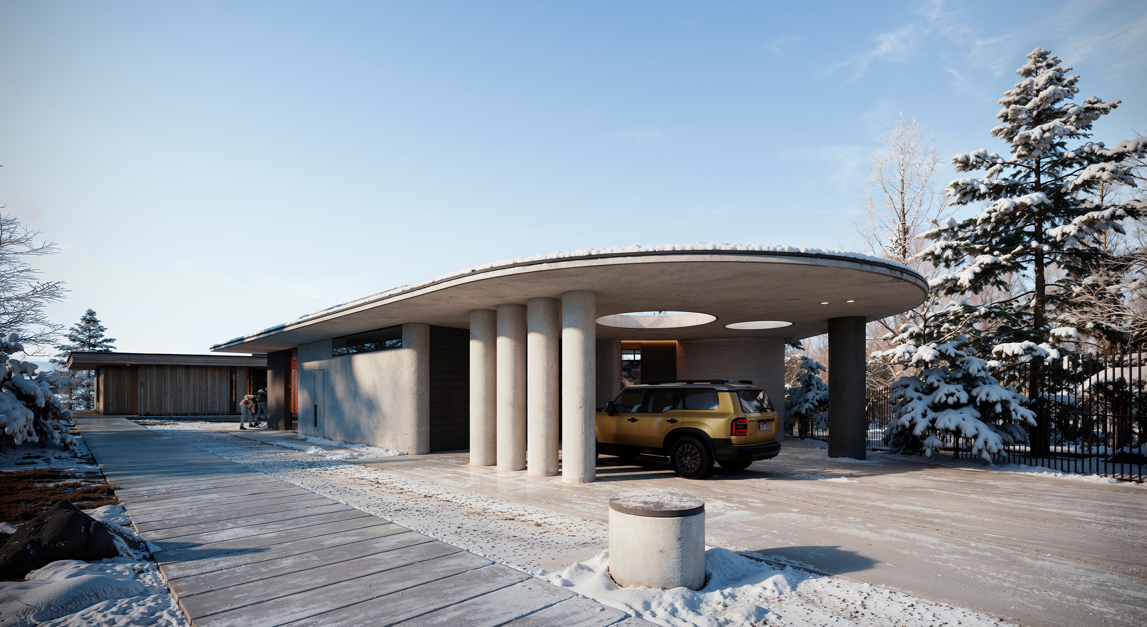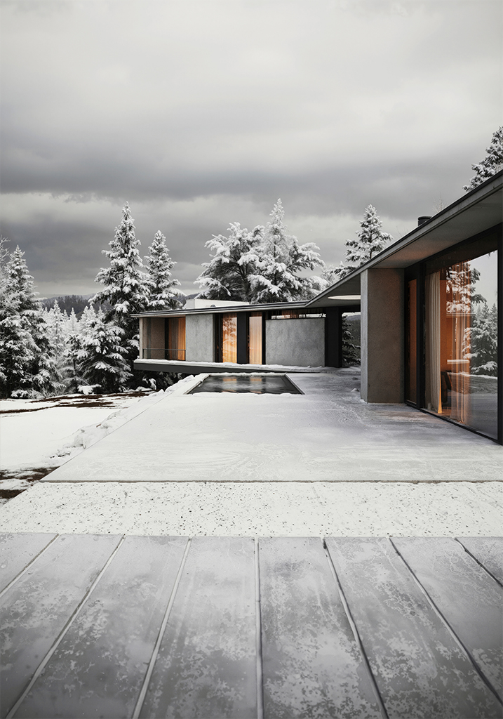 Главный дом из монолитного бетона символизирует устойчивость и долговечность. Его строгие, графичные линии подчеркивают тектоничность архитектуры. При этом здание не выглядит массивным — консольные конструкции, выступающие над ландшафтом, создают ощущение невесомости.