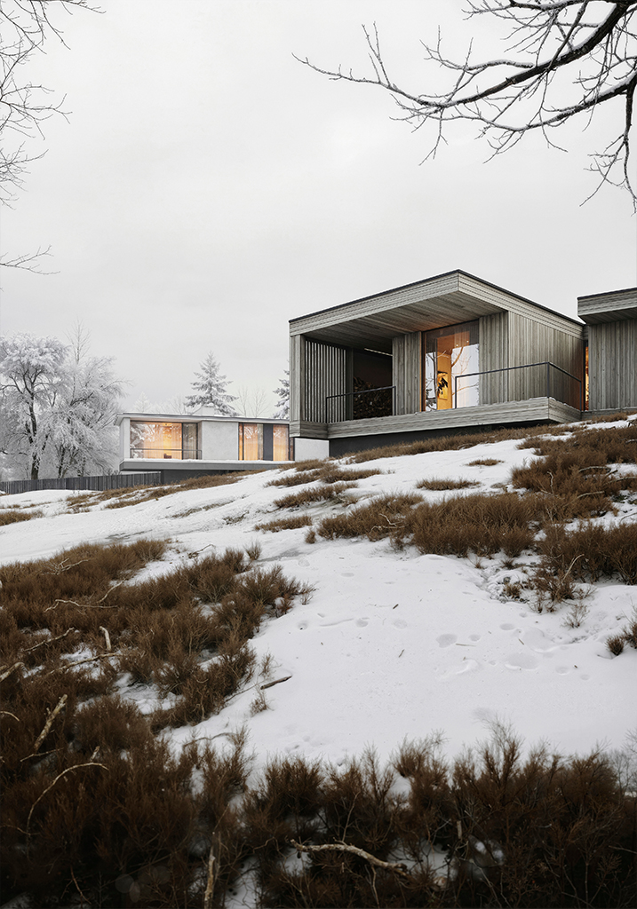 Архитектура проекта — это исследование материала и его возможностей. Бетонный объем с консольным выносом словно парит над оврагом. Крупные плоскости стен, широкая бетонная терраса и ряд толстых колонн собирают детали дома в цельный архитектурный объект. Форма гостевого дома более многослойна: его объем варьируется за счет усеченных плоскостей и смещений, формируя динамичное восприятие в зависимости от точки обзора. Протяженные свесы кровли призваны усилить чувство защищенности. Несмотря на различия между холодным бетоном и древесиной, оба дома транслируют теплоту пространства для жизни. Их фасады раскрывают потенциал выбранных материалов. В бетонном доме текстура опалубки оставляет следы, подчеркивающие честность и брутальность конструкции. В деревянном доме панели CLT демонстрируют естественную текстуру древесины, которая со временем будет стареть, придавая строению дополнительную выразительность.