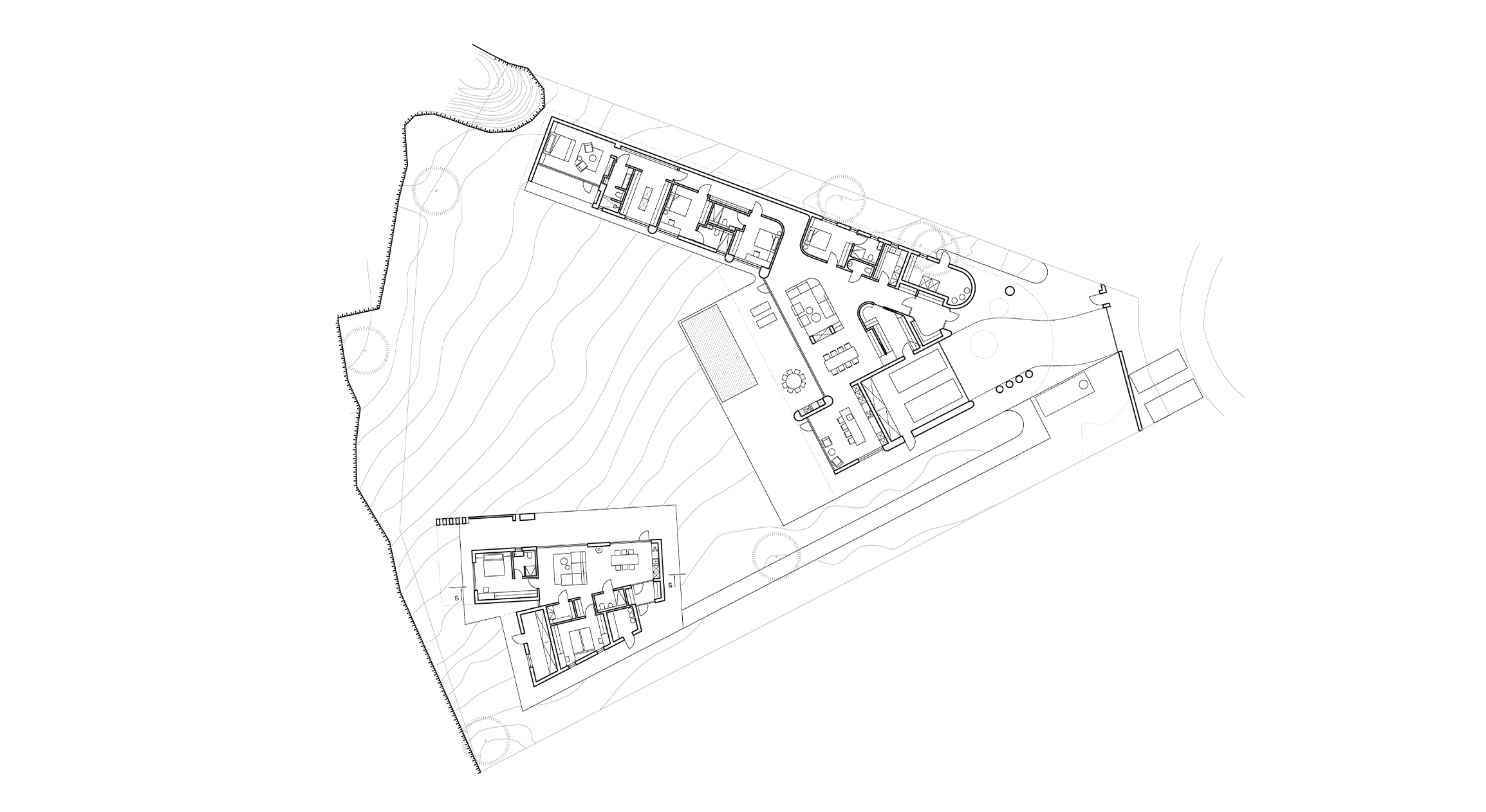 Комплекс был возведен на сложном участке треугольной формы, располагающимся на склоне. Мы постарались сохранить особенности участка и учесть его геометрию, разместив два объёма таким образом, чтобы сохранить ландшафт. По просьбе заказчика гостевой дом задуман как временная постройка, поэтому спроектирован компактным и экономичным.