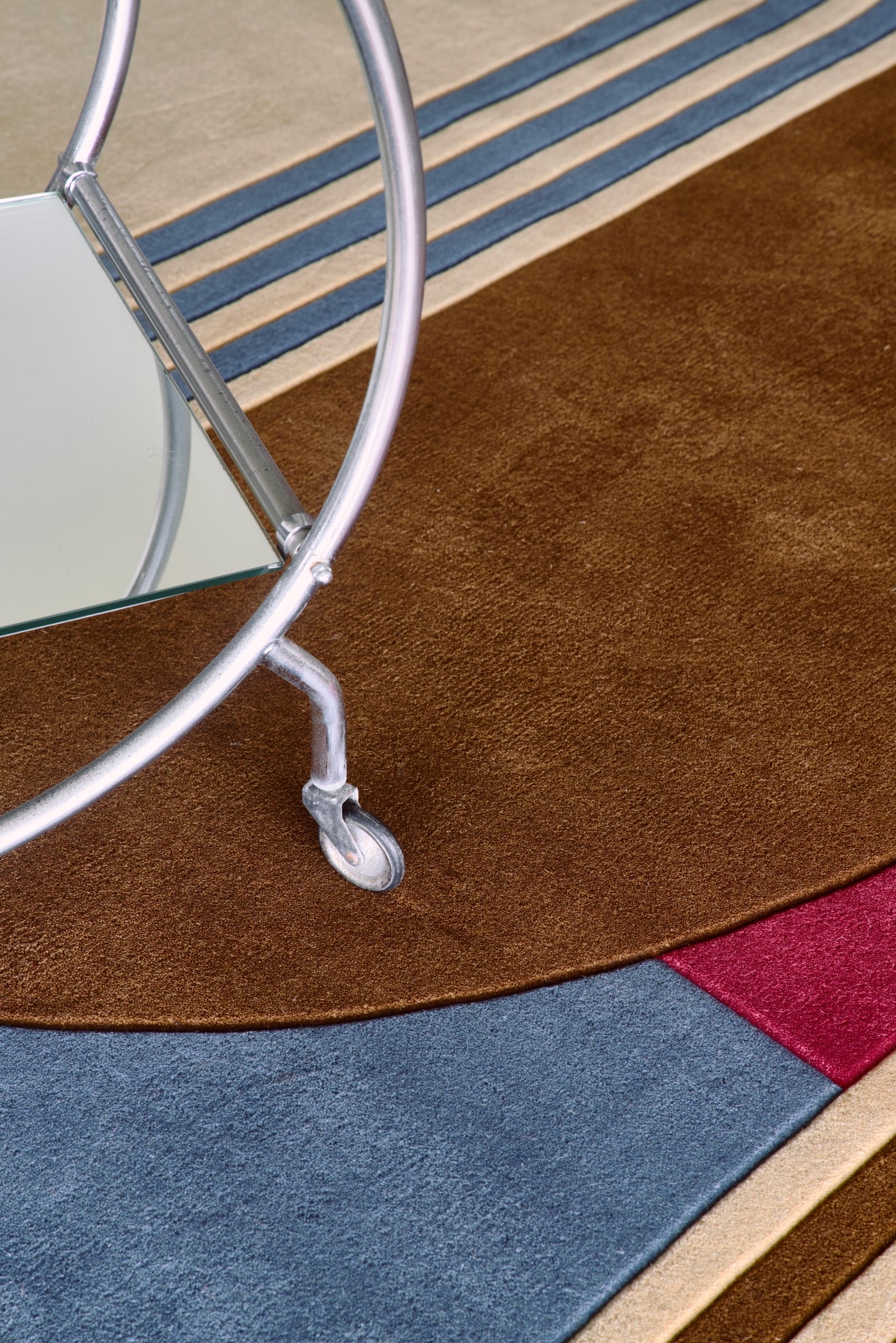 В основе коллекции — три выразительных дизайна, каждый со своим геометрическим сценарием. Coppa Canella строится на вертикальном движении полукругов в приглушенной палитре земли и терракоты. Mezza Confetto работает с круговыми композициями и контрастными цветовыми сочетаниями, создавая ощущение ритмической мозаики. Doppio Rosa выстраивает диалог двух цветовых полей, подчеркнутых строгой линейной рамкой — почти как план модернистского интерьера.