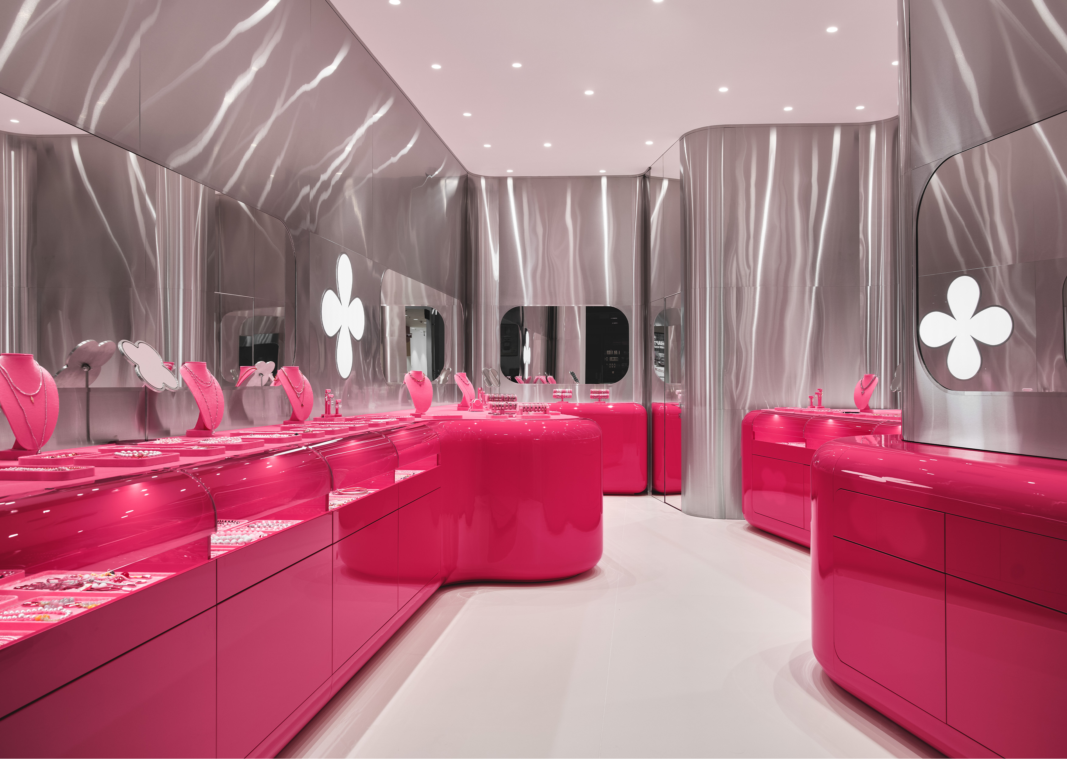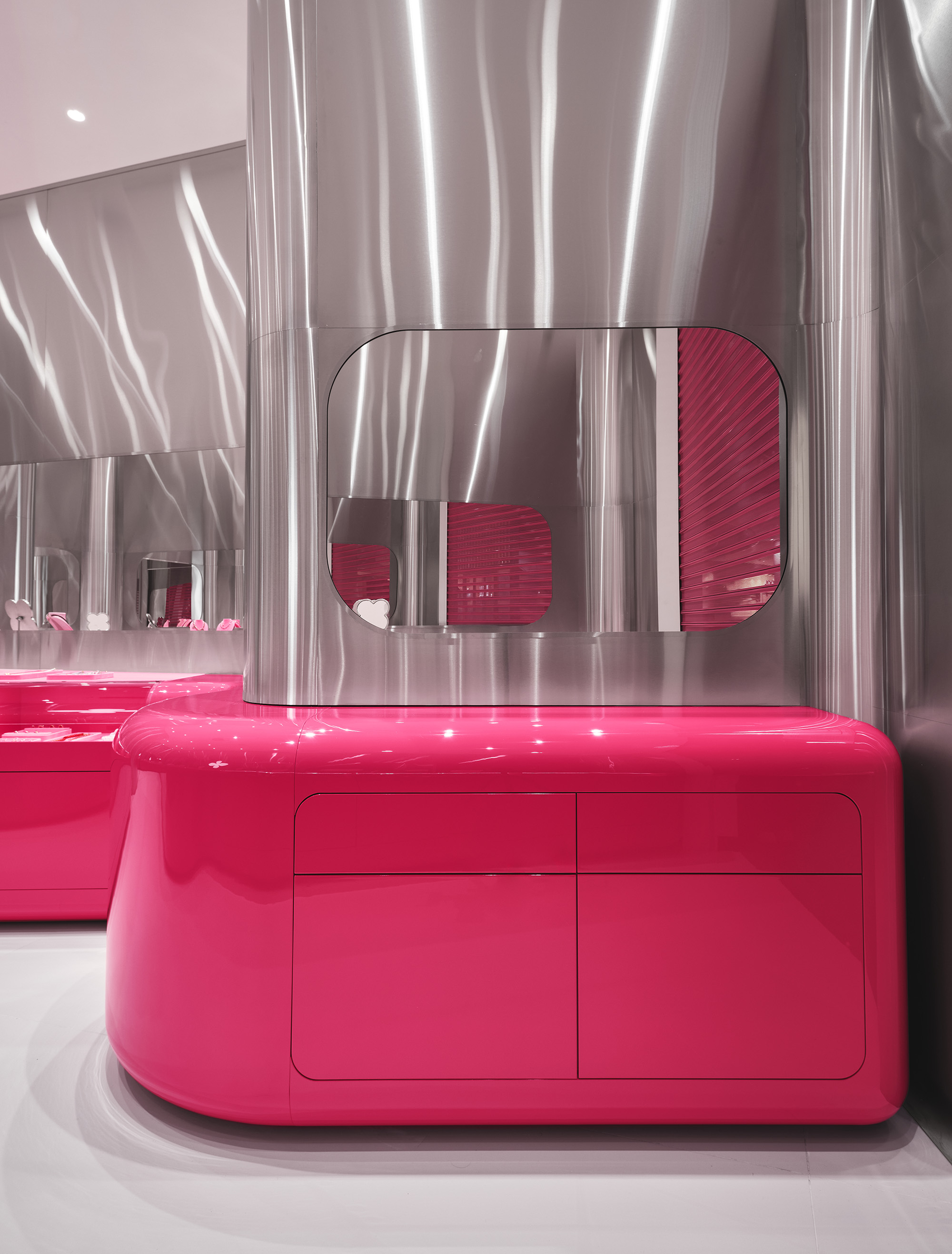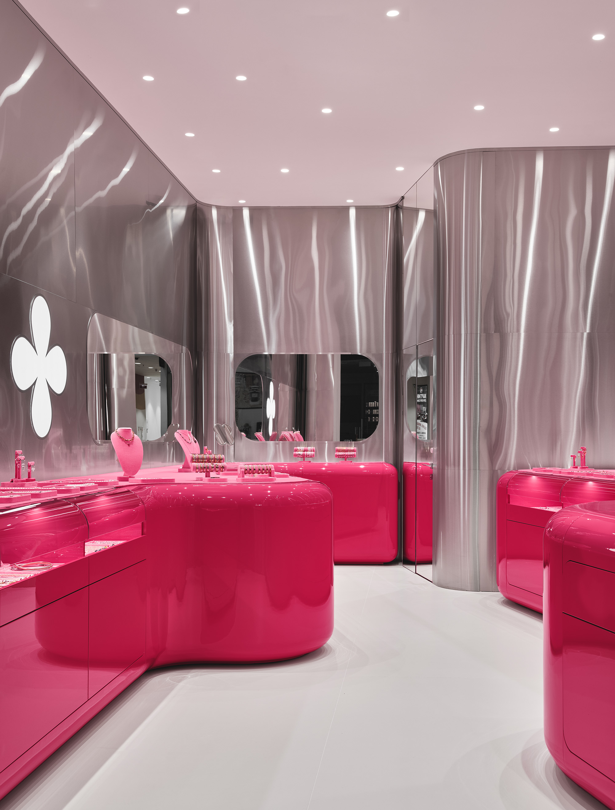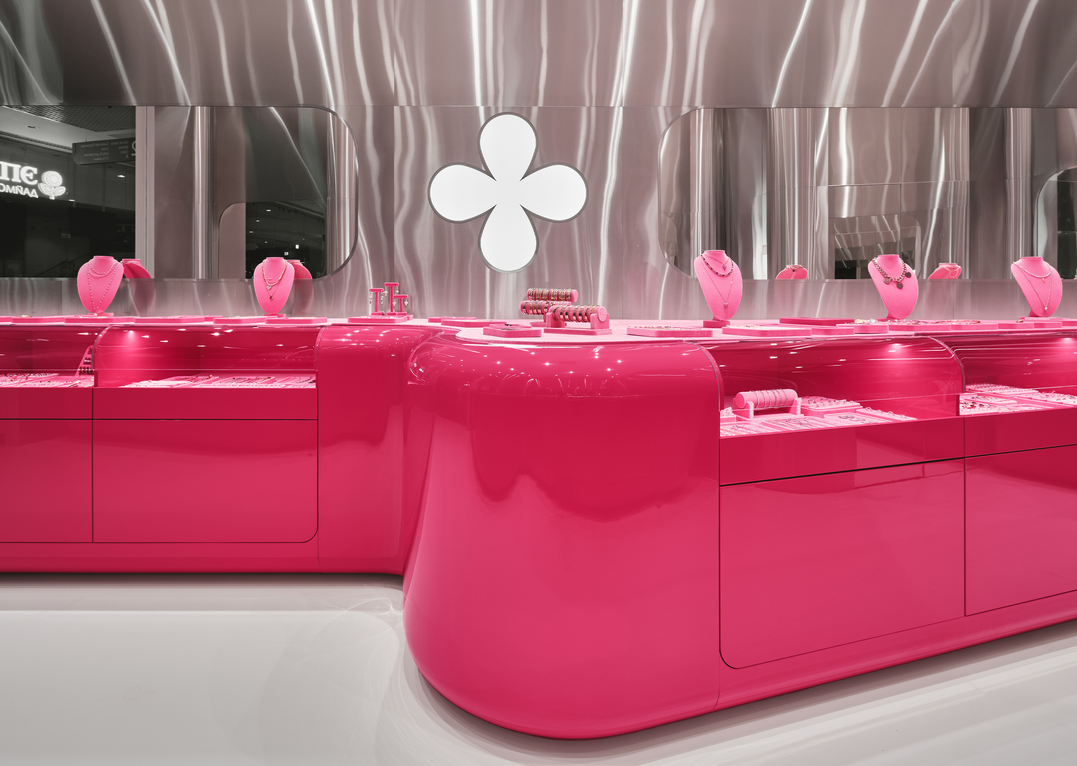 Цветовая палитра строится на фирменном розовом цвете, дополненном хромом, белыми и зеркальными поверхностями. В то же время каждый проект аккуратно добавляет новые материалы или фактуры: матовый металл, стеклопластик, пластик с подсветкой – сделать образ ещё разнообразнее.