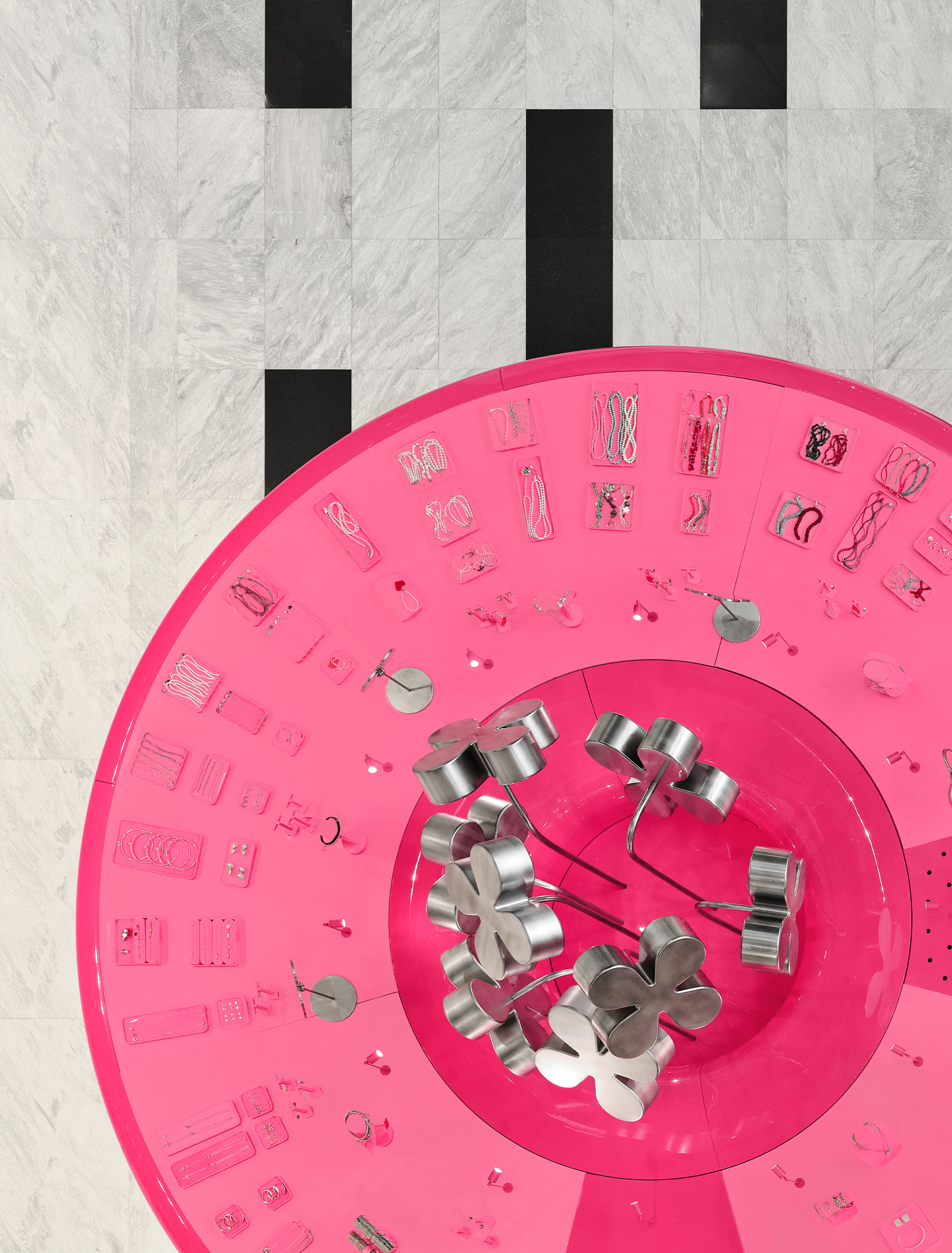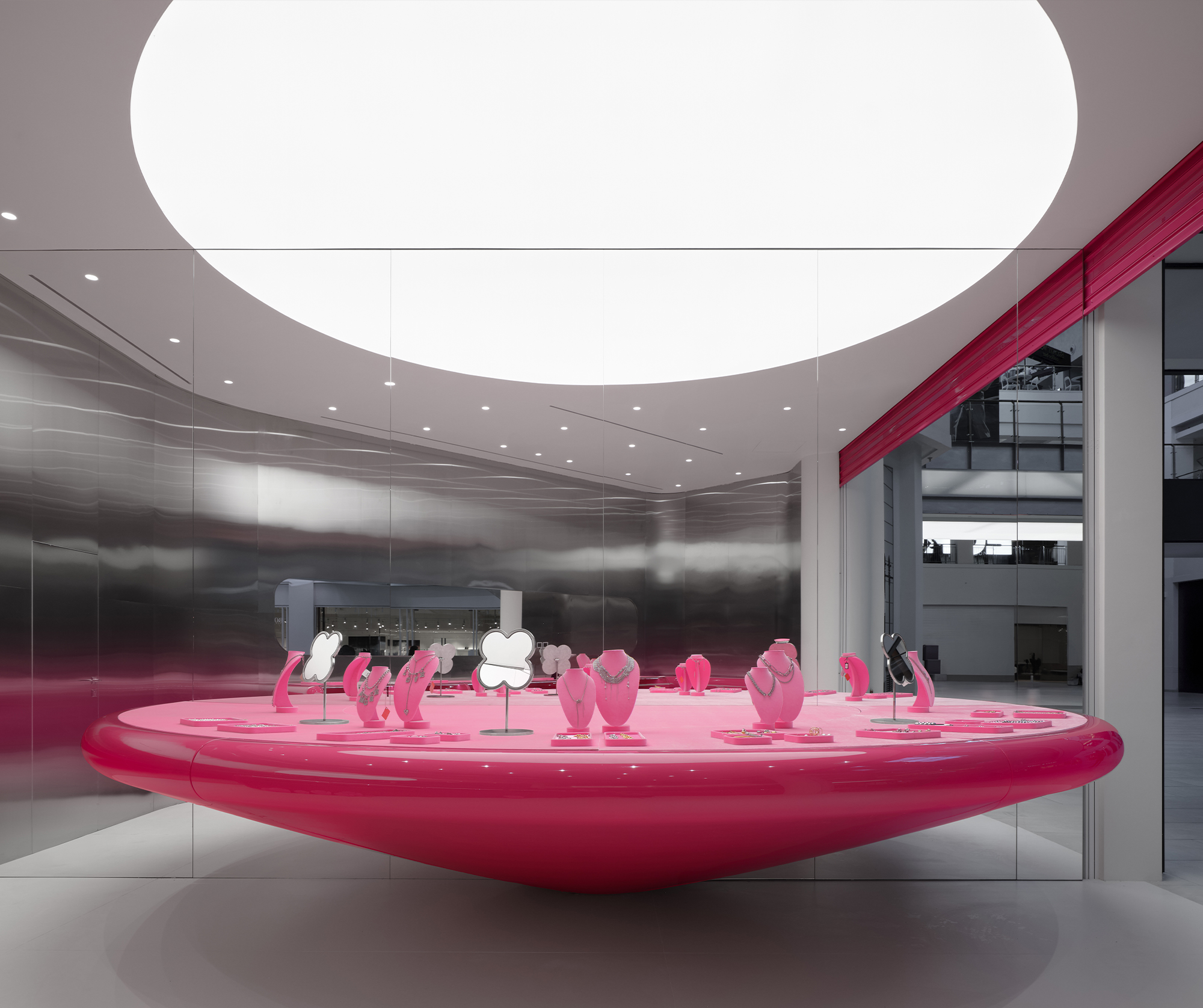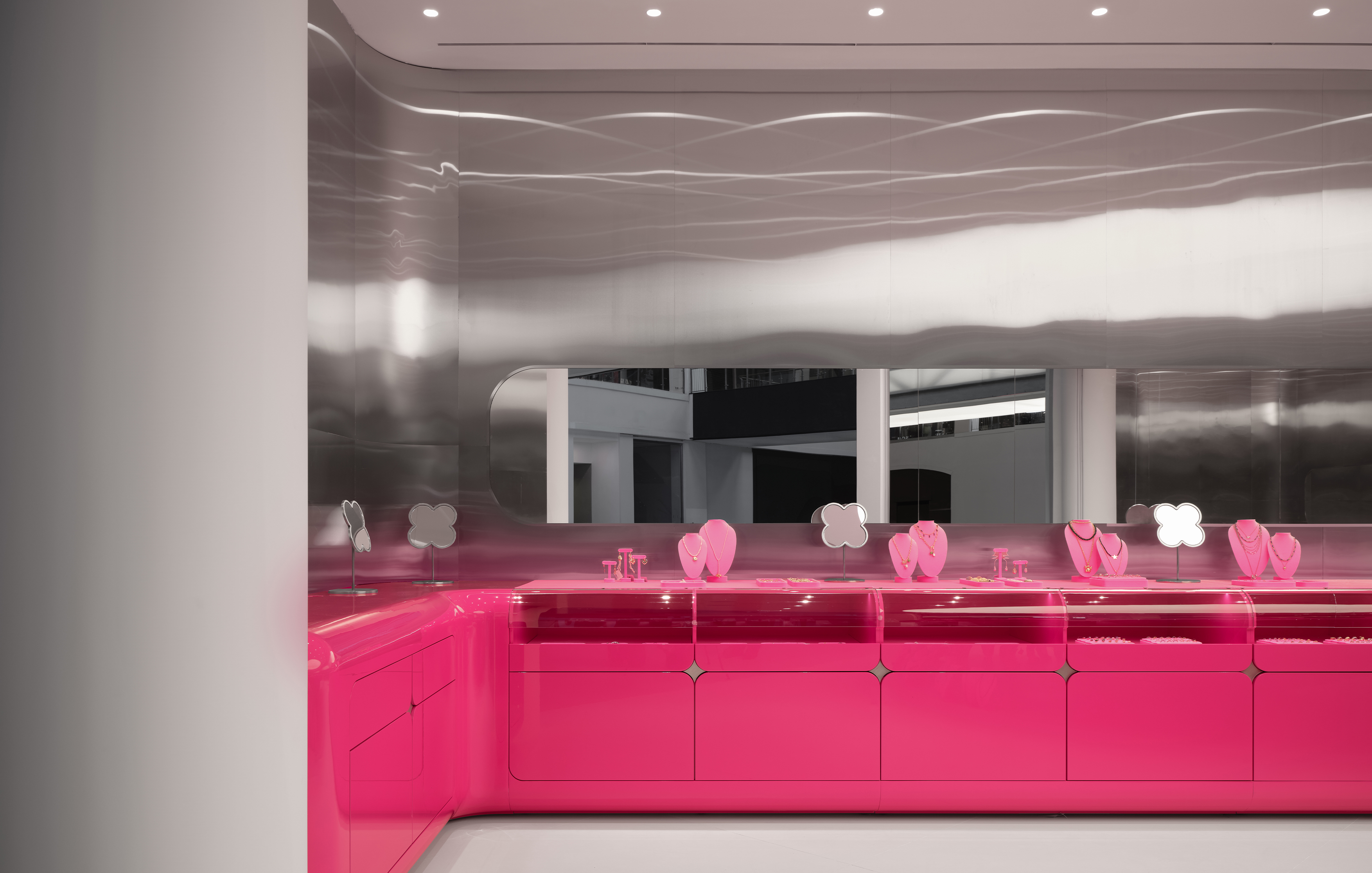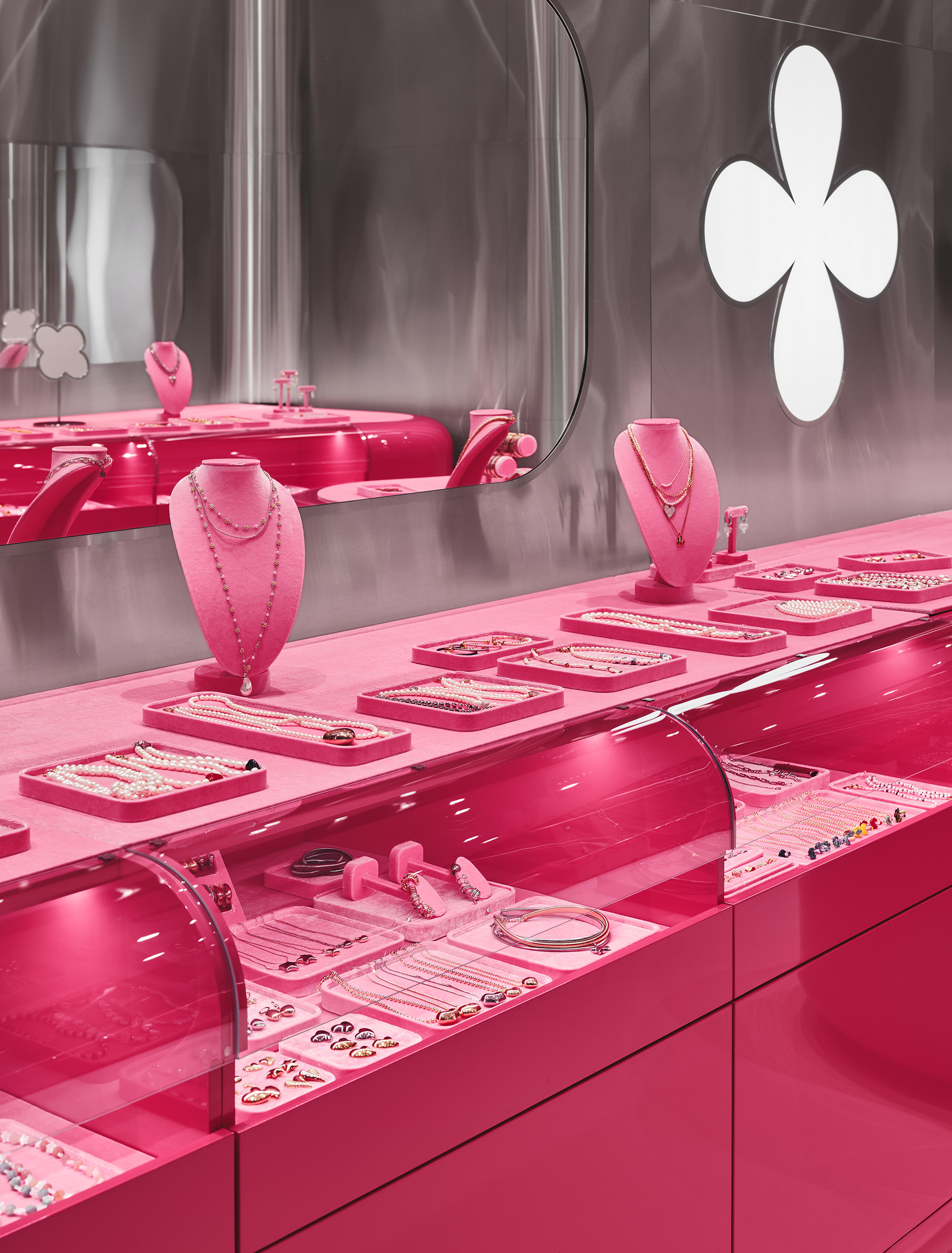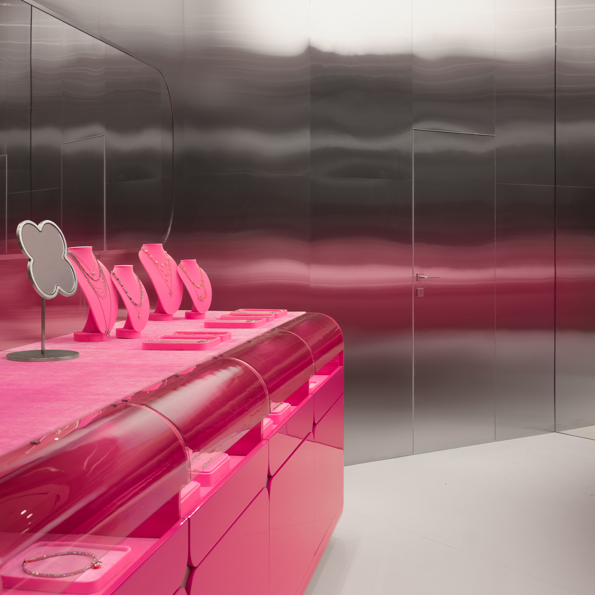 Цветовая палитра строится на фирменном розовом цвете, дополненном хромом, белыми и зеркальными поверхностями. В то же время каждый проект аккуратно добавляет новые материалы или фактуры: матовый металл, стеклопластик, пластик с подсветкой – сделать образ ещё разнообразнее.