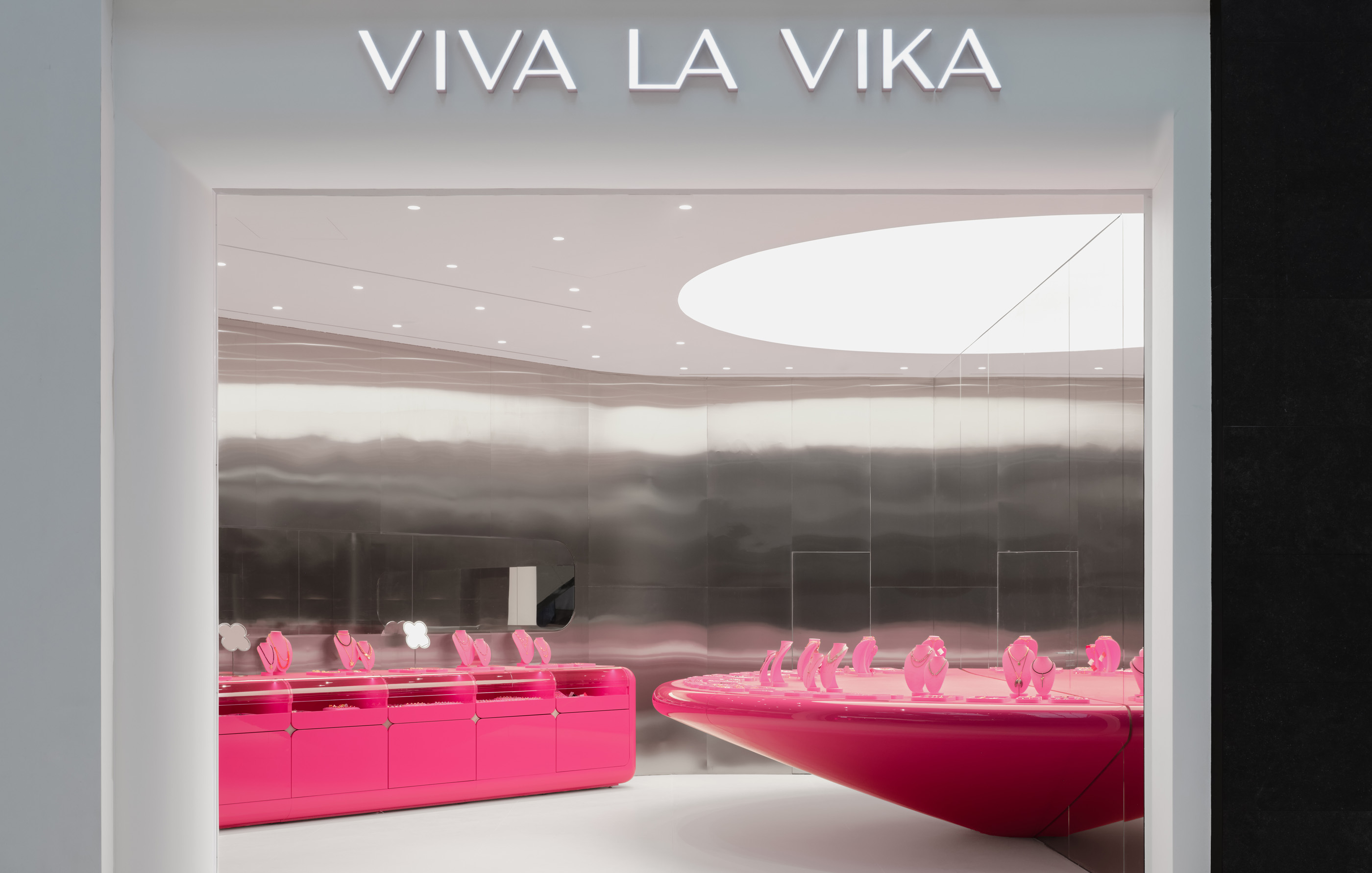 - Viva La Vika в «Галерее» (Новосибирск) – самый пластичный из всех проектов, построенный по принципу текучести. Это интерьер, вдохновленный северным сиянием и построенный внутри строгих рамок ТЦ. Мы отказались от центрального объекта и распределили визуальные акценты вдоль стен. Тумбы с плавной морфологией «растекаются» по пространству, создавая ритм и передавая идею света и движения. Стены магазина строились уже под заданные формы мебели – это перевернуло привычную последовательность работ и потребовало особой точности. Цветовая палитра осталась минималистичной: розовый, хром, белый, зеркала и один светящийся акцент – лайтбокс в виде цветка.