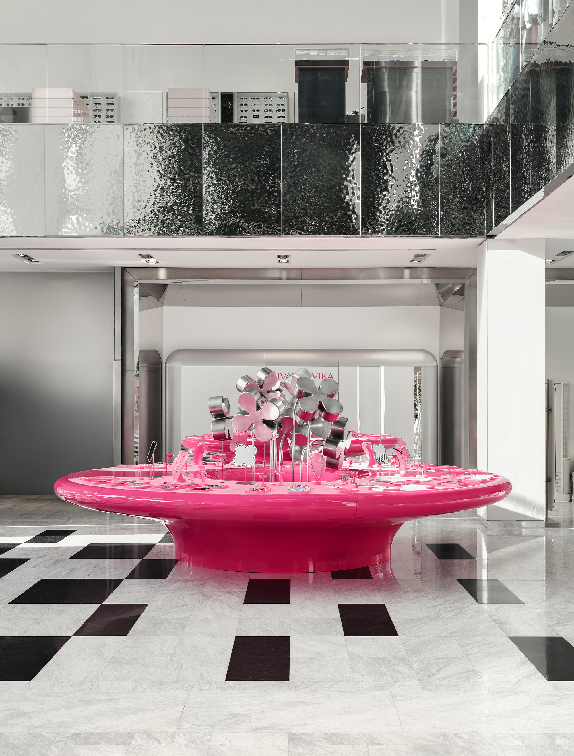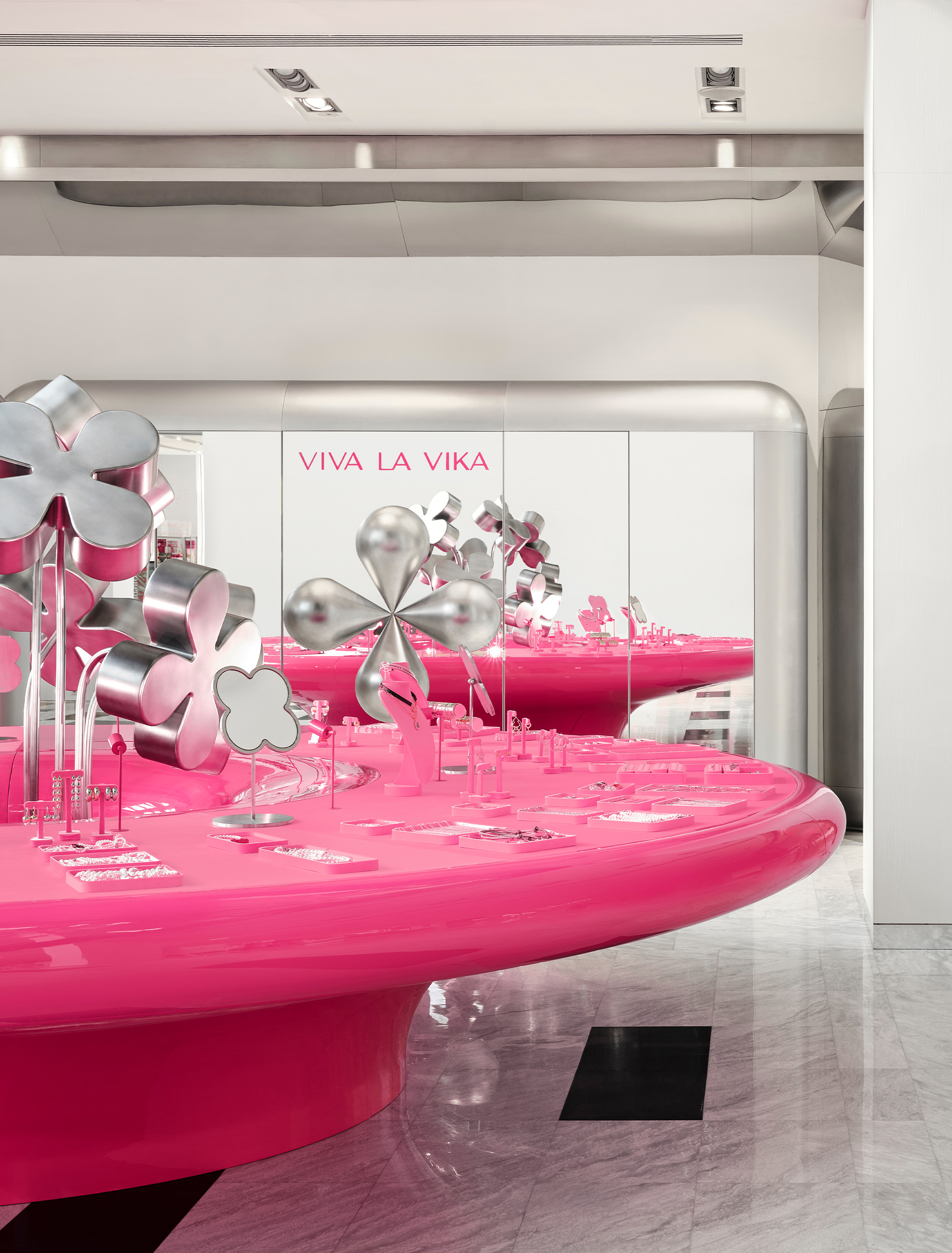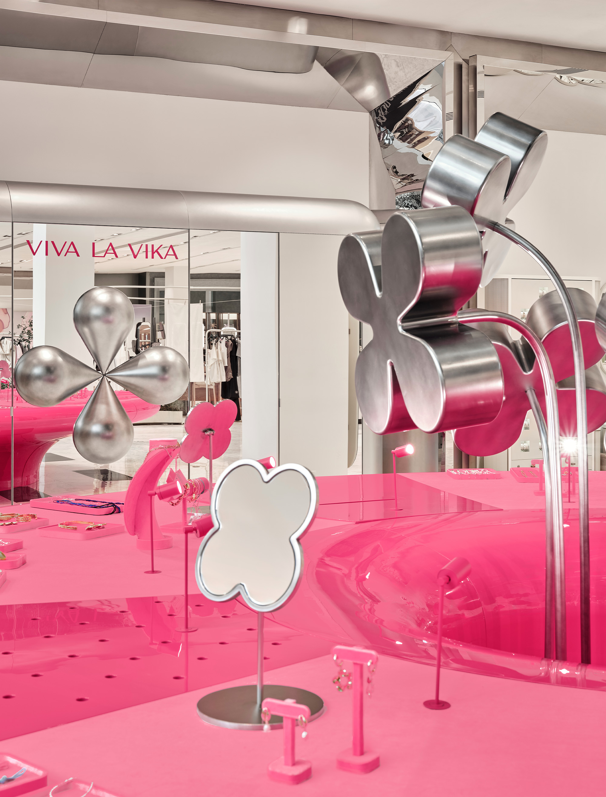 - Viva La Vika в «Цветном» (Москва) – первый корнер бренда в открытом пространстве без привычных стен. Он построен вокруг масштабной метафоры: гигантская цветочная ваза стала не только центром композиции, но и главным вау-эффектом проекта. Цветы, выполненные из стеклопластика с хромированным покрытием, отражают розовый цвет тумбы и создают единый выразительный образ. Мы работали с образом сюрреалистического объекта, вписанного в реальность универмага. Пространство дополняет зеркальный шкаф и дополнительные декоративные элементы с подсветкой. Корнер работает как «всплывающий» в пространстве объект, притягивающий внимание даже на фоне насыщенного окружения. Все элементы – от ваз до светильников – были изготовлены на заказ, что позволило сохранить целостность образа и брендовую эстетику.