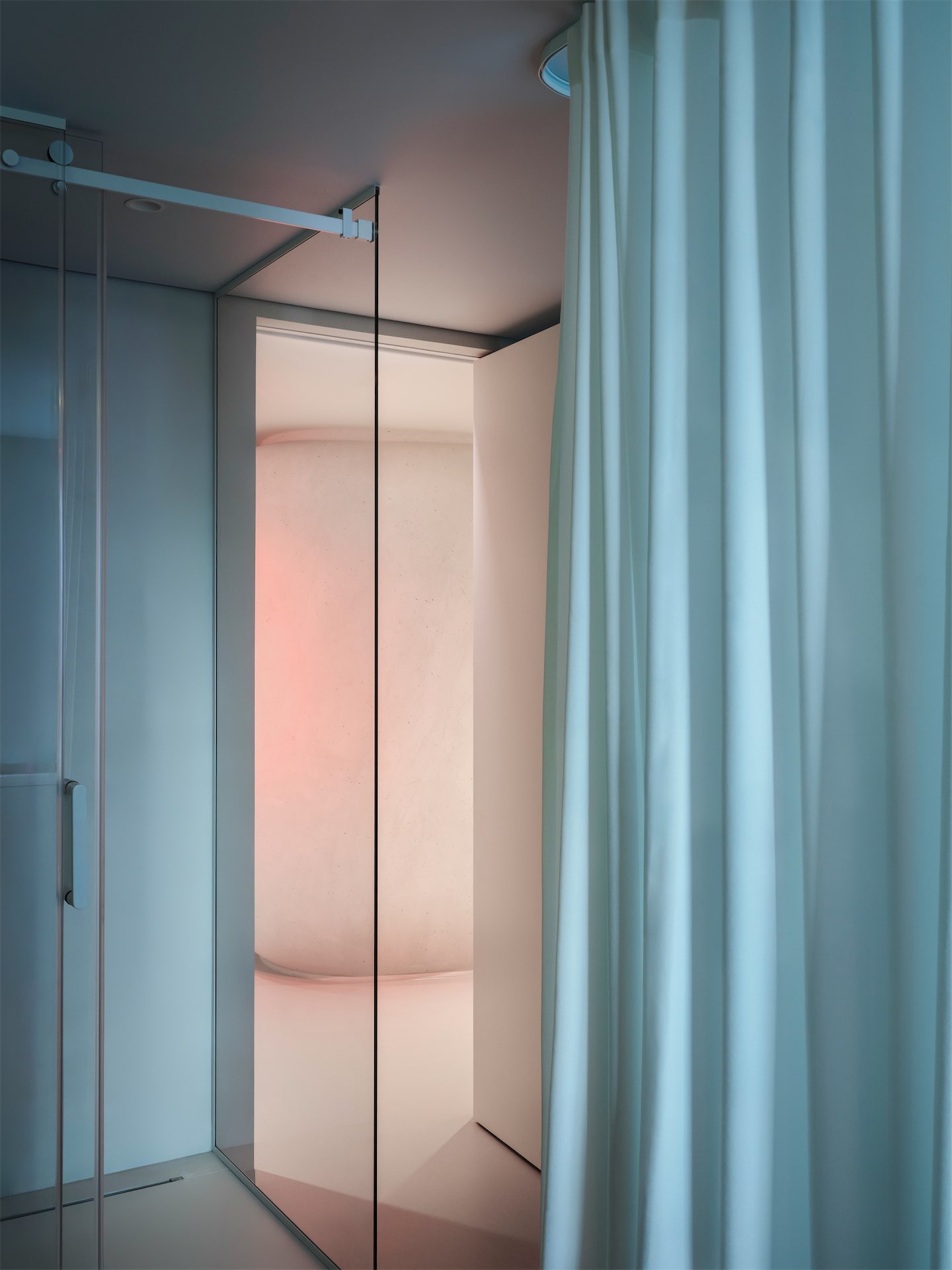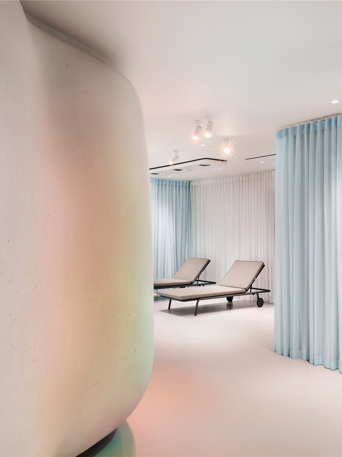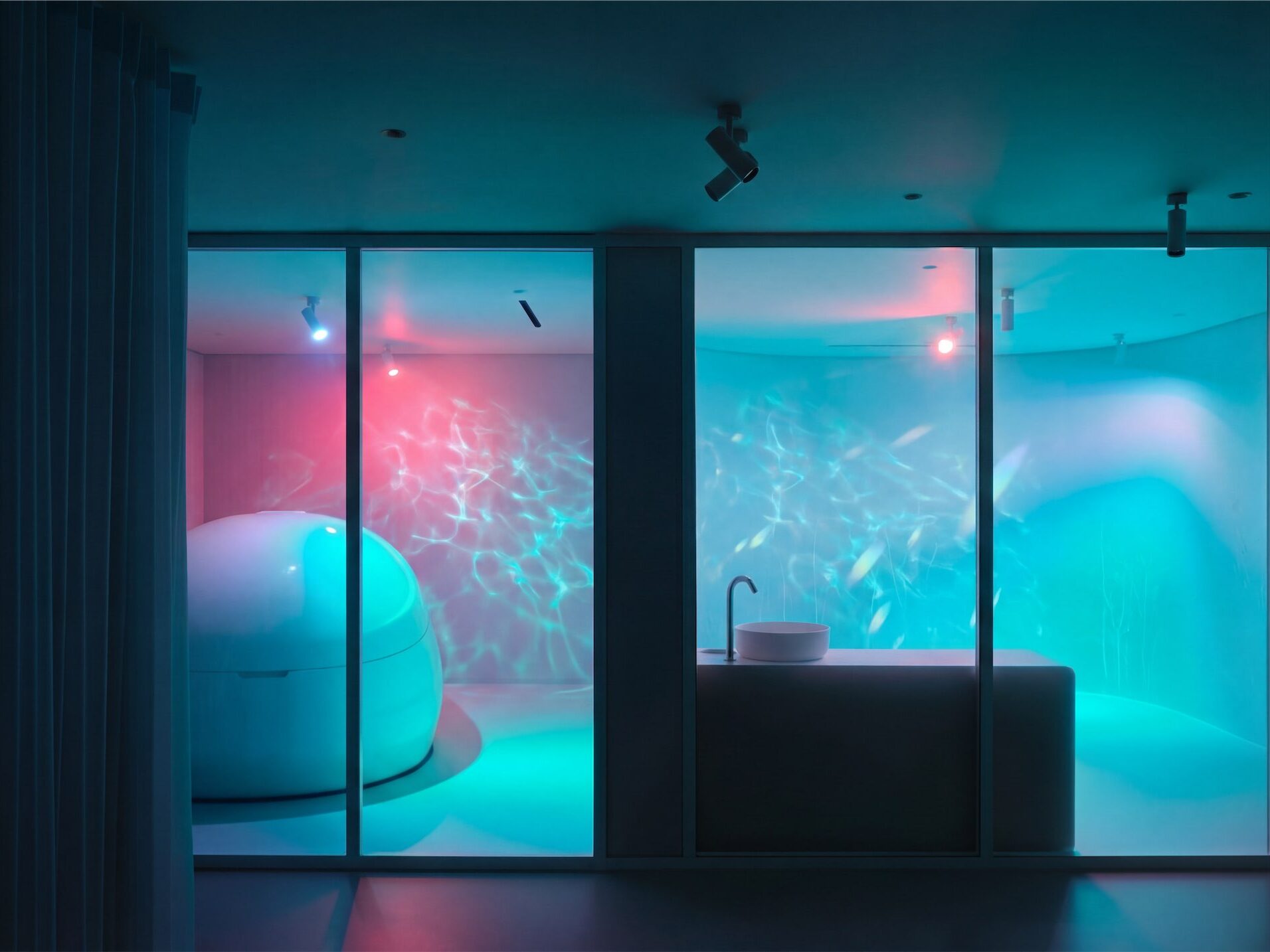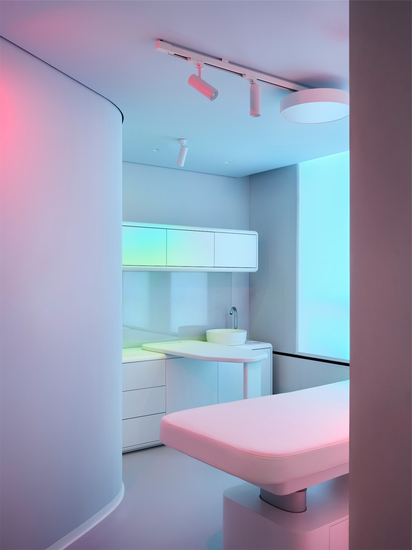 Световой дизайн усиливает ощущение медитативности и настраивает на внутреннюю тишину. Помимо общего технического освещения, архитекторы разработали несколько световых сценариев, которые меняют восприятие пространства и создают разные эмоциональные акценты: где-то появляется эффект каустики от воды, а где-то эффект радуги. Также в интерьер интегрированы работы современных медиа-художников. В зависимости от специфики процедуры нейтральные светлые кабинеты превращаются в тепло-персиковые или сине-голубые.