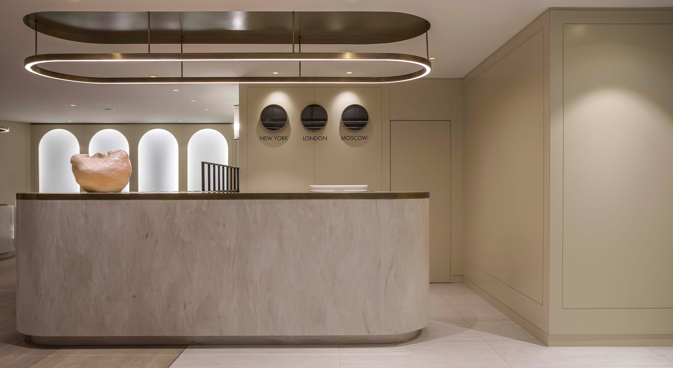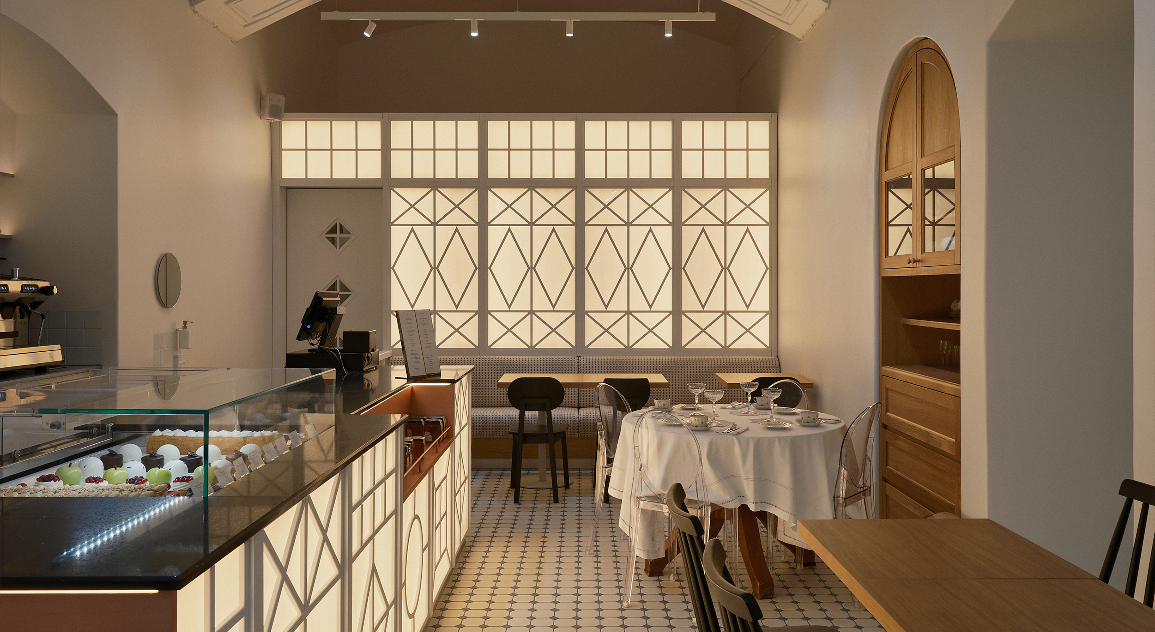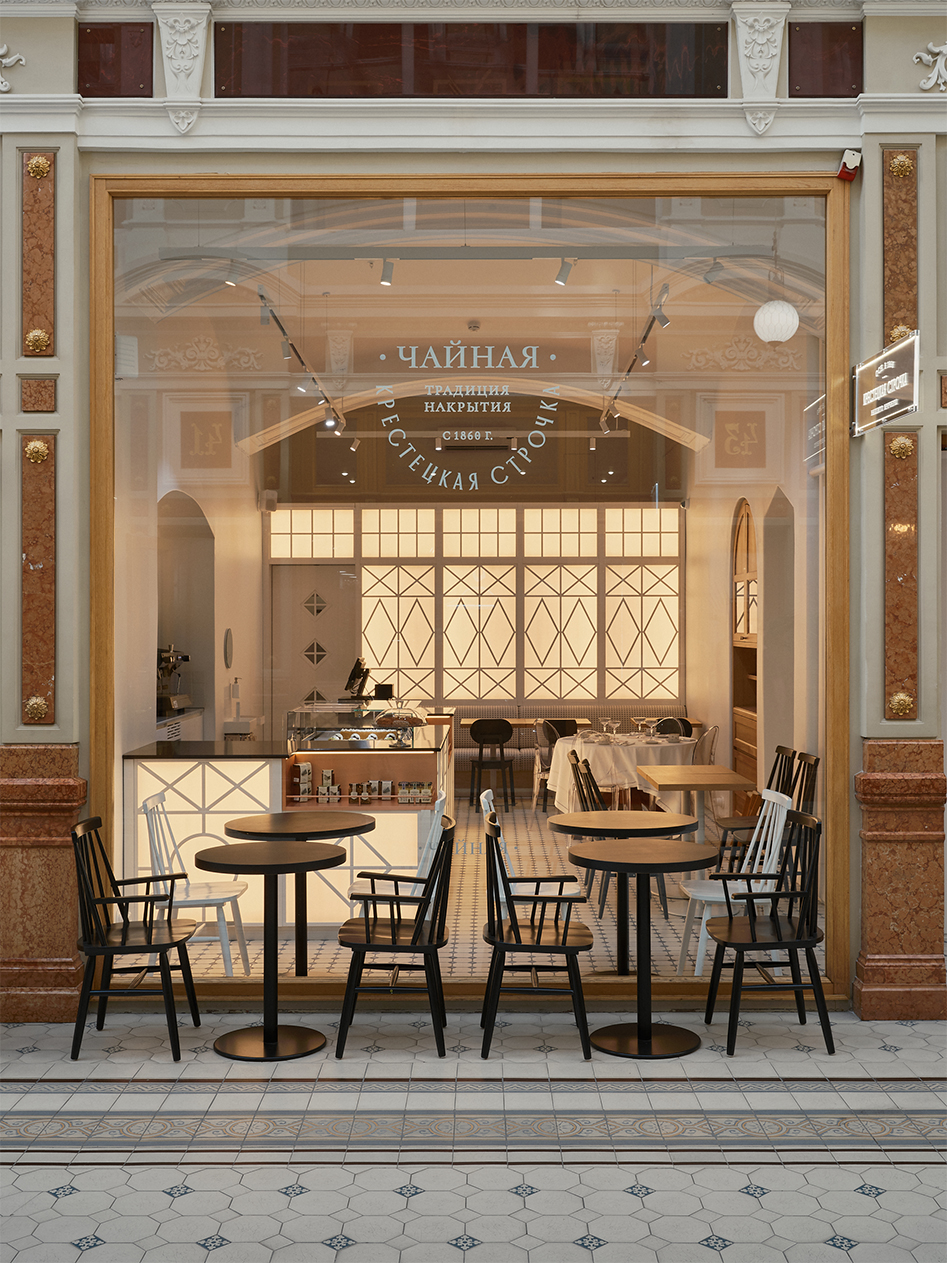 Мы разработали для бренда проект шоурума и чайной. Чайная стала новым направлением «Крестецкой строчки» — она должна была передавать ценности и эстетику бренда. Ключ к интерьеру мы нашли в традиции чаепития на дачной веранде с витражными окнами, однако в интерьере этот образ претерпевает деконструкцию. Например, в технике витражного остекления выполнен скульптурный объем барной стойки. Нам важно не буквальное воспроизведение стилистики, а ее современное переосмысление. Гибкость пространства задают большие лайтбоксы: вечером они создают уютную атмосферу, а днем — более холодный, строгий облик. Еще одна отсылка к традициям — спроектированный нами буфет, знакомый и знаковый элемент домашнего интерьера.
