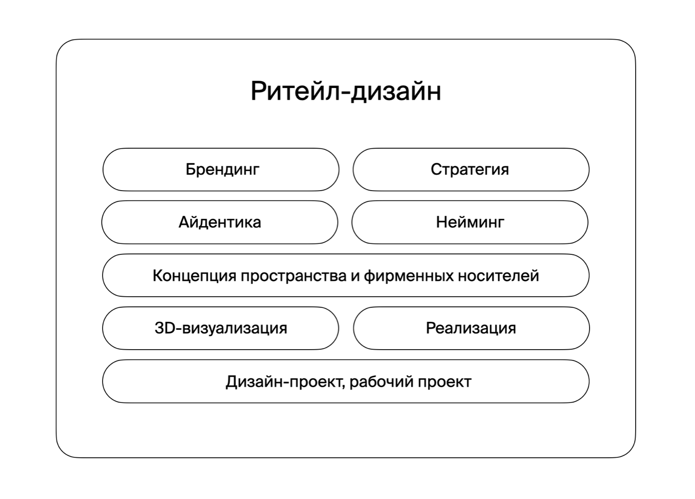 В отличие от классического интерьерного дизайна, ритейл-дизайн подразумевает более долгий процесс. Он не ограничивается созданием просто красивого пространства. Команда агентства включает в себя разных специалистов и гораздо больший функционал: разработка бренд-стратегии и айдентики с нуля или доработка существующей. Команда включает специалистов по стратегии и неймингу, брендингу и айдентике, дизайну и архитектуре, а также менеджеров проектов высокого уровня.