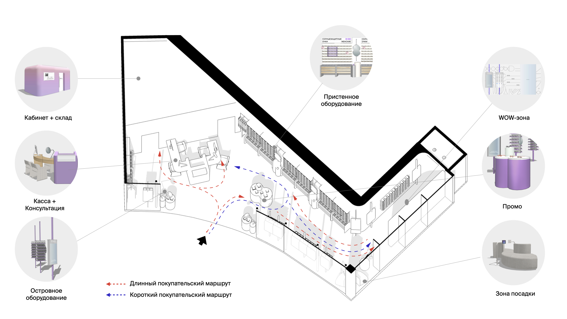 Комплексный подход позволяет создавать не просто интерьеры, а полноценные ритейл-концепции. Они отражают ДНК бренда и работают на улучшение клиентского опыта (CX), фиксируются в многостраничном ритейл-буке. Специалисты агентства анализируют рынок и конкурентов, изучают ассортимент бренда и его целевую аудиторию. Благодаря этому пространство становится инструментом бизнеса – оно привлекает клиентов, удерживает их внимание и способствует росту продаж.