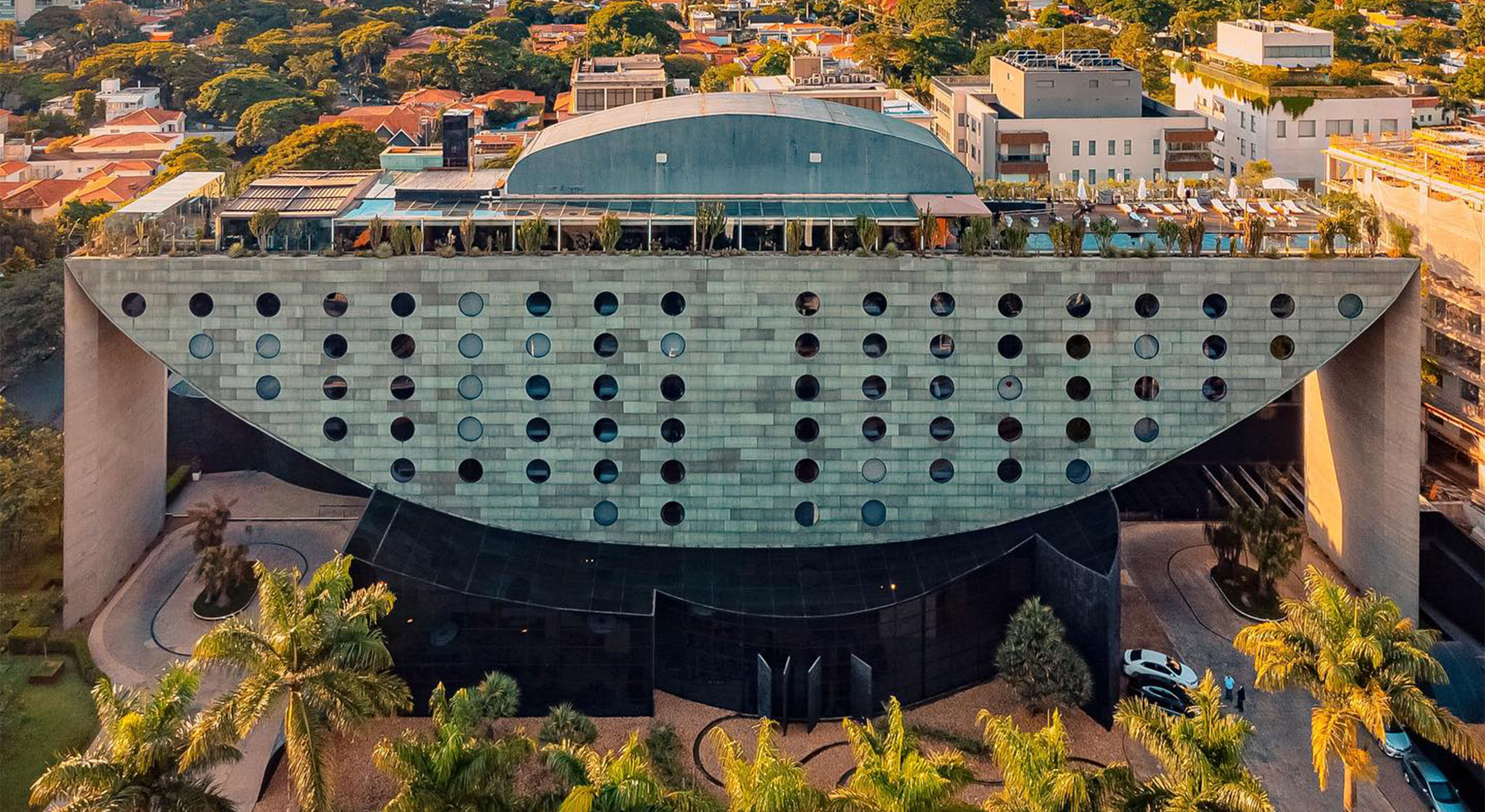 Заказчик отеля сказал архитектору Руй Отакэ, сыну знаменитой художницы Томиэ Отакэ, что хочет построить новую достопримечательность города. Проект полностью ответил на этот вопрос: корабль с круглыми окнами-иллюминаторами диаметром почти в 2 метра выделяется даже среди выразительной архитектуры Сан-Паулу. 25-метровая стена поддерживает ковчег, образуя вывернутую наизнанку арку: обрамленная пустота между ними — одна из самых интересных деталей комплекса. Ну и красный бассейн, конечно, тоже. Возможно вы пересмотрите свое отношение к постмодернизму!