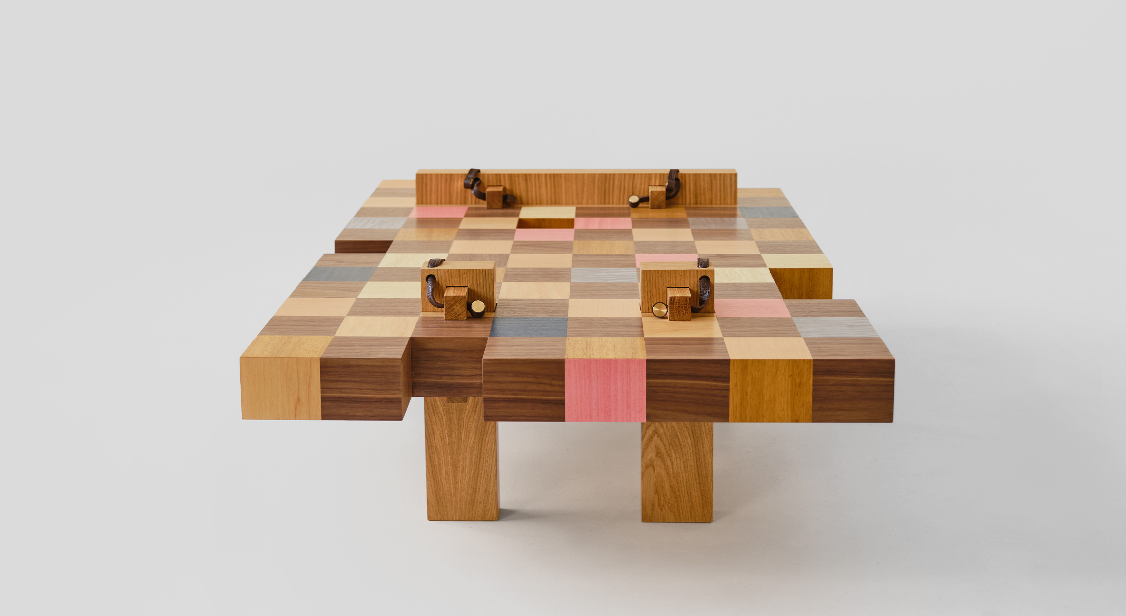 В столе для ARCHIPÉLAGO объединились рациональные принципы модернистской школы архитектуры Сан-Паулу и моя любовь к ремесленным техникам. Это своего рода возвращение к истокам, попытка отбросить все лишнее. «Плетение» стола выполнено из дерева — материала первичного и общего для многих культур. Перекрестия «нитей» столешницы выделены разноцветным шпоном. Шахматный рисунок — отсылка к сетке —прерывают ножки подстолья, зафиксированные кожаными ремешками, традиционным видом крепления для бразильской мебели. Эта сбивка узора вместе с запрограммированными пустотами превращает предмет в головоломку, которую не терпится разгадать».