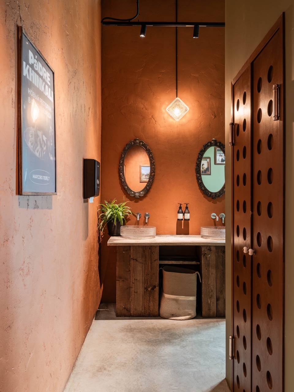Глина, камень, натуральное дерево и текстиль используются так, чтобы каждая поверхность была теплой, «живой» и визуально насыщенной. Металлические детали и кованые элементы вместе с мотивами этнических узоров ковров и настенных вертикальных панелей добавляют необходимые акценты. Узнаваемые образы картин Нико Пиросмани призваны усилить грузинско-итальянский тандем. Среди деталей — сочетание современного минимализма с элементами ручной работы. Теплое освещение мягко подчеркивает фактуры материалов и зонирует пространство зала.