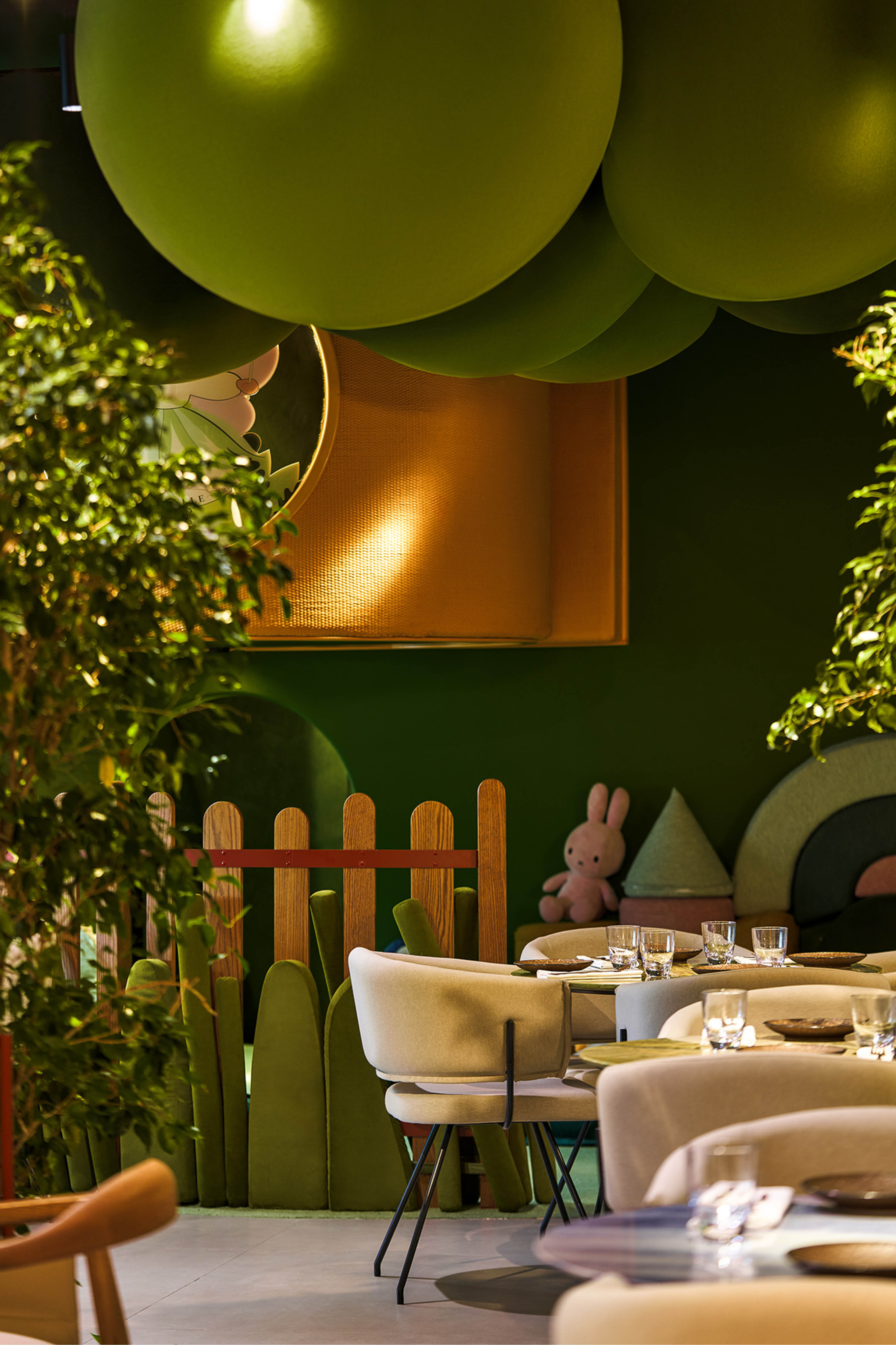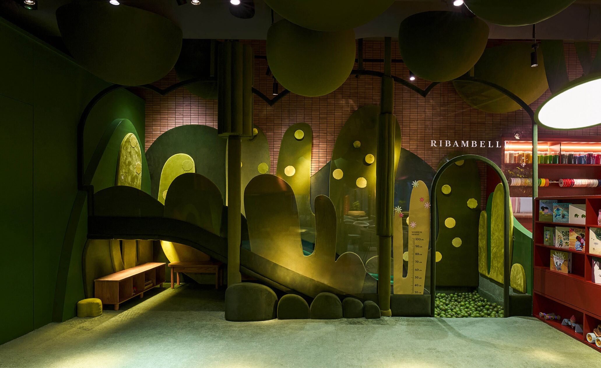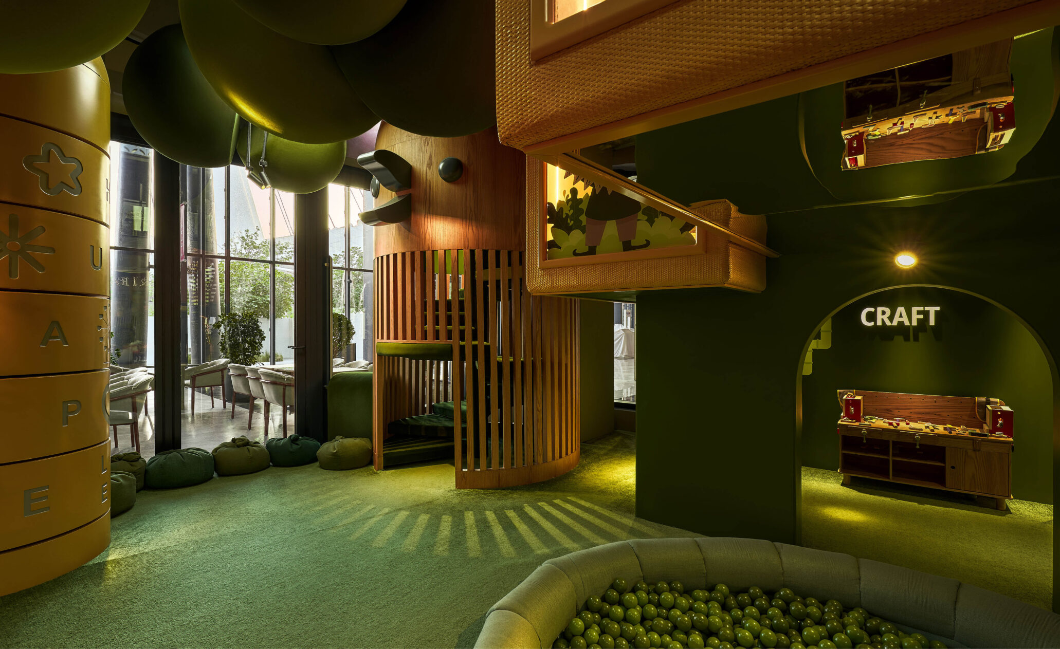Первый этаж посвящен миру детских фантазий: 70% площади занимают игровые зоны, кулинарные мастер-классы и пространство для творчества. Мы хотели, чтобы дети чувствовали себя как в парке мечты или таинственном саду среди плюшевых деревьев, грибов, травинок. Футуристичная детская площадка представляет собой домик на дереве с зеленой кроной. Ее пространство заполнили сказочные птицы, которых можно заметить в оформлении винтовой лестницы и в зонах квестов. Вверх тянутся бутоны разноцветных огромных цветков, а с потолка свисают гигантские зеленые шары-листья. Световые и звуковые эффекты дополняют сказочные образы Ribambelle.