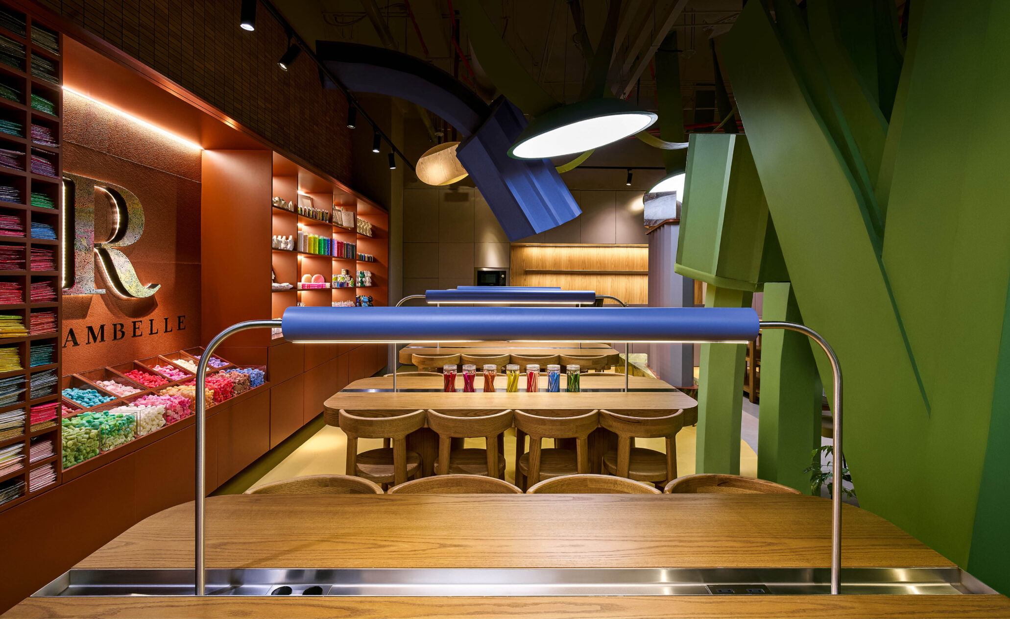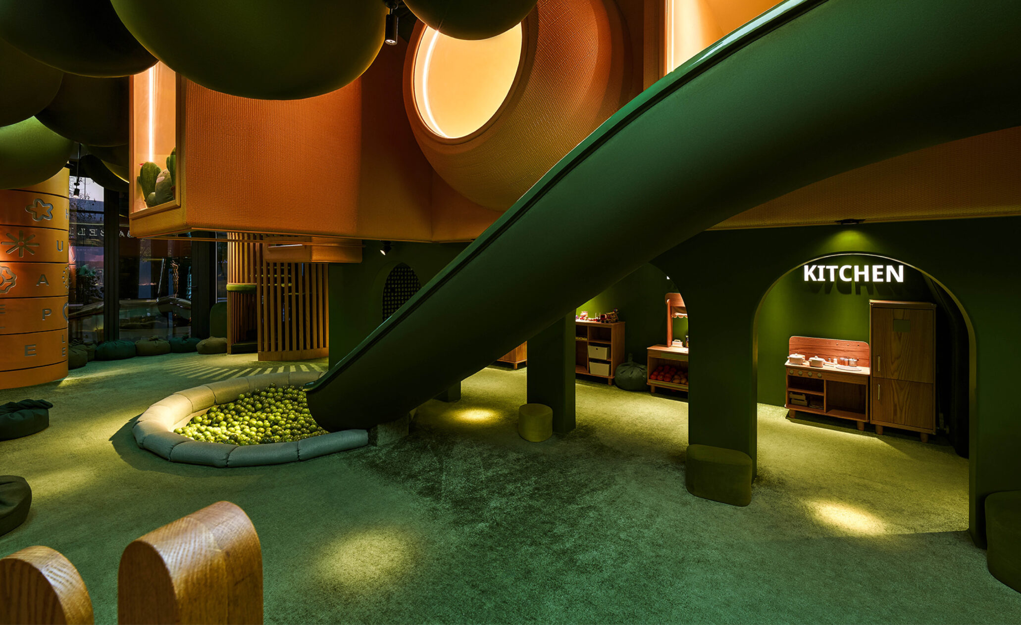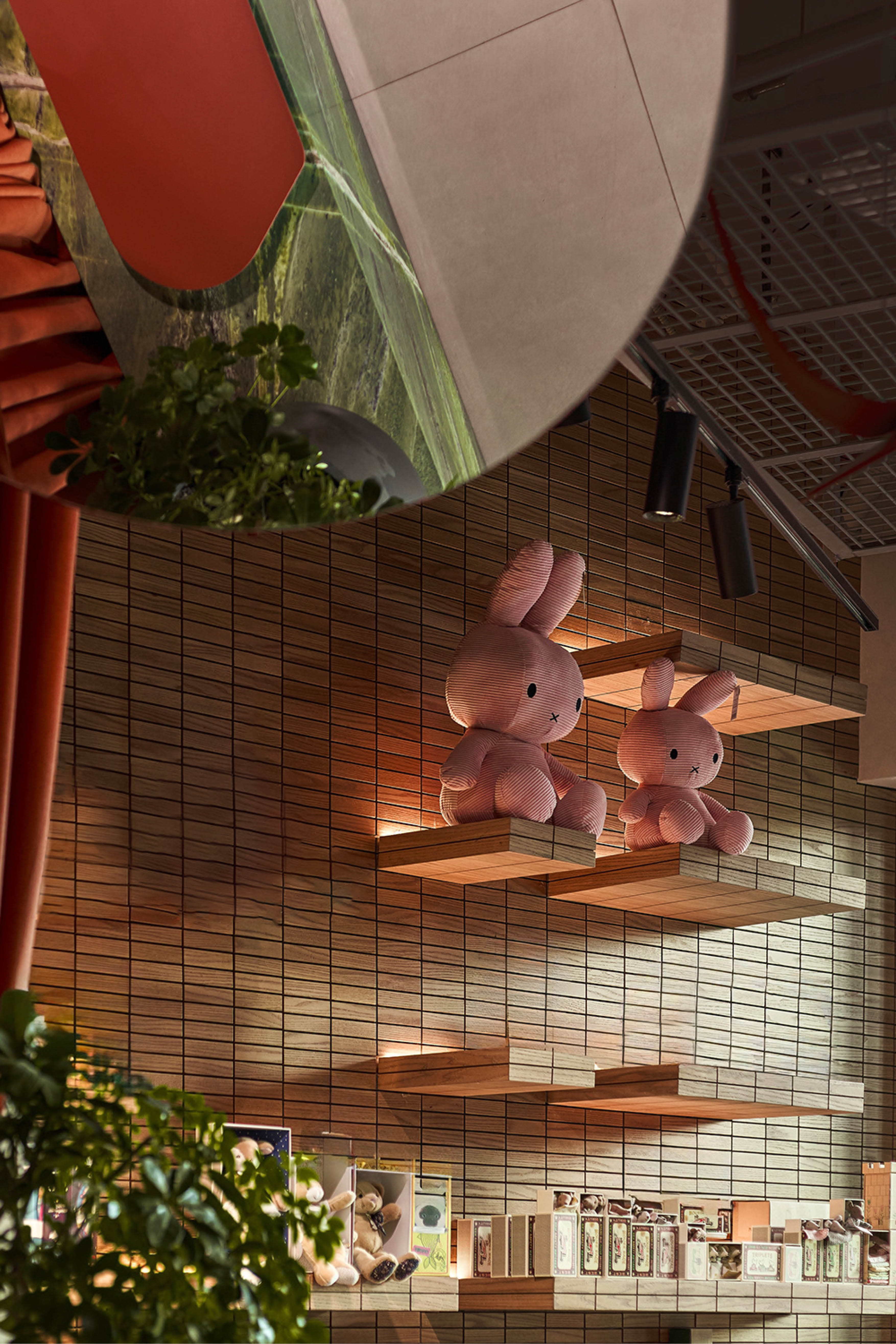 Первый этаж посвящен миру детских фантазий: 70% площади занимают игровые зоны, кулинарные мастер-классы и пространство для творчества. Мы хотели, чтобы дети чувствовали себя как в парке мечты или таинственном саду среди плюшевых деревьев, грибов, травинок. Футуристичная детская площадка представляет собой домик на дереве с зеленой кроной. Ее пространство заполнили сказочные птицы, которых можно заметить в оформлении винтовой лестницы и в зонах квестов. Вверх тянутся бутоны разноцветных огромных цветков, а с потолка свисают гигантские зеленые шары-листья. Световые и звуковые эффекты дополняют сказочные образы Ribambelle.