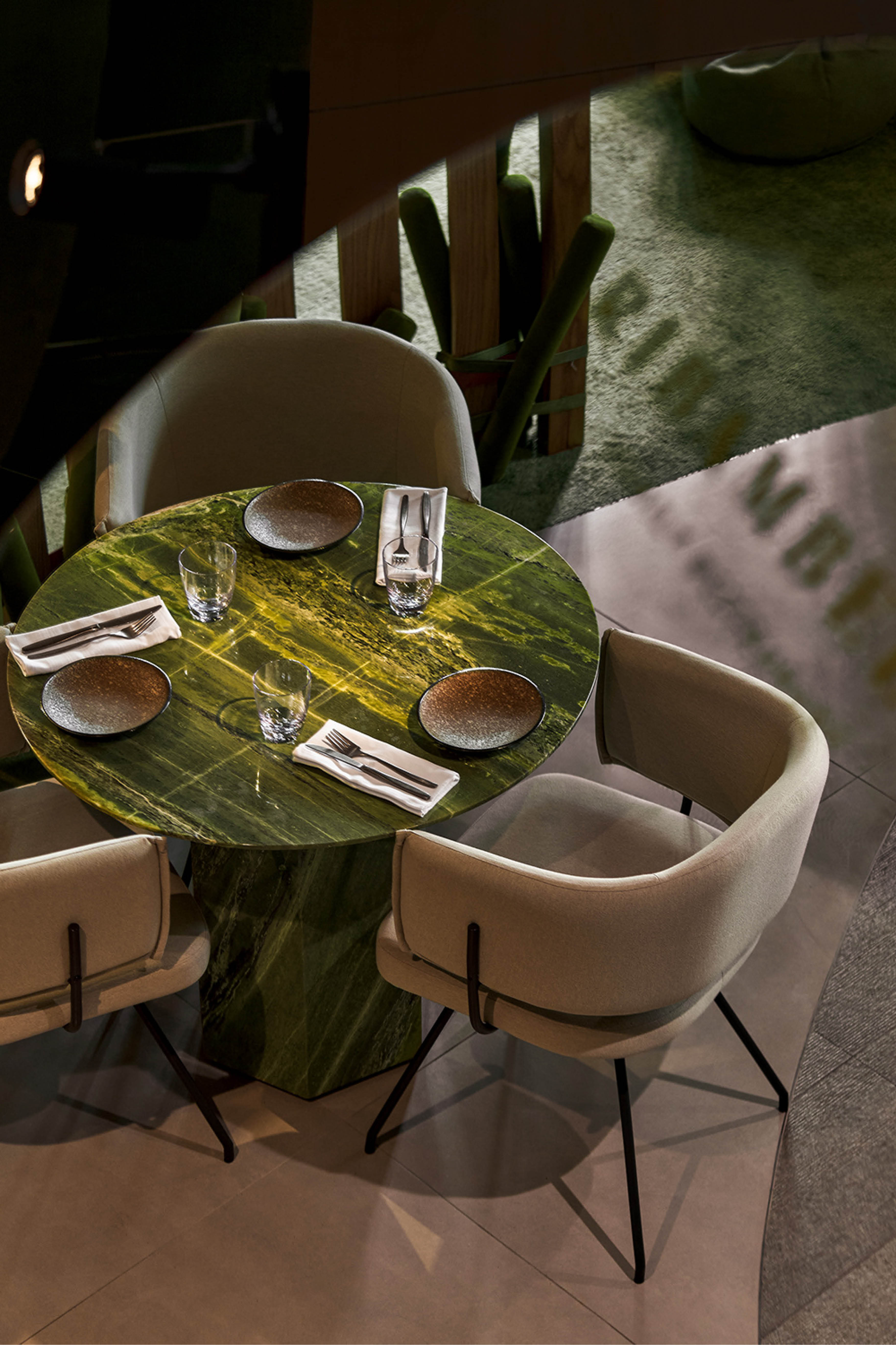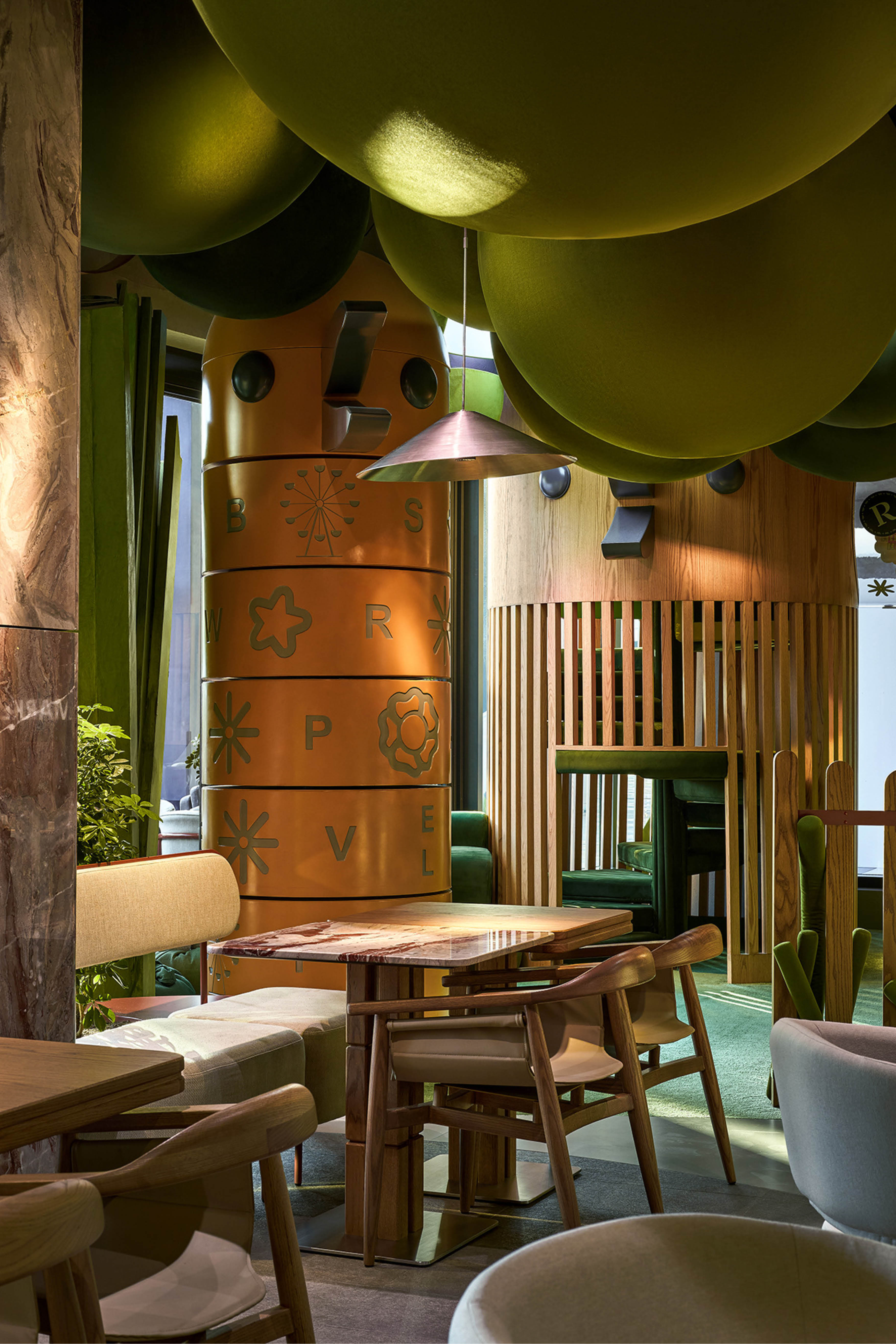 На втором этаже располагается остальная часть ресторана, бар и залы для мероприятий. Зона ресторана выдержана в теплых природных тонах и оформлена живыми растениями. Образ оазиса поддерживают свисающие лианы-светильники, а отражения от многочисленных зеркал, установленных под потолком, создают эффект солнечных лучей, проходящих сквозь листву. Интерьер сохраняет баланс между игривостью и элегантностью.