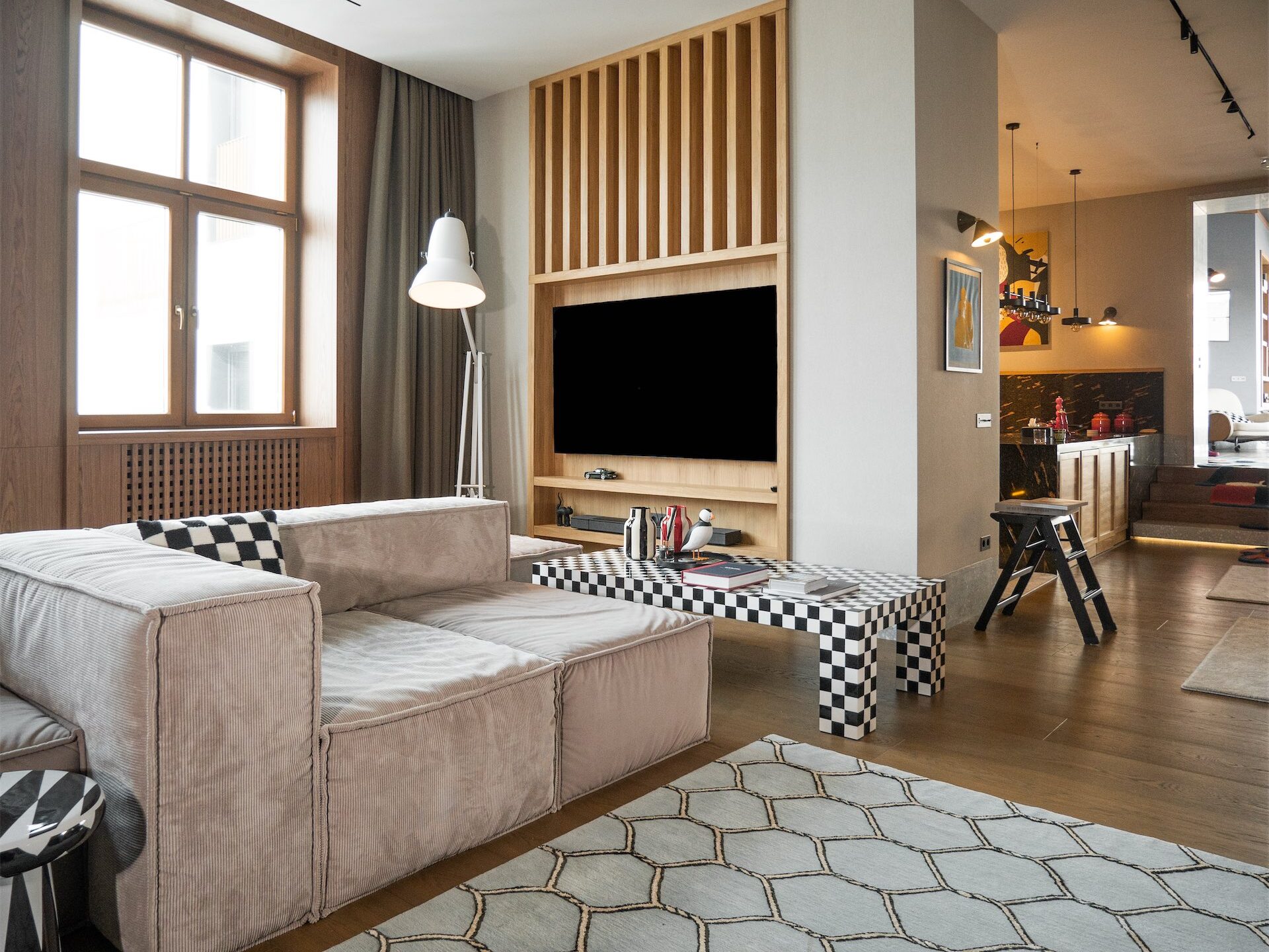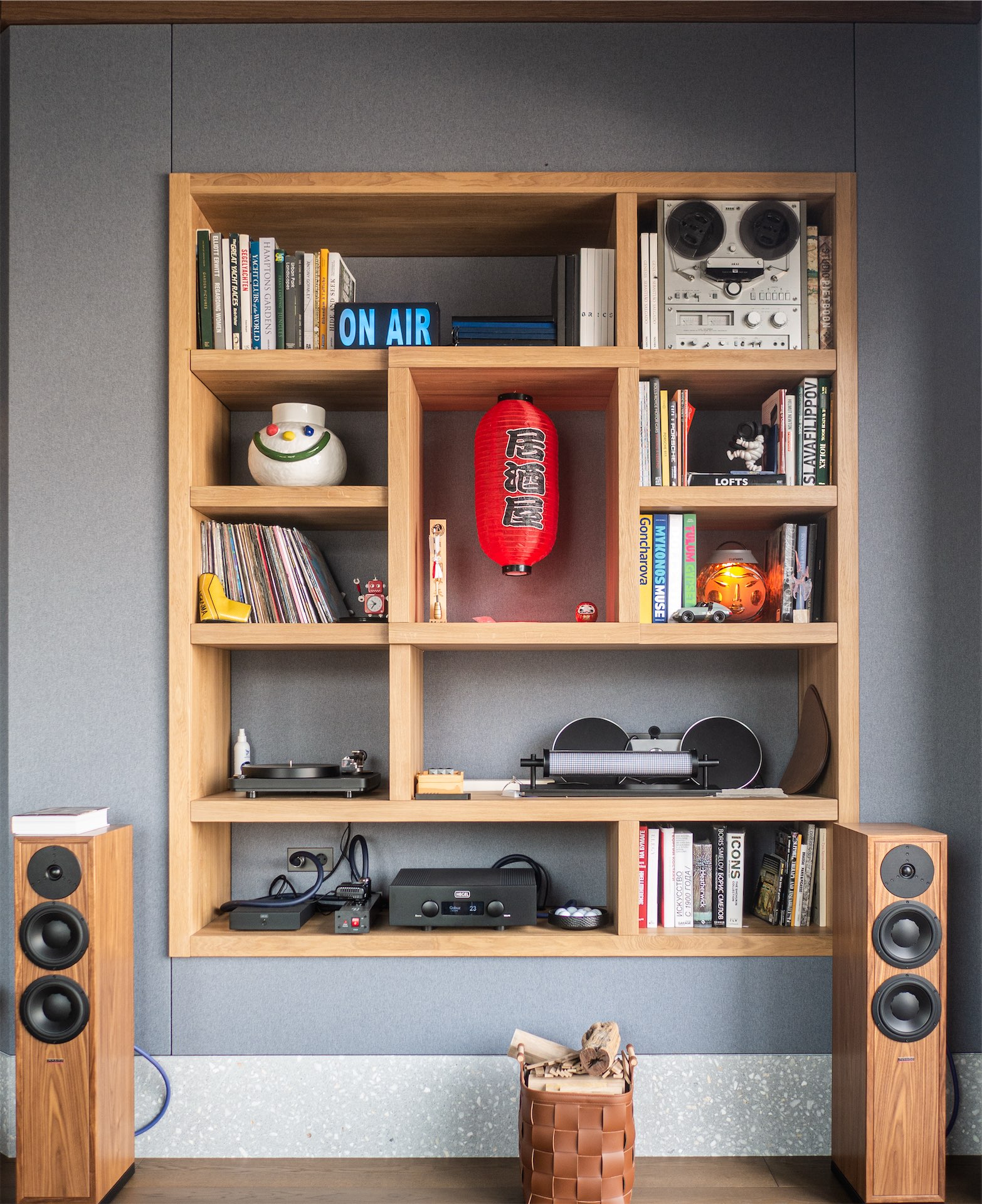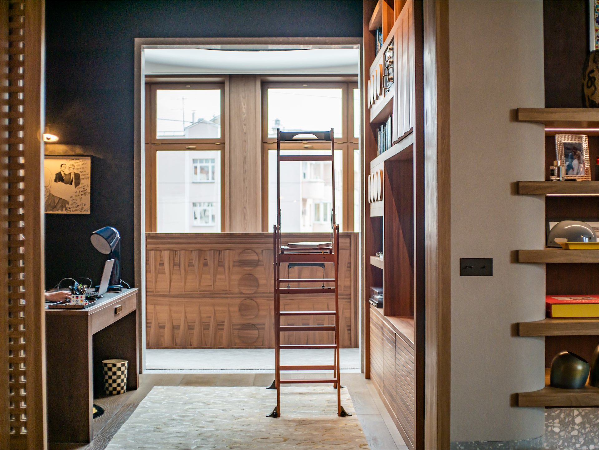 Особое внимание уделено системам хранения: высокие стеллажи почти под потолок, подоконники, переходящие в ящики, скрытые шкафы. Пространство визуально остается чистым, несмотря на обилие книг, предметов дизайна и винтажной техники.