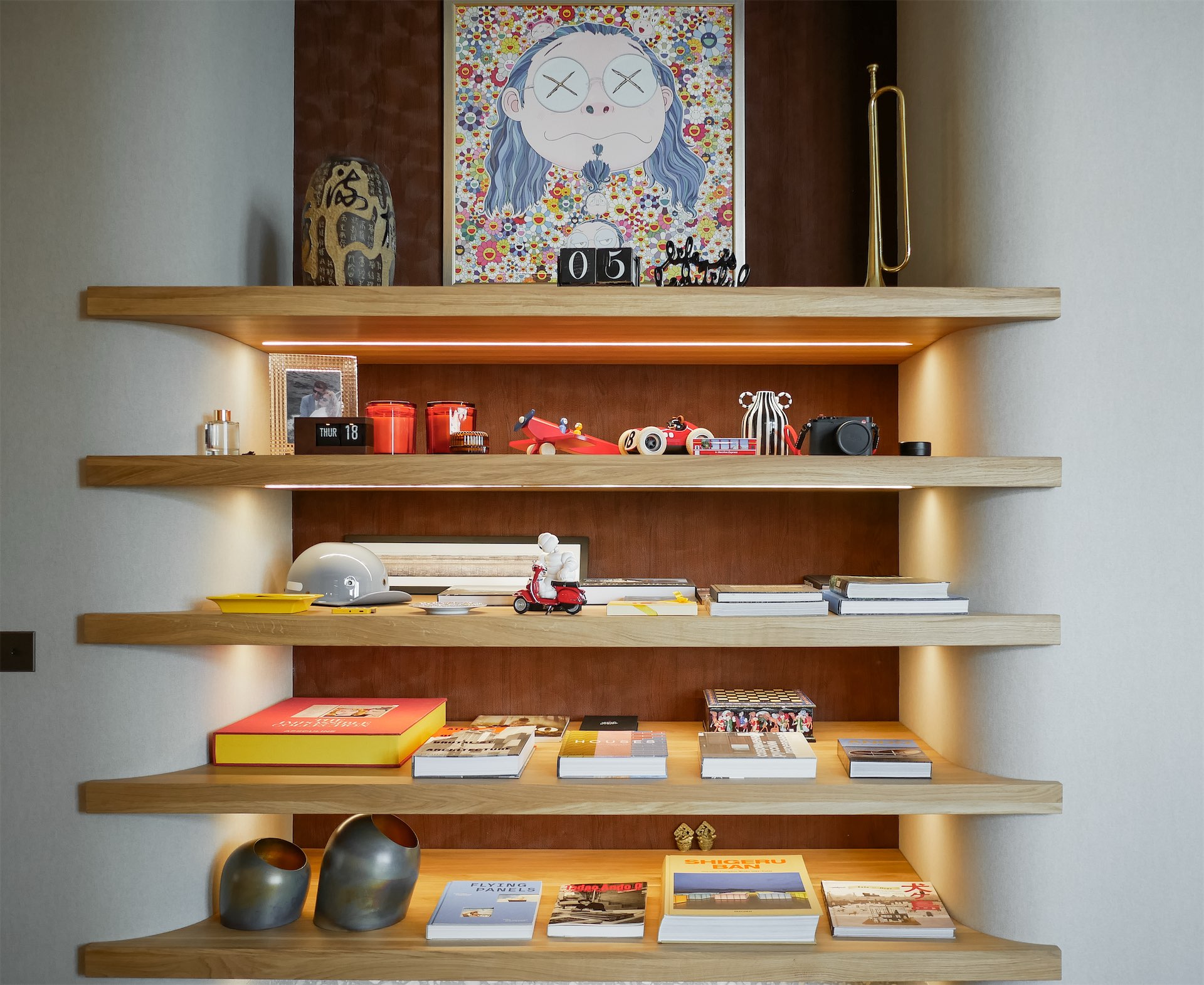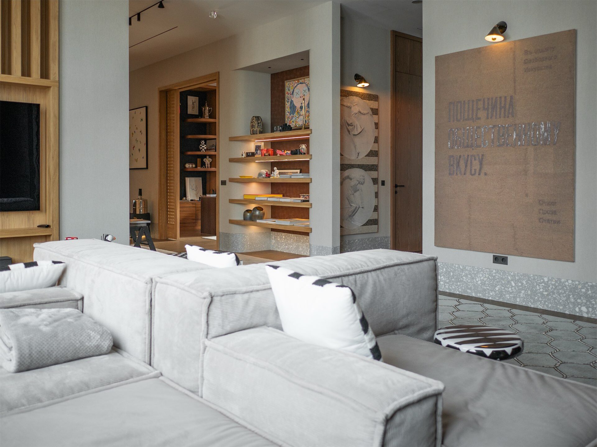 Коллекция современного искусства, которую супруги собирают много лет, не была «вписана» в готовый интерьер — напротив, стены и свет изначально проектировались под конкретные работы. Работы художников — от Ольги Солдатовой до Вовы Перкина — здесь не украшают пространство, а структурируют его.