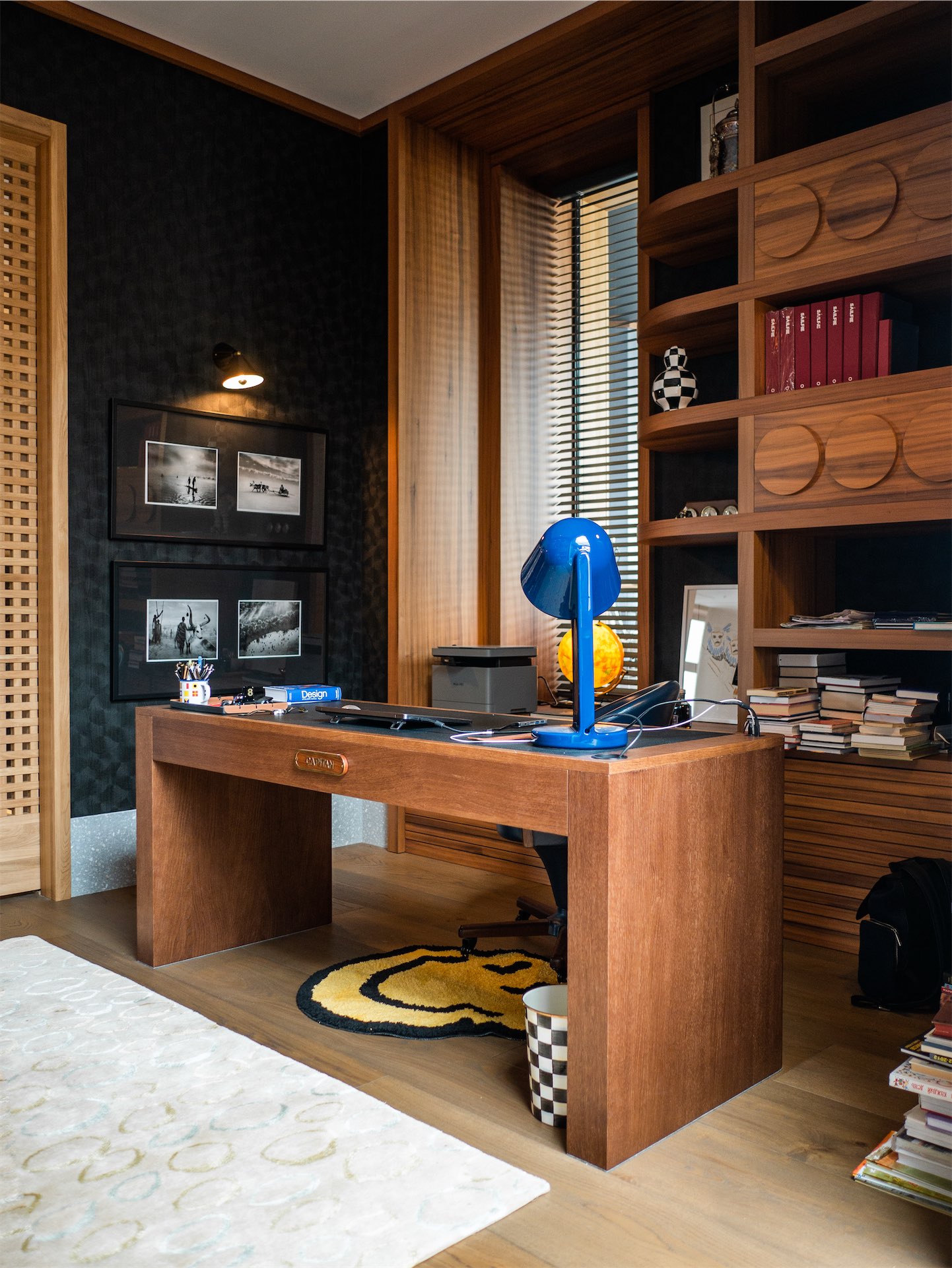 Границу между общественной и приватной частью (кабинет, библиотека, системы хранения и спальня) обозначает подвижная ширма площадью шесть квадратных метров и весом 150 килограммов. Это инженерный объект с индивидуально разработанной системой направляющих.