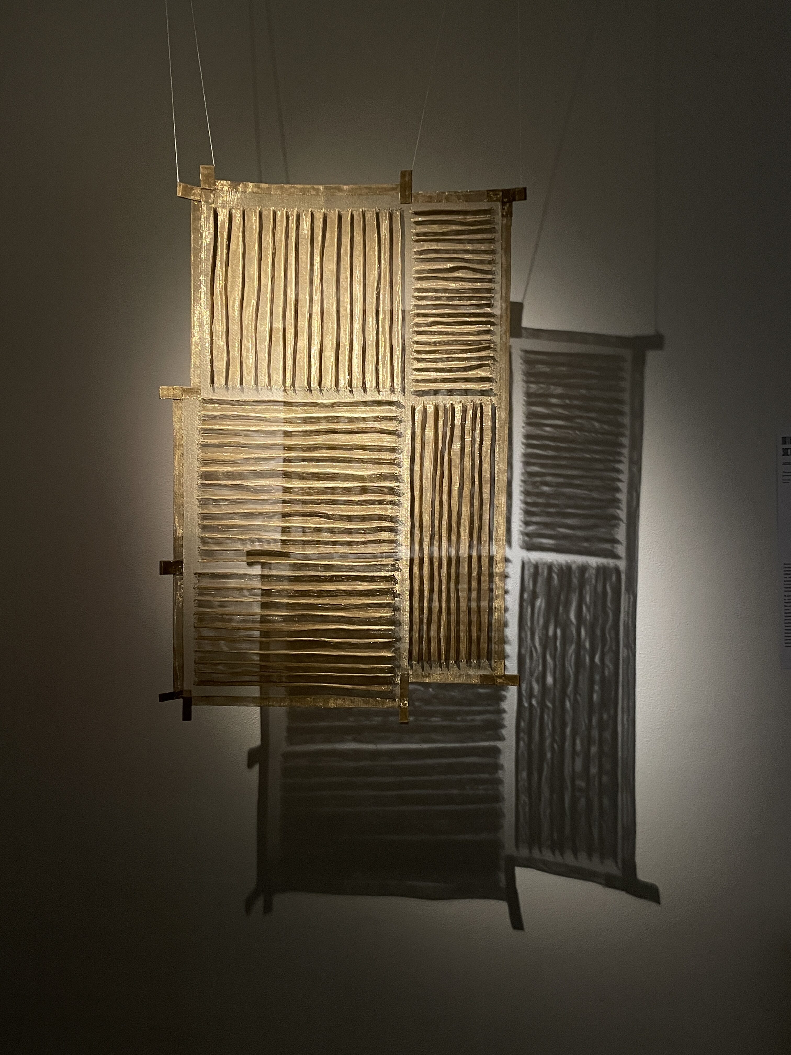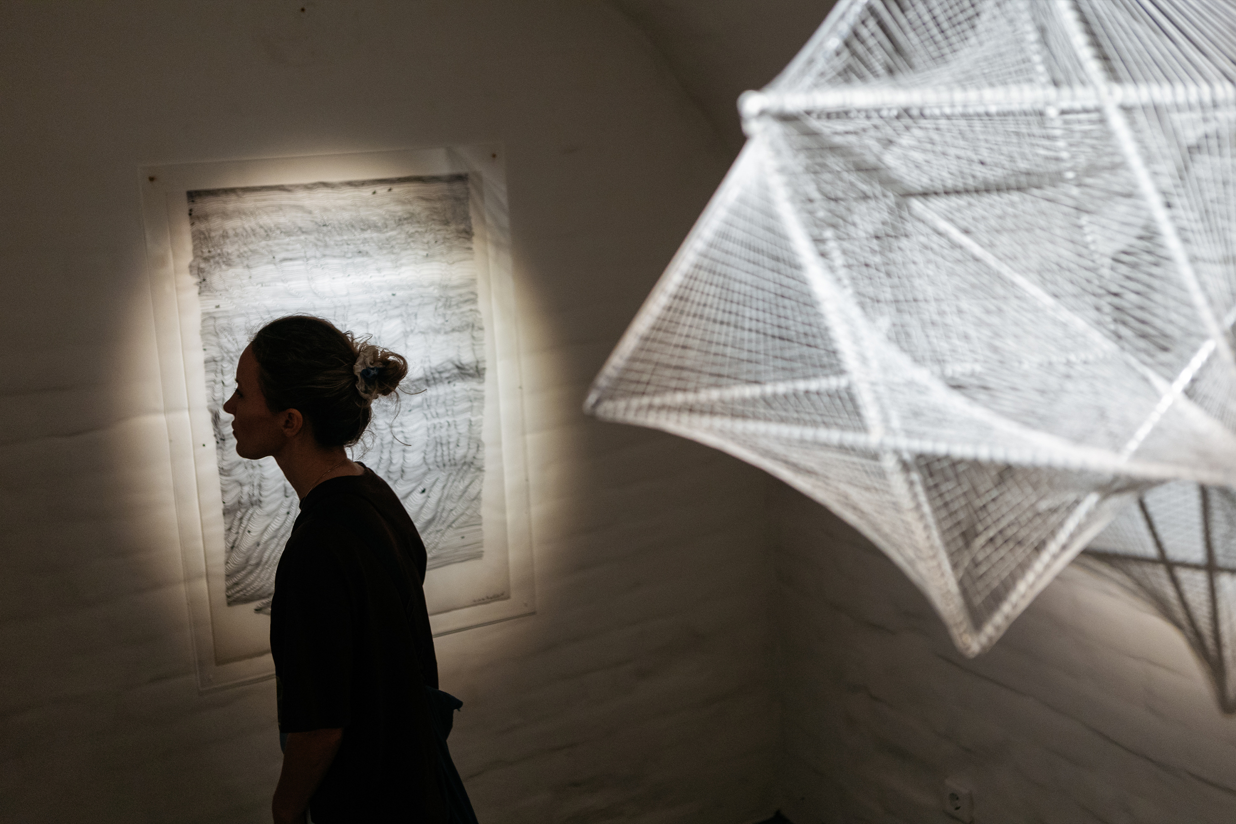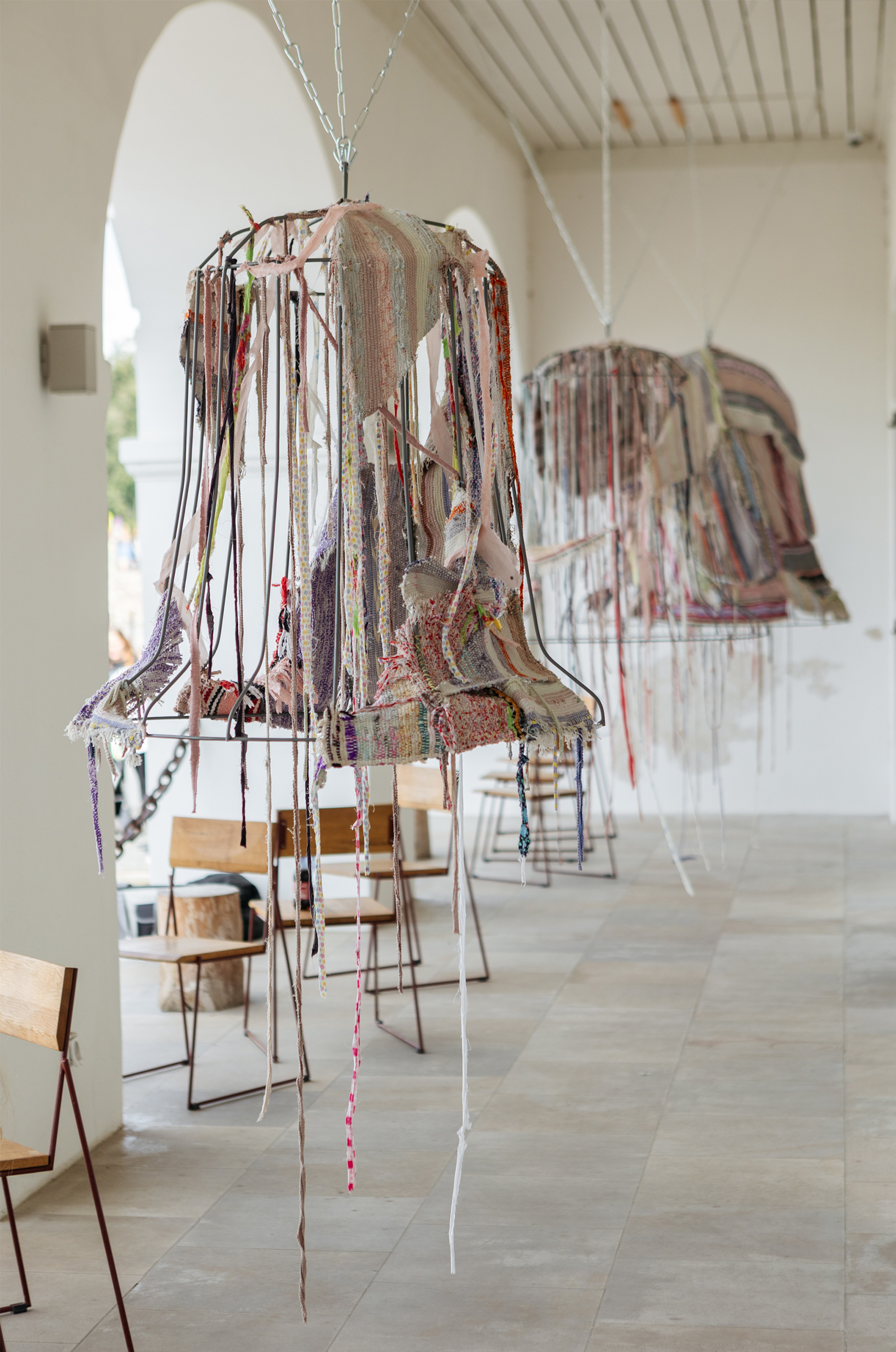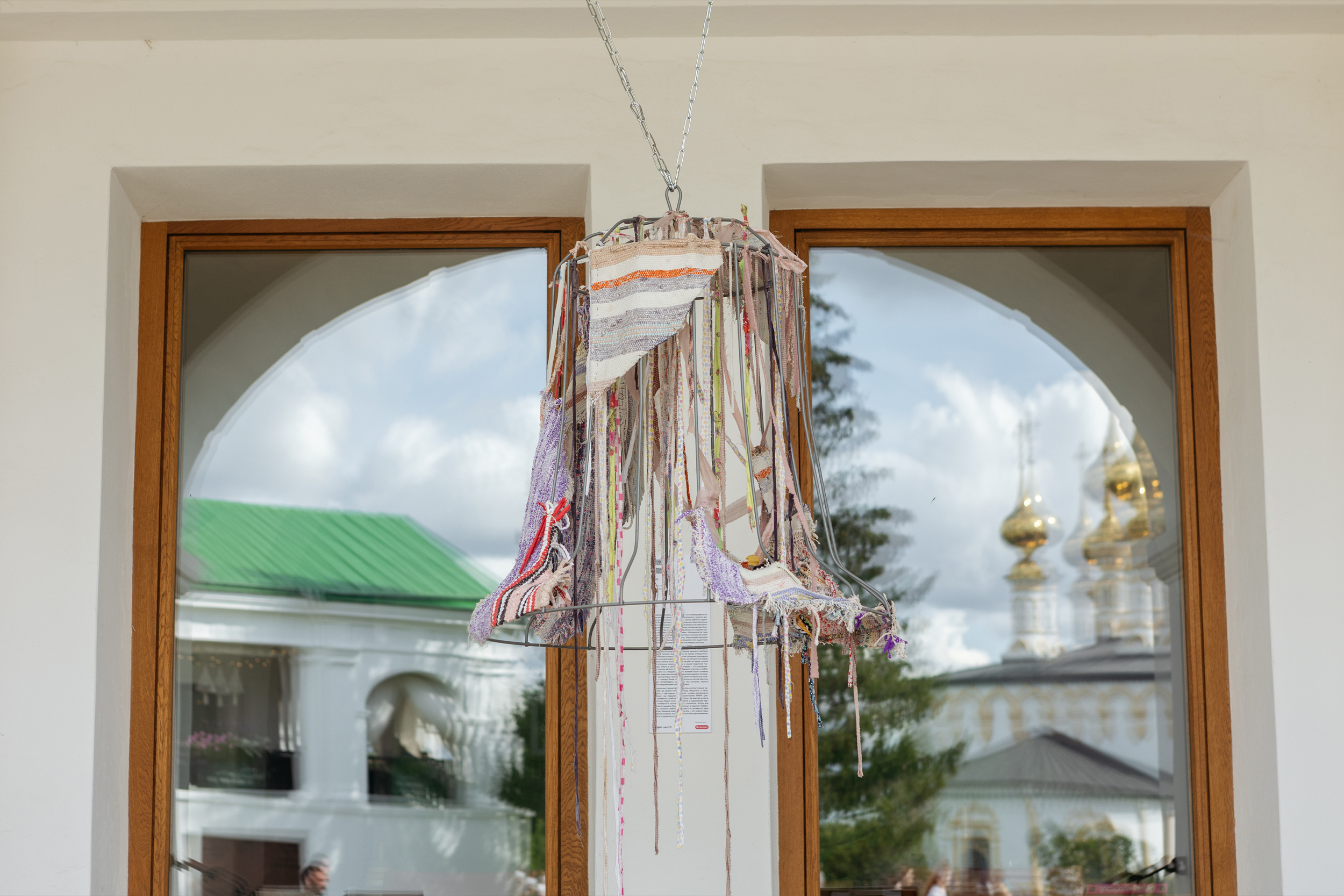В выставке участвуют работы, созданные в рамках опен-колла резиденции МИРА сообщества в Кидекше: в этом году ее посвятили ткачеству. Объекты Анны Гросицкой и Анны Червонны были сделаны специально для выставки и вдохновлены красотами этих мест. Работа «Тихий колокол» Анны Гросицкой родилась из противостояния оглушительной тишины зимнего пейзажа средней полосы и не менее оглушительного звона колоколов. Два этих полярных ощущения стали основой инсталляции: текстиль, из которого сотканы колокола, не издает ни звука, но все многоголосие сосредоточено в самой практике ткачества. «Нити в домотканых коврах — это разорванные полосы ветхого белья, бывших платьев и рубах. Эти нити со следами чьих-то жизней были сотканы в такие знакомые всем деревенские коврики-половики — молчаливые хранители чужих историй под ногами», — говорит Анна. Так, под куполом из нитей зритель может попробовать услышать эти истории, самого себя и окружающее пространство.