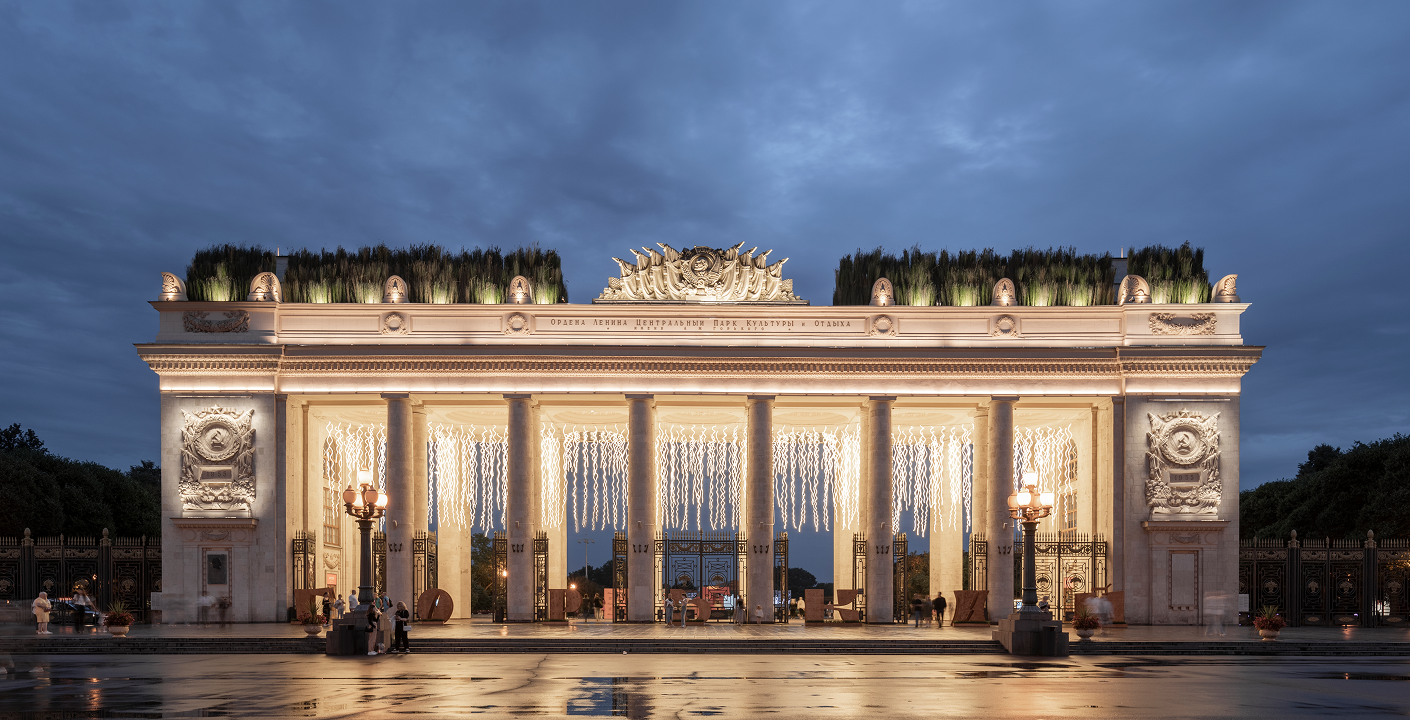 Еще одним проектом, в котором были применены принципы проектирования сакральных пространств, стала инсталляция «Время вперёд» в Парке Горького, появившаяся на арке главного входа. Здесь были заложены идеи триединства прошлого, настоящего и будущего, объединённые в один торжественный образ, родственный Парку Горького. За связь с прошлым в арт-объекте, почти столетней истории места и расположенной здесь ранее Всесоюзной сельскохозяйственной выставке, отвечал каскад из 550 снопов луговых трав, воздвигнутые на кровле арки. Настоящее воплотилось в единственном постоянном элементе инсталляции — самой арке в стиле советской неоклассики. Будущее символизировала световая инсталляция под сводами арки — неоновые «завитки», похожие на и корни, и вместе с тем на нейронные сети, которые всё глубже проникают в нашу повседневность. Таким образом, мы стремились создать образ, в котором время проходит через арку, соединяя ценность ее прошлого, постоянство настоящего и движется вперед в самое лучшее из возможного будущего.