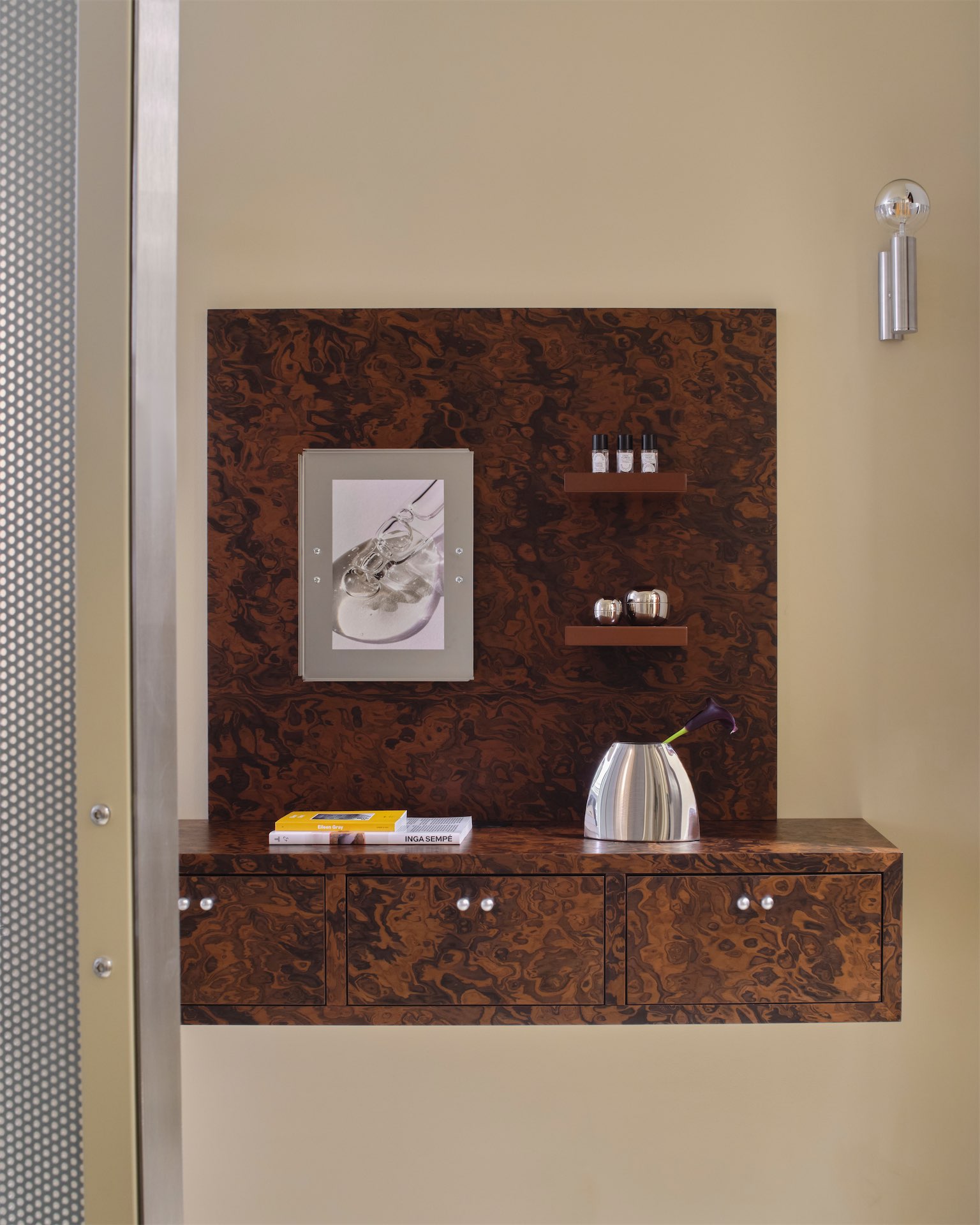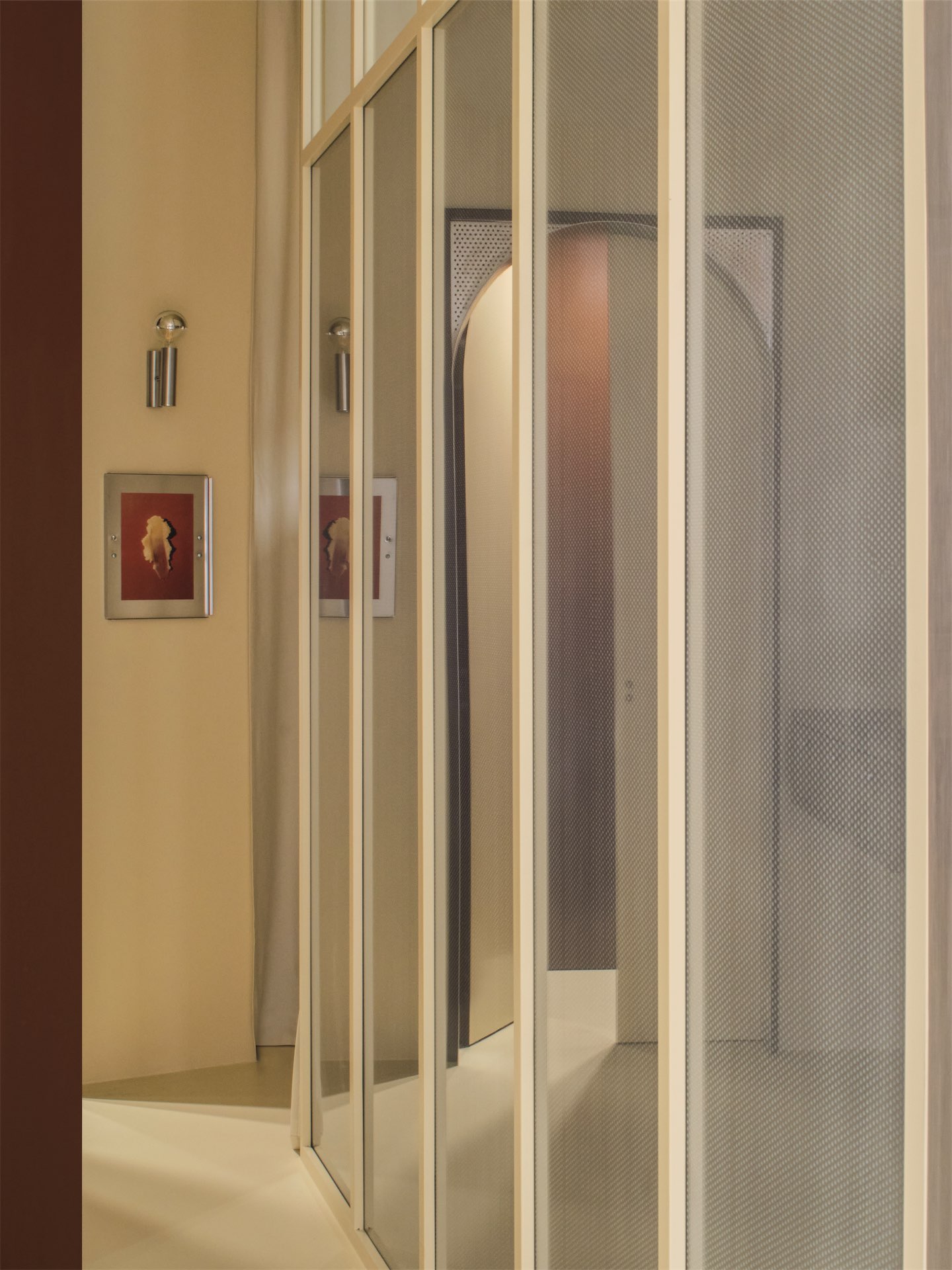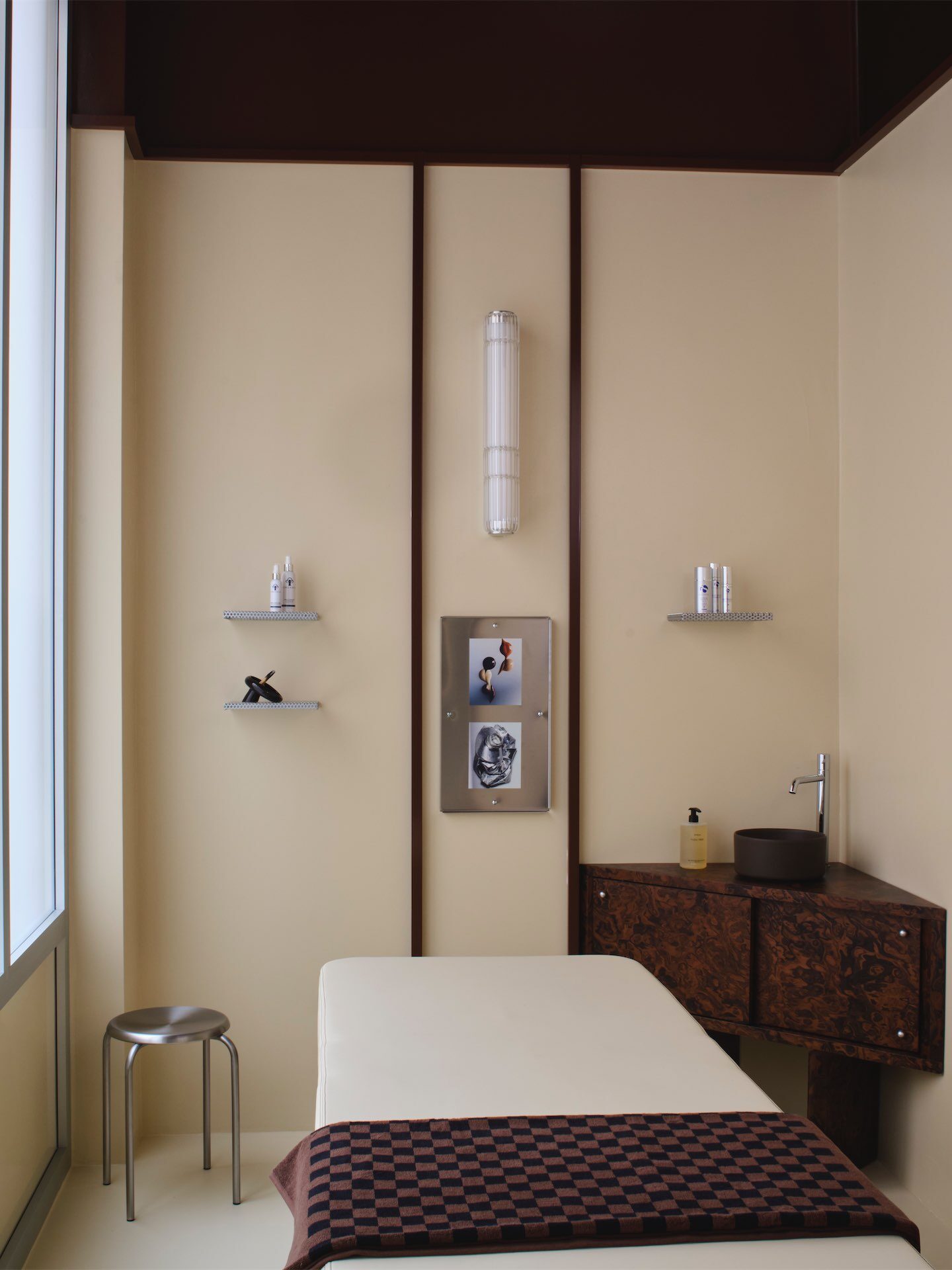 Центральным элементом интерьера становится наклонный куб из металла и стекла — процедурная кабина, которая одновременно организует планировку, разделяя пространство на входную зону, ресепшен и блок кабинетов для уходовых процедур. В проекте читается характерный для бюро подход: минималистичная геометрия сочетается с тактильностью поверхностей и мягкой цветовой гаммой оттенков ванили и шоколада, создавая атмосферу уединенности и спокойствия.