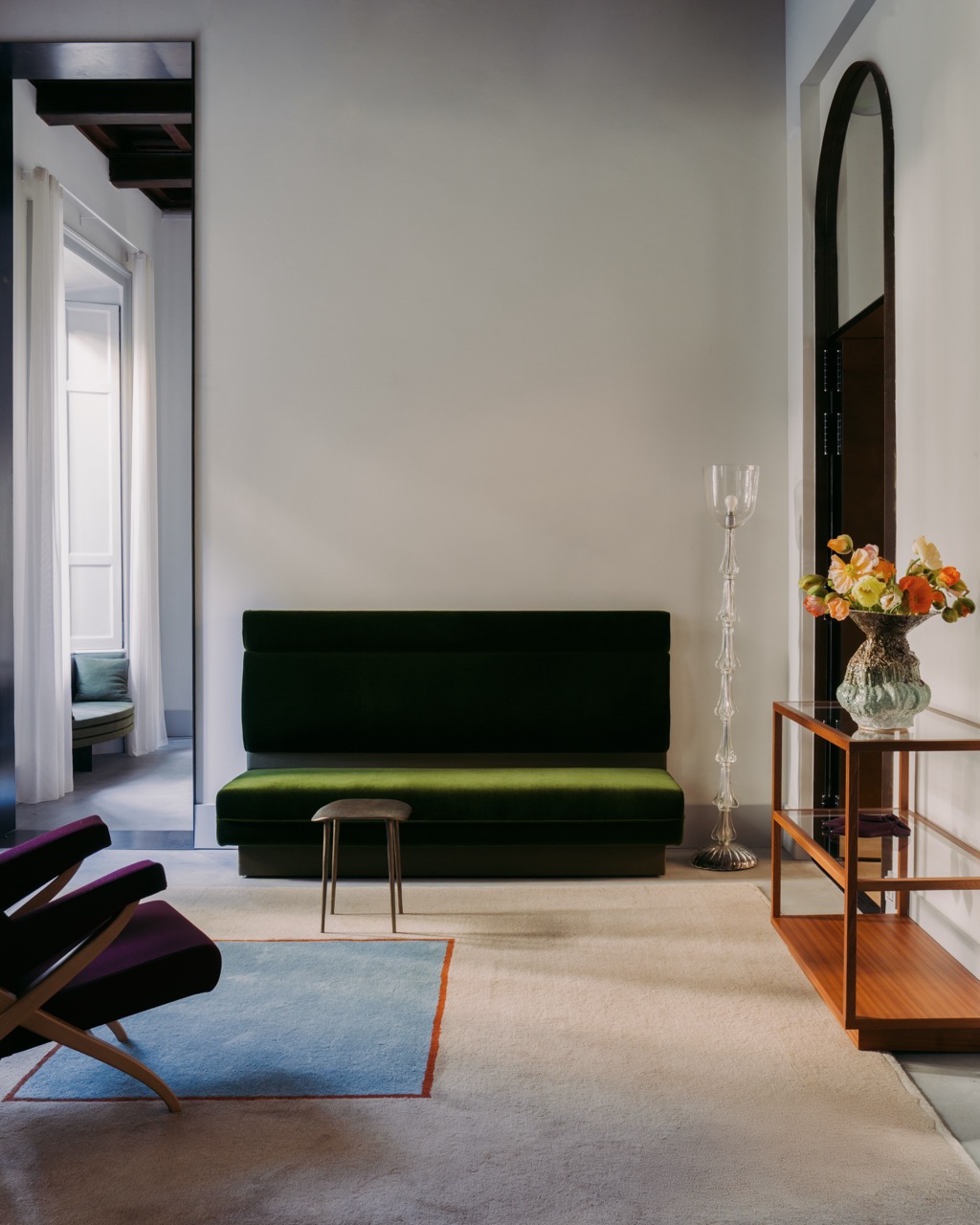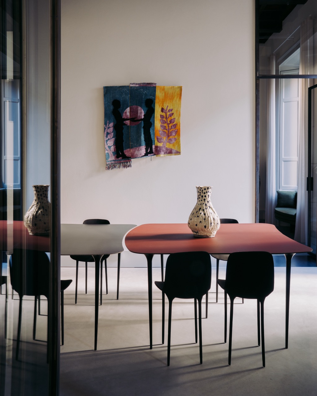 Первый этаж, выходящий к внутреннему двору XVIII века, выстроен как последовательность арочных проемов, ведущих в зону salotto, пространству для диалога и встреч с искусством на стенах. Со стороны Via Senato открывается второй вход, раскрывающий многослойную природу проекта: здесь Salotto Retori работает одновременно как шоурум, галерея и площадка для событий. Нижний уровень отдан миланскому офису бренда, позволяя посетителям буквально заглянуть в творческую кухню Retori.