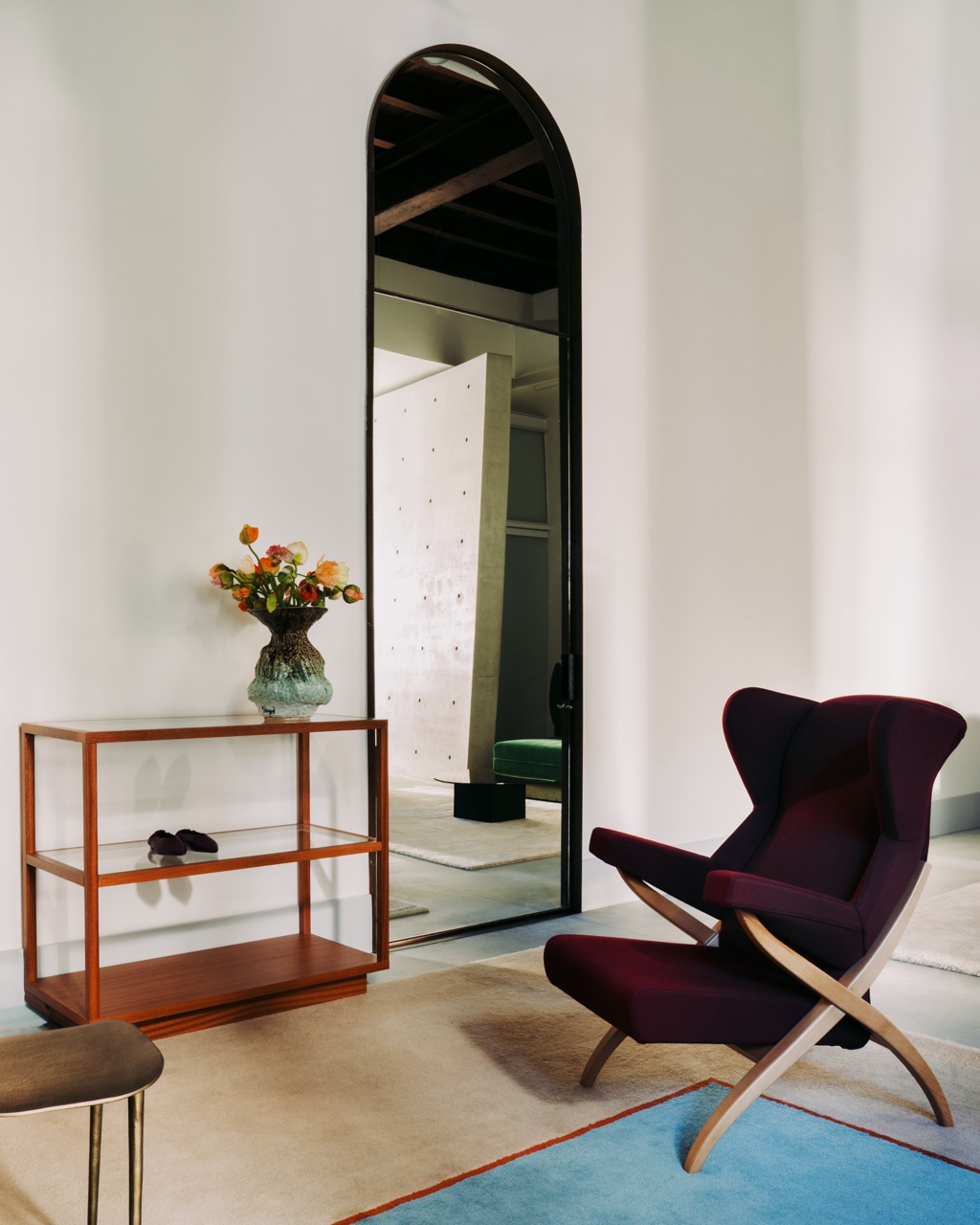Особое место в пространстве занимает бетонная стена — работа архитектора Тадао Андо, сохраненная и подчеркнутая в рамках деликатной реновации. Она становится архитектурной доминантой, которая задает ритм и масштаб всему интерьеру.