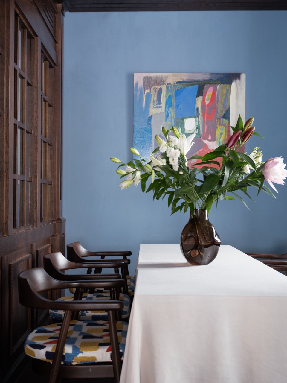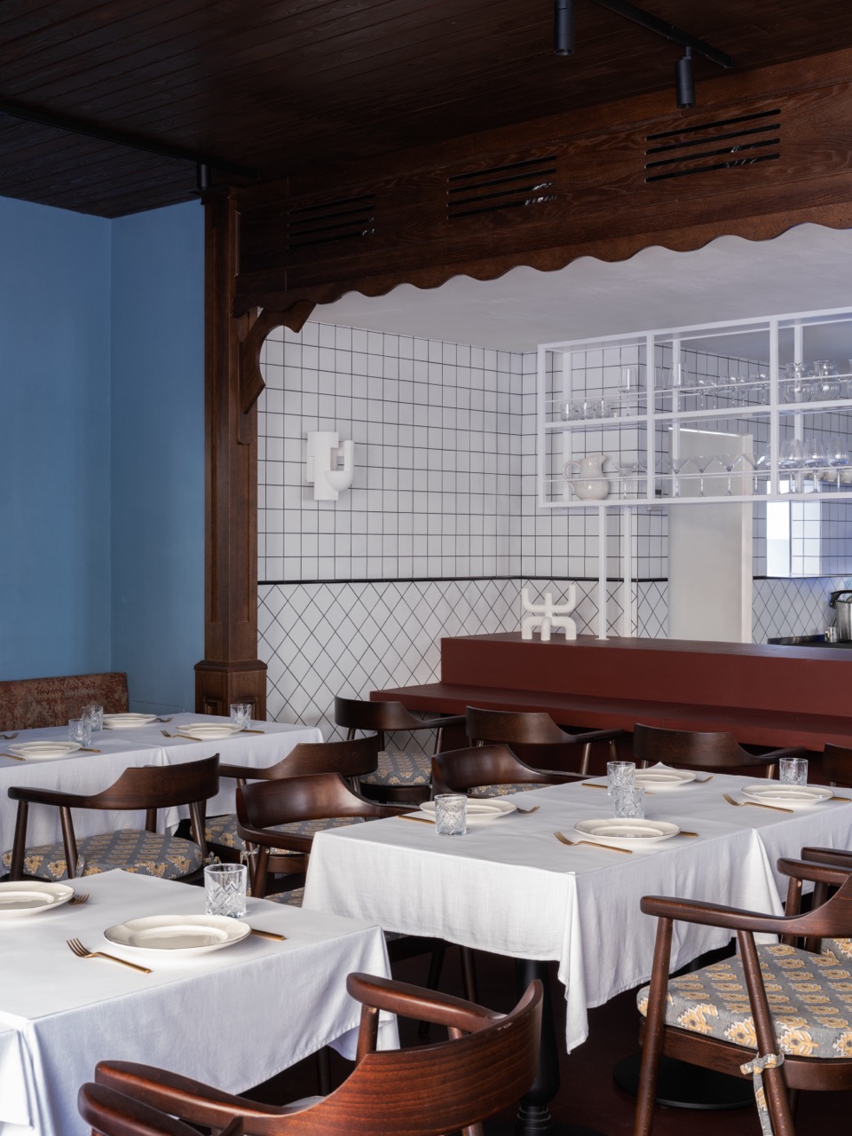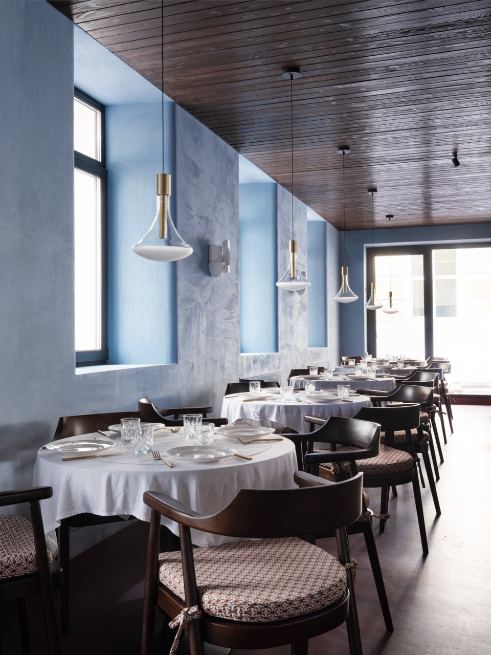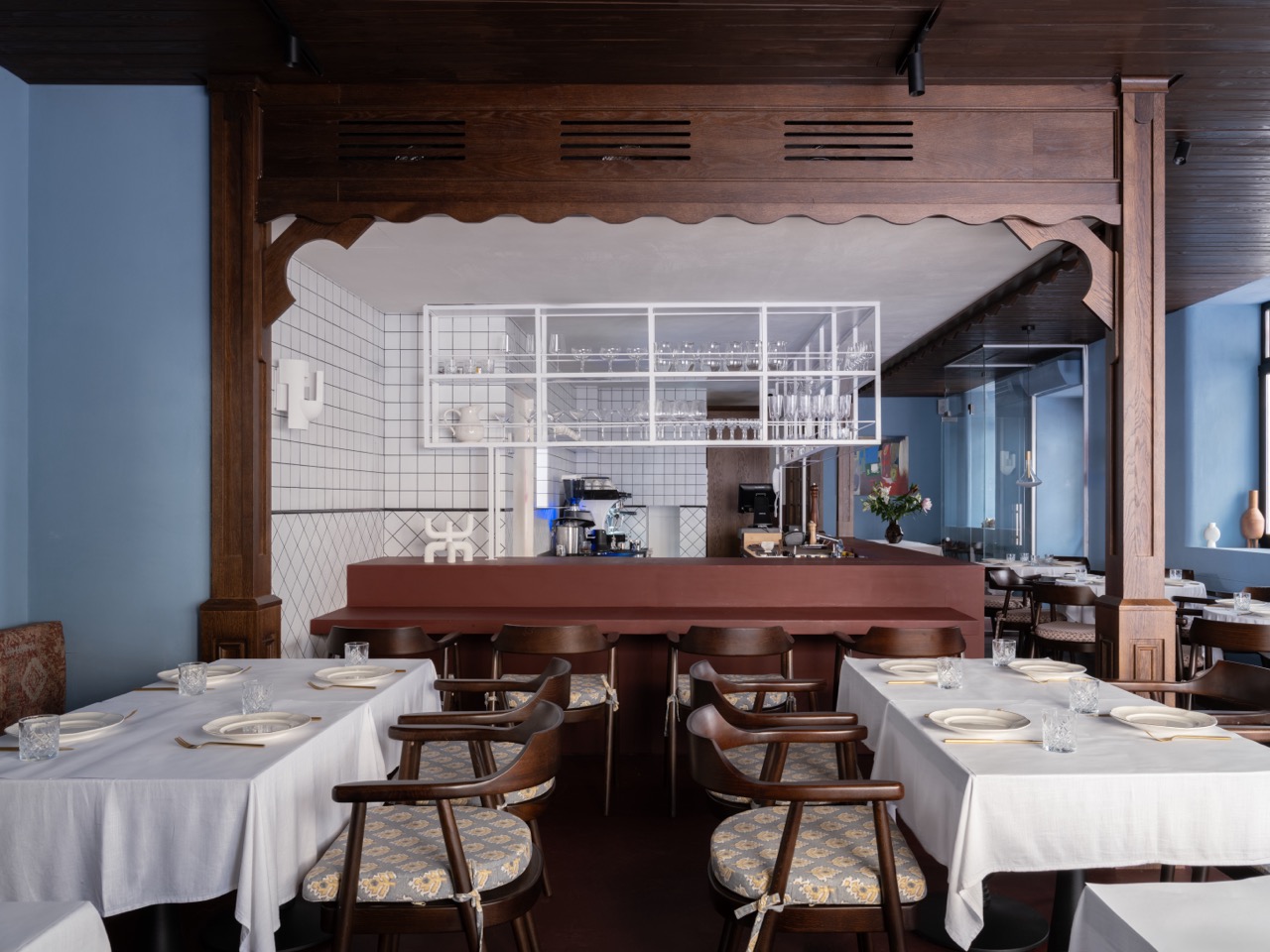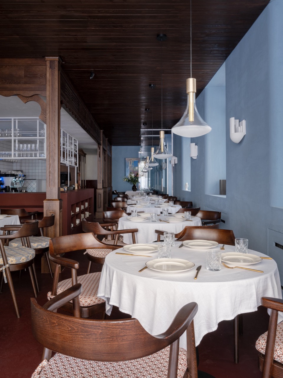 Для стен неслучайно был выбран голубой цвет – это отсылка к грузинским домам, где свет и воздух всегда важнее декора. Бар увеличен, пересмотрена и посадка — композиция собрана, а ее каждый элемент работает на общий ритм.