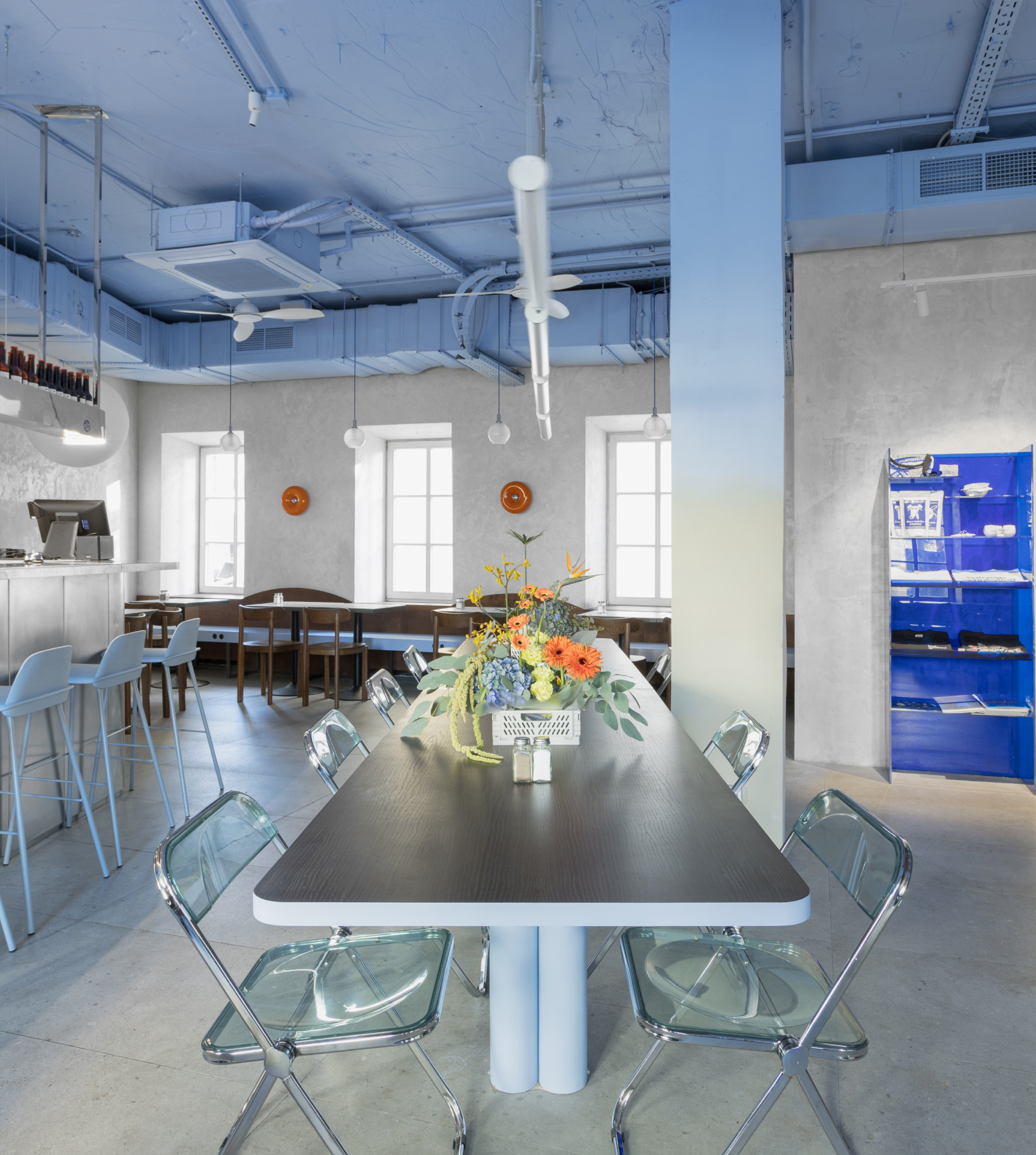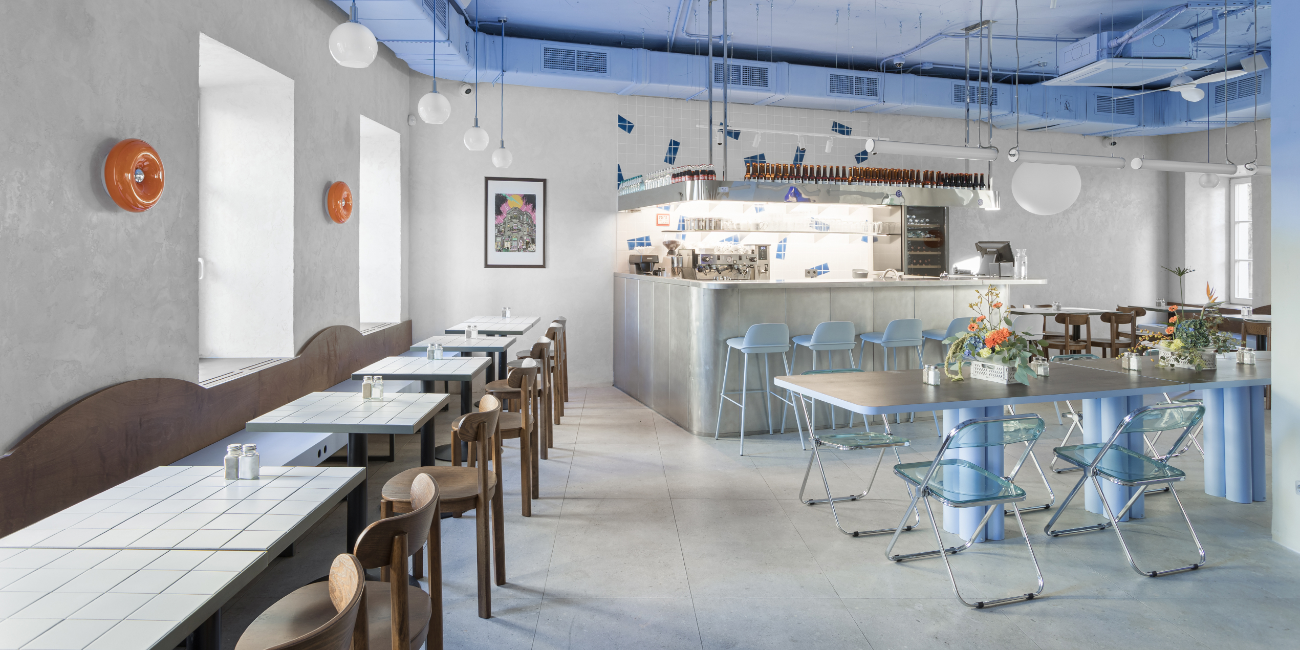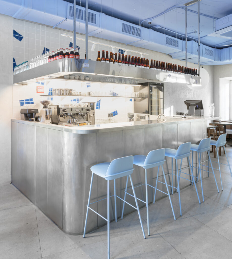 При входе в зал внимание привлекает контактный бар из нержавеющей стали от мастерской «Ближе к делу». Архитекторы проекта хотели сделать зону бара такой же невесомой, как и весь интерьер. Основные визуальные акценты появились на стене за баром — она отделана белой плиткой, расписанной студией Сeramstudio фирменным синим паттерном.