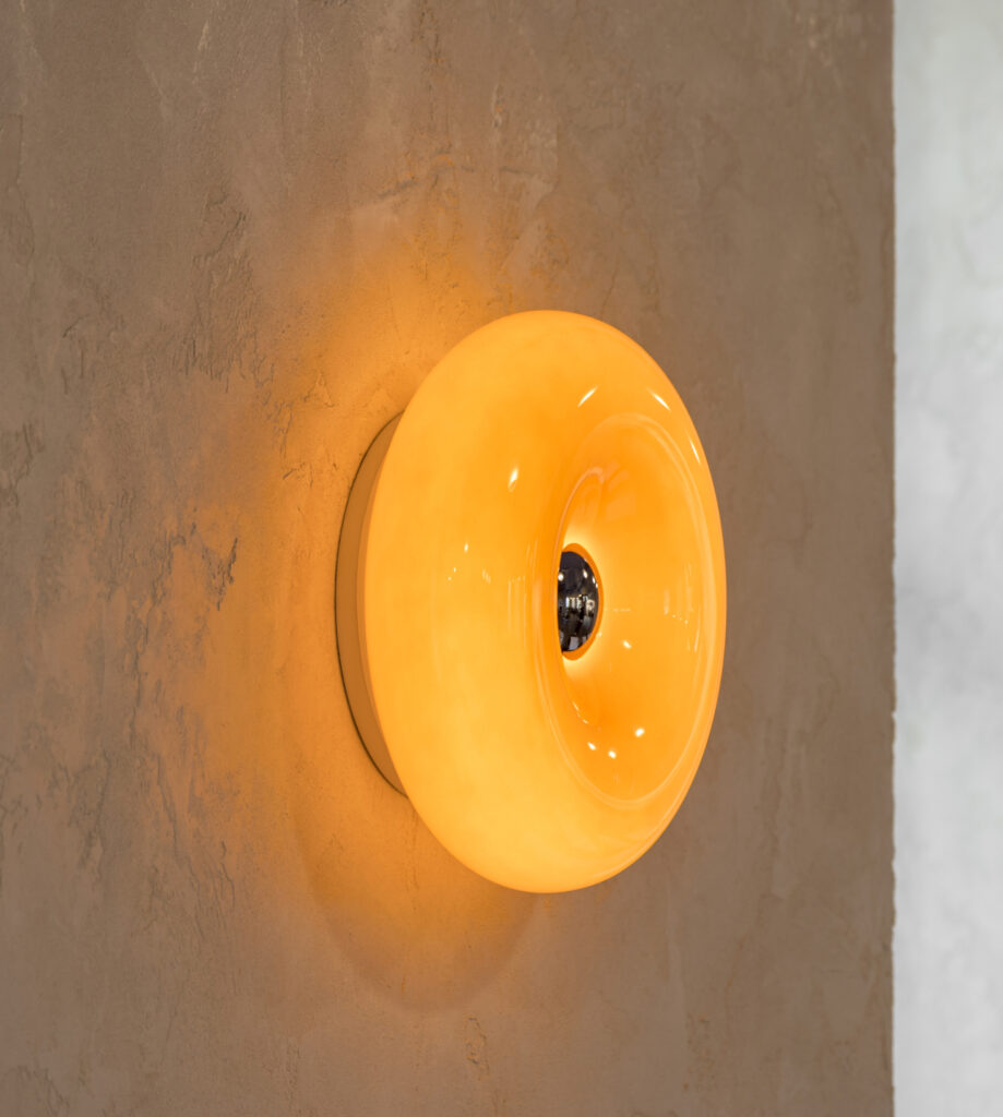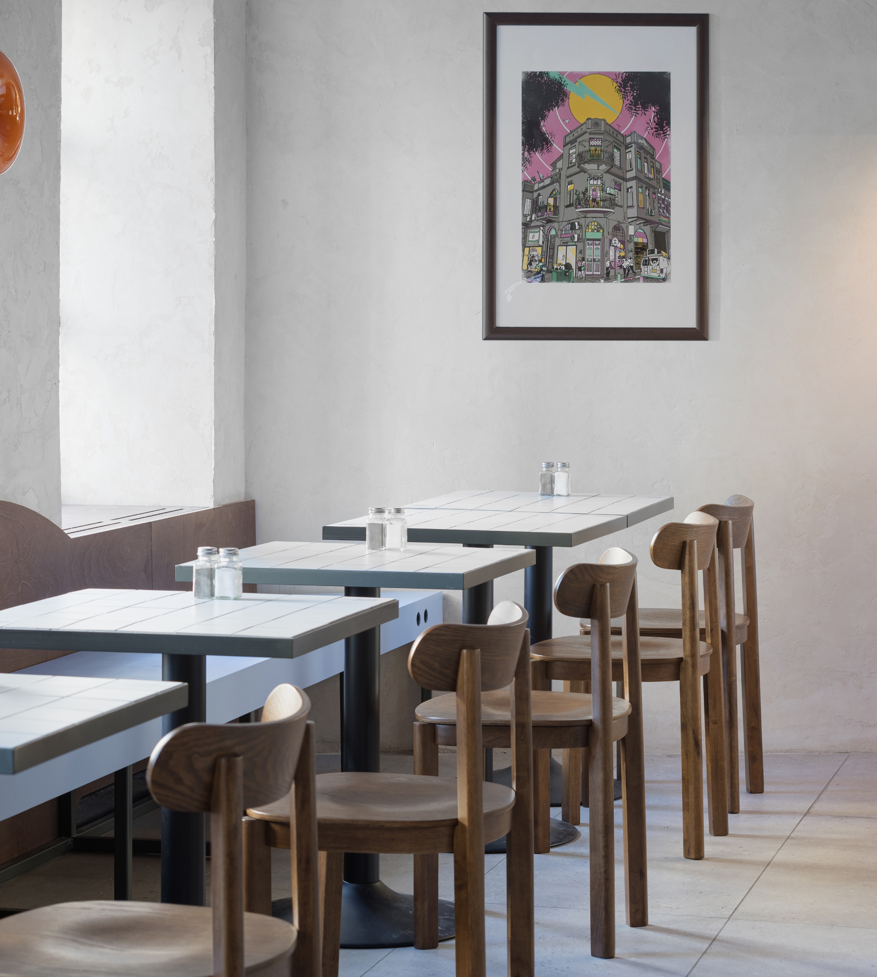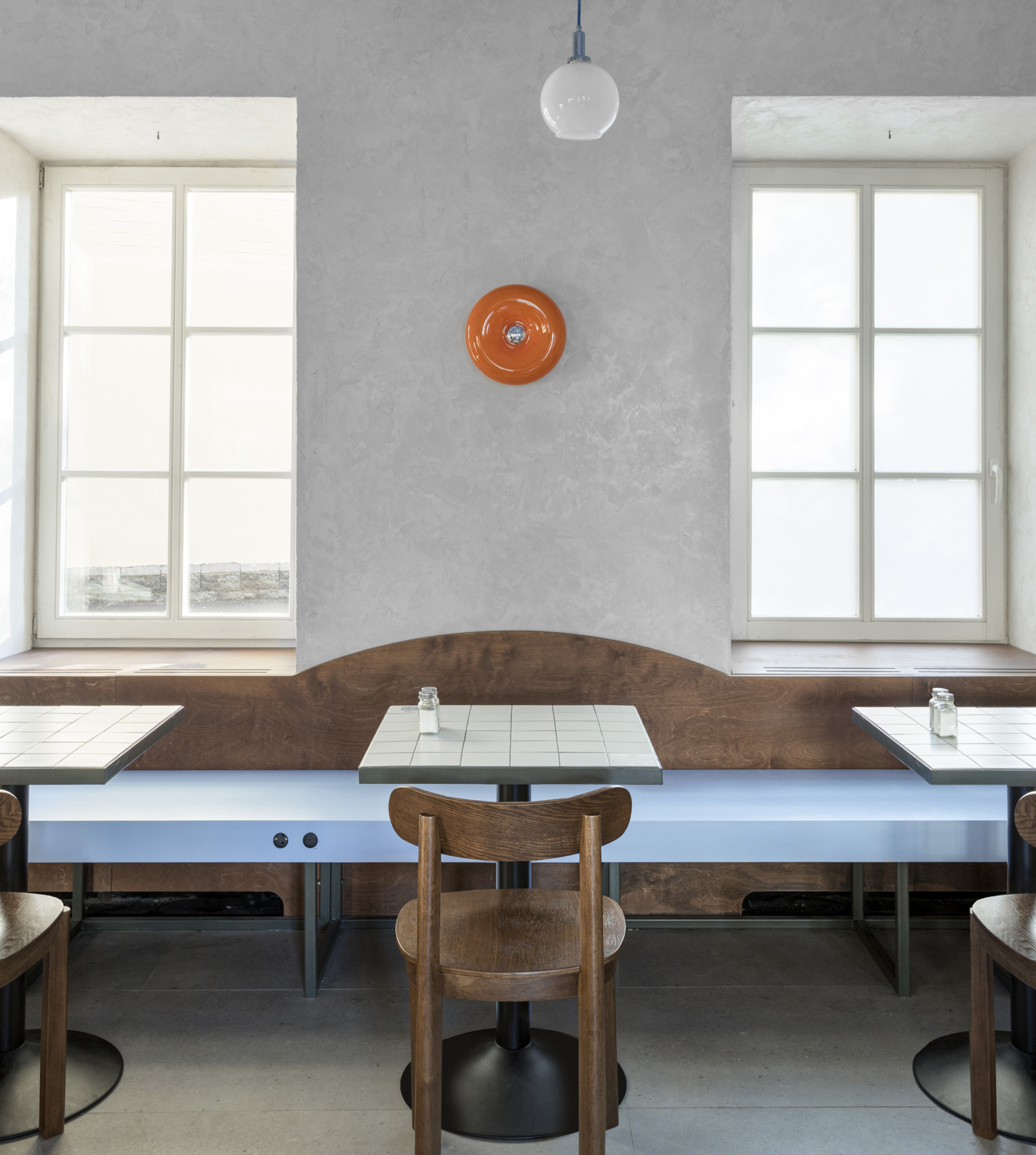 Отсылки к винтажной эстетике считываются в светодизайне и формах индивидуальной мебели. Основным материалом предметов мебели является фанера, которая уже использовалась в предыдущих проектах Dizengof/99, но в этот раз она представлена в глубоком ореховом оттенке. Особое внимание привлекает длинная скамья вдоль одной из стен с голубым основанием и изогнутым изголовьем благородного орехового цвета. Дополняют композицию деревянные стулья того же тона.