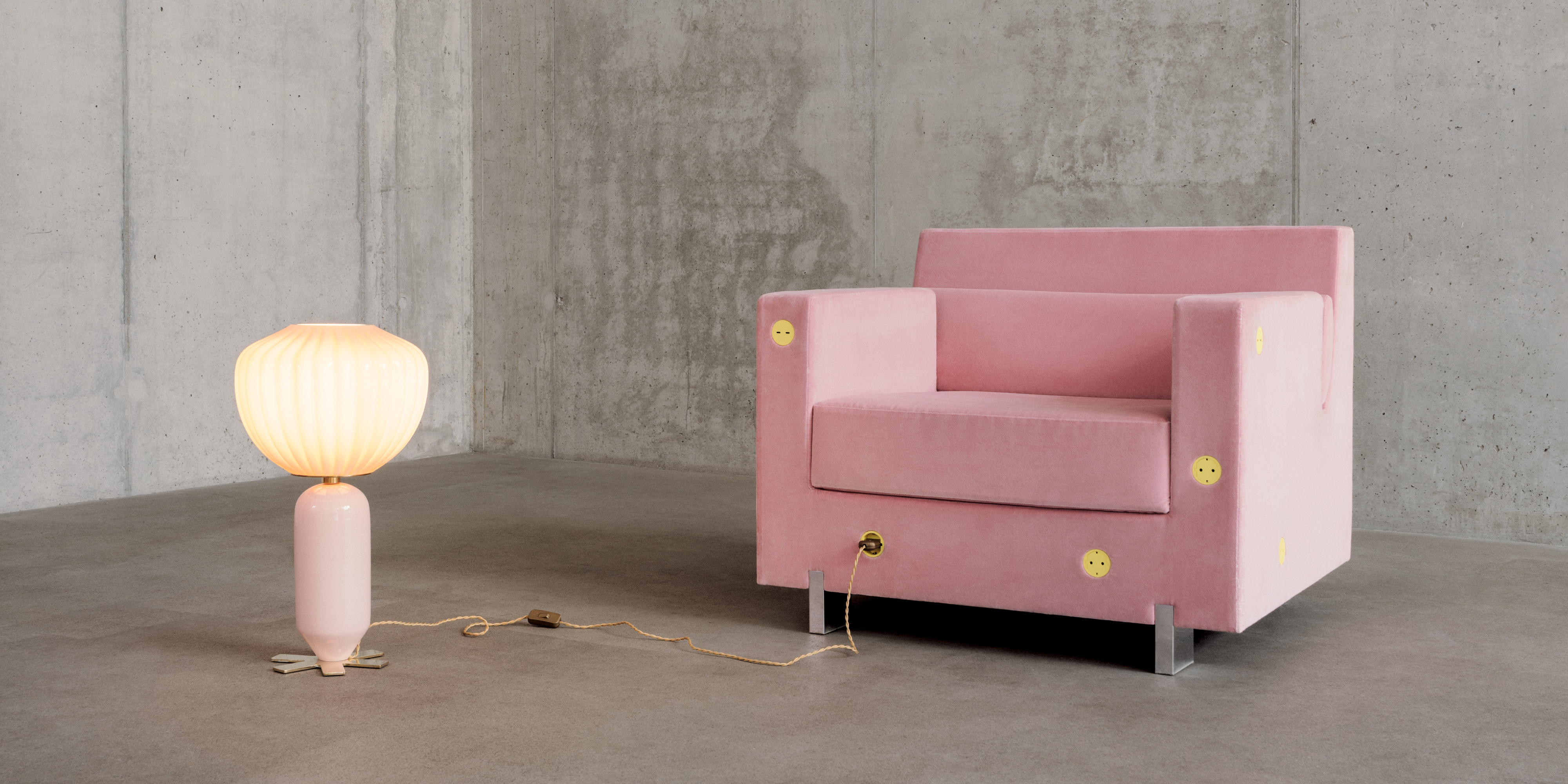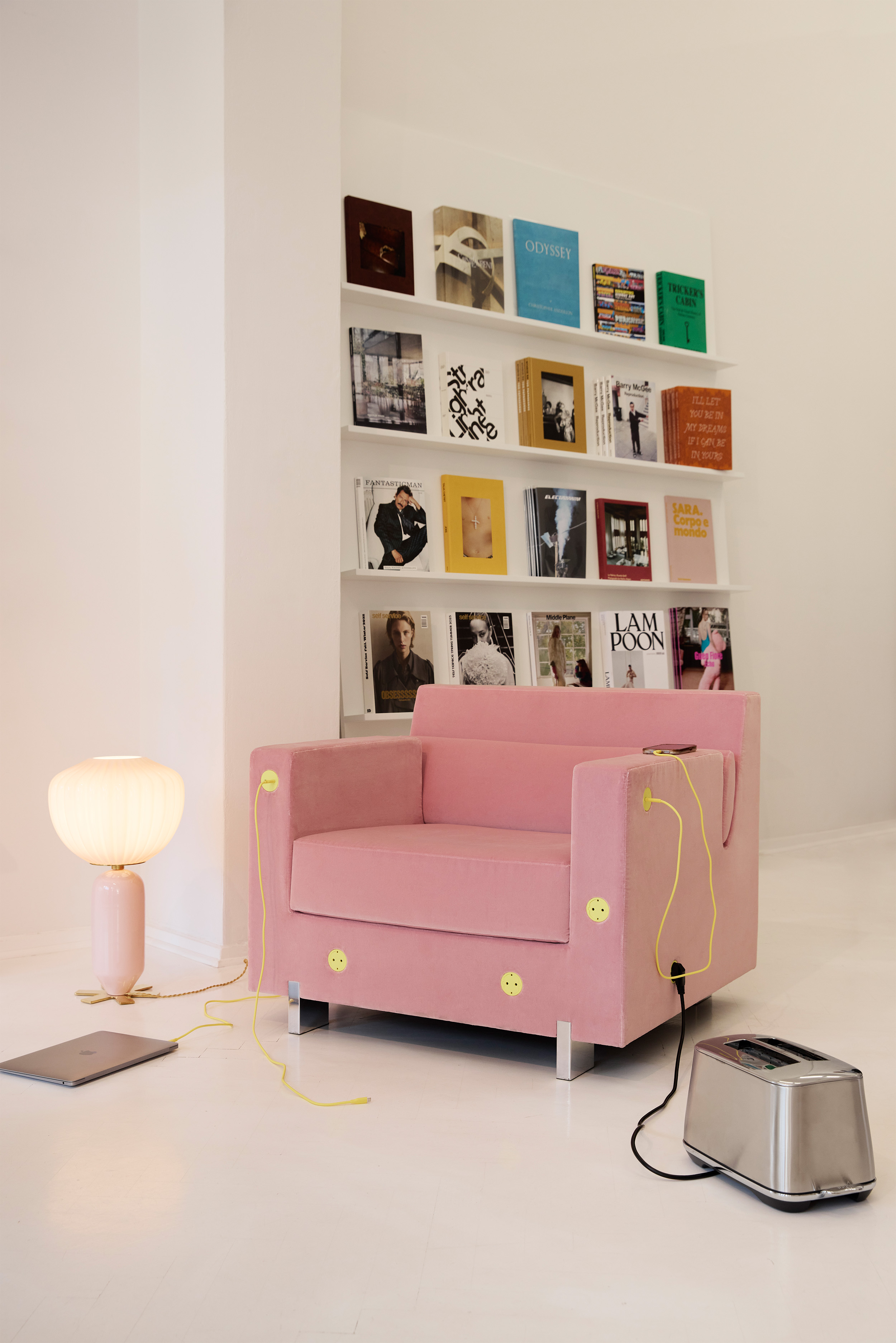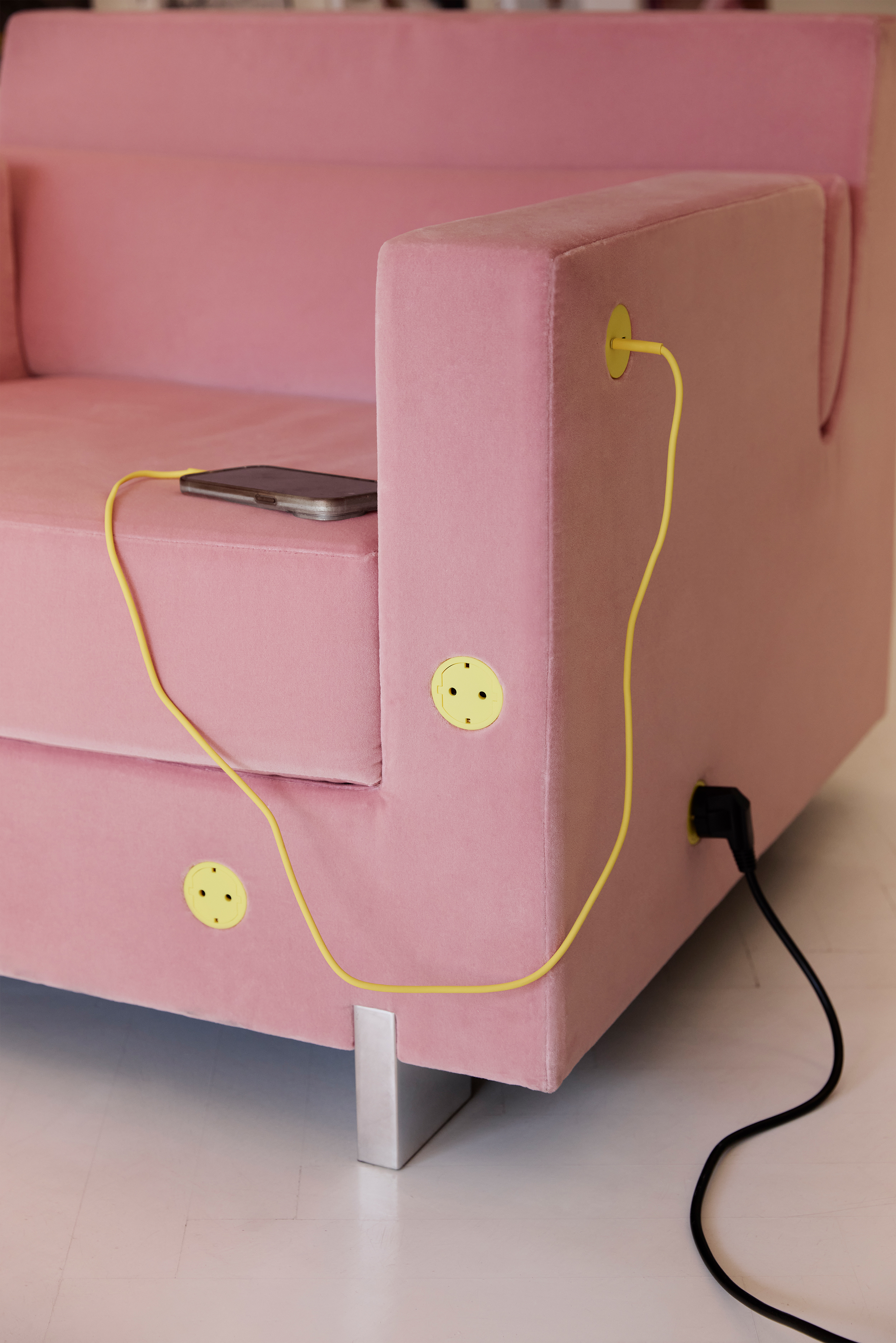 Основа проекта — модифицированная версия 22 System, уникальной запатентованной системы скрытых электрических компонентов от Bocci. Но вместо того, чтобы сливаться со стеной, как это обычно и происходит с розетками, новая версия вызывает улыбку. Буквально: на ярко-желтой пластине появляются два «глазка» — входы для вилок, и аккуратная «улыбка» между ними. Это не просто визуальный трюк, а продуманное художественное высказывание.