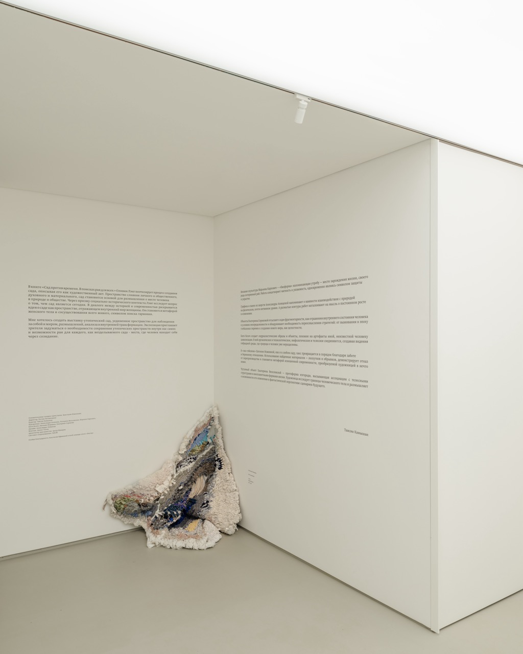 Экспозиция, собранная куратором Таисией Камышан, объединяет работы шести современных художниц, каждая из которых по-своему интерпретирует тему сада через различные художественные практики: от чугунных скульптур до эко-гобеленов из переработанных материалов.