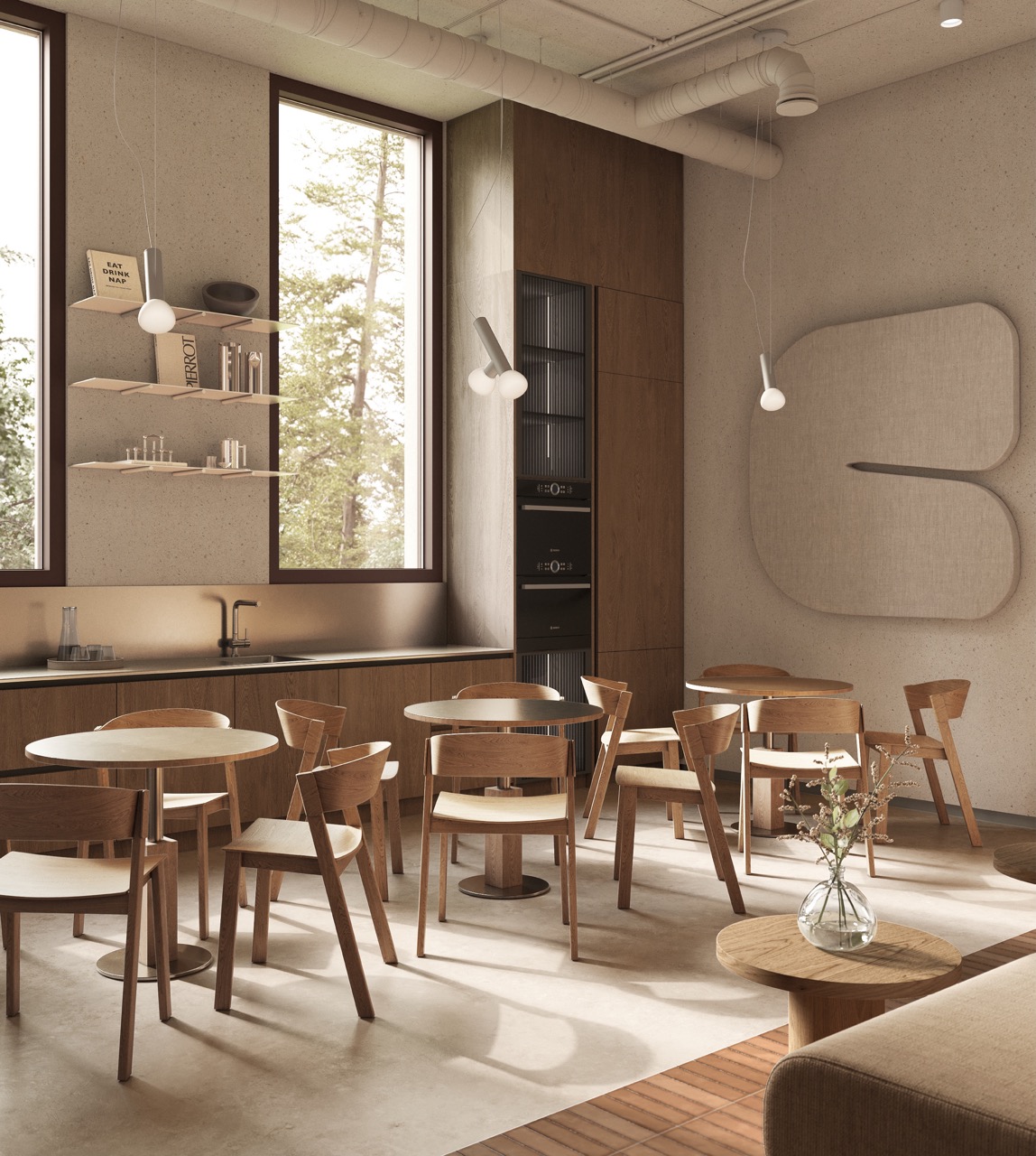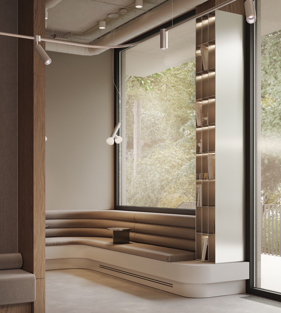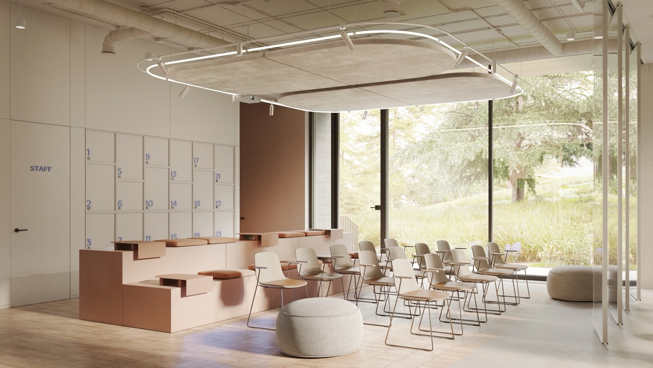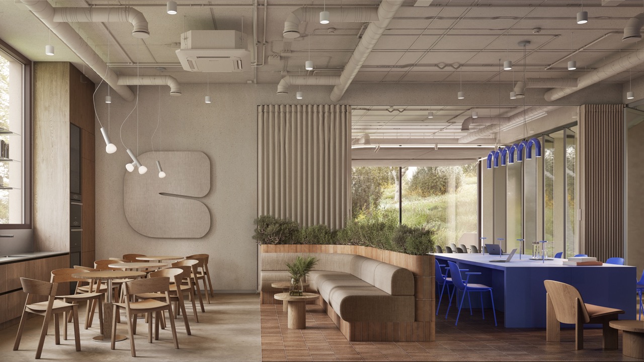 Планировочные решения ориентированы на постоянную трансформацию: открытые зоны для совместной работы легко адаптируются под мероприятия и лекции, переговорные отличаются по масштабу, а лаунж-пространства плавно переходят от зон для неформальной работы к зонам для нетворкинга. Модульная мебель, мобильные перегородки и мягкие текстильные разделители позволяют пространству перестраиваться под разные сценарии в течение дня. Также большое внимание уделено акустическому комфорту, особенно в открытых пространствах. Интегрированные акустические решения и живые растения улучшают качество звука и микроклимат, усиливая связь интерьера с окружающим природным ландшафтом.