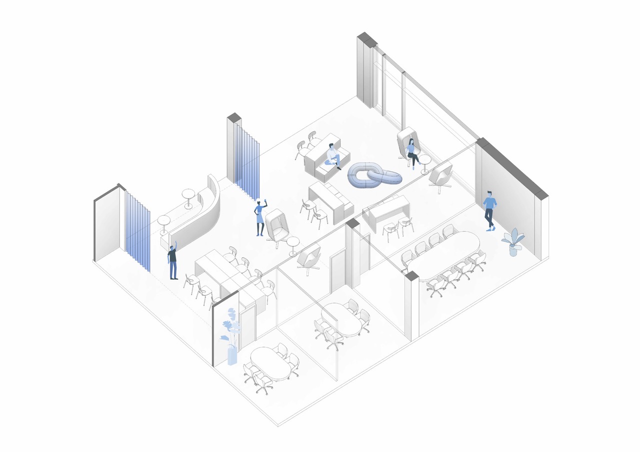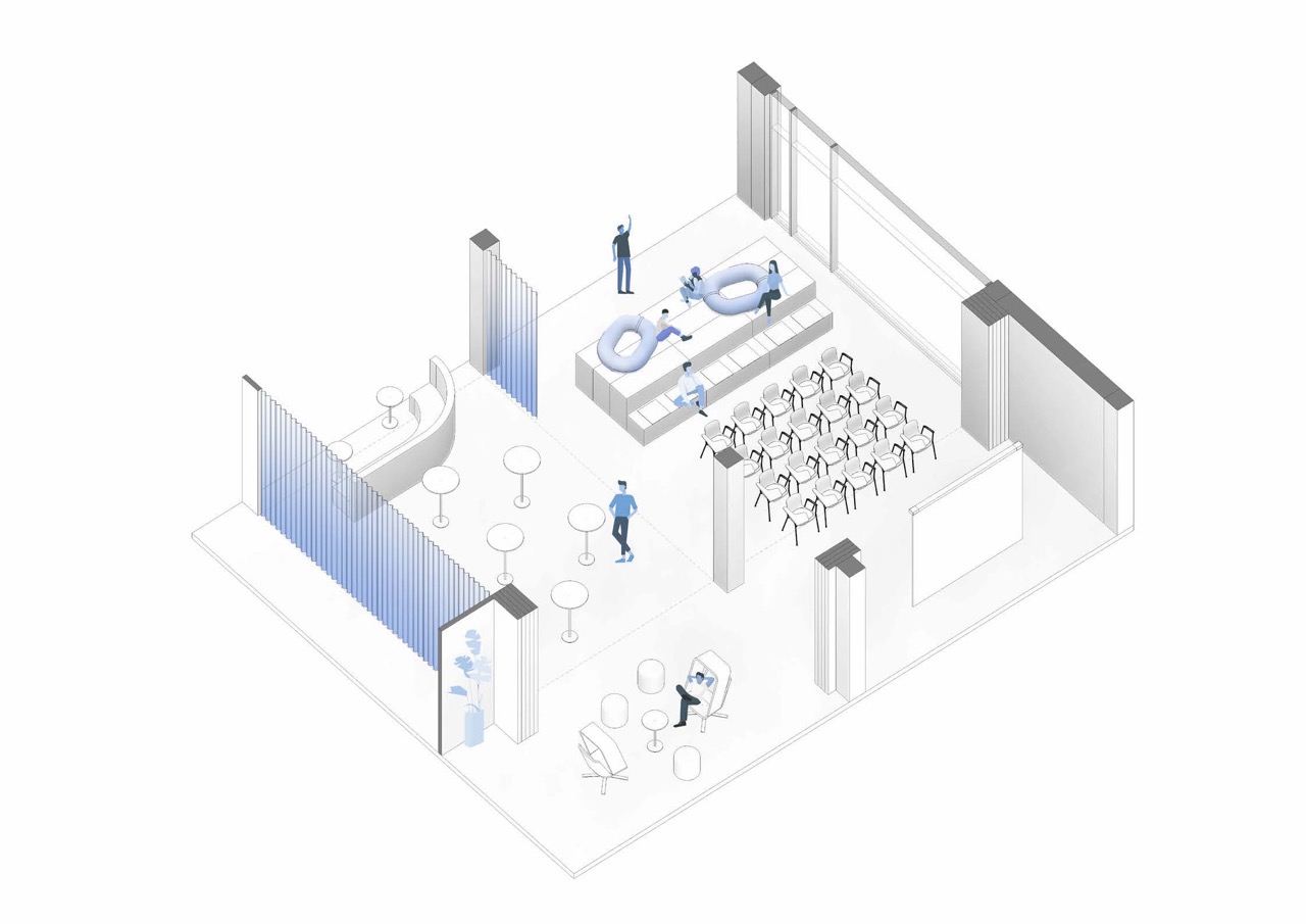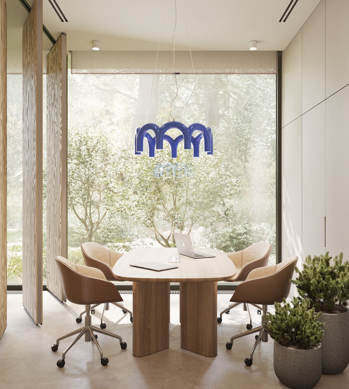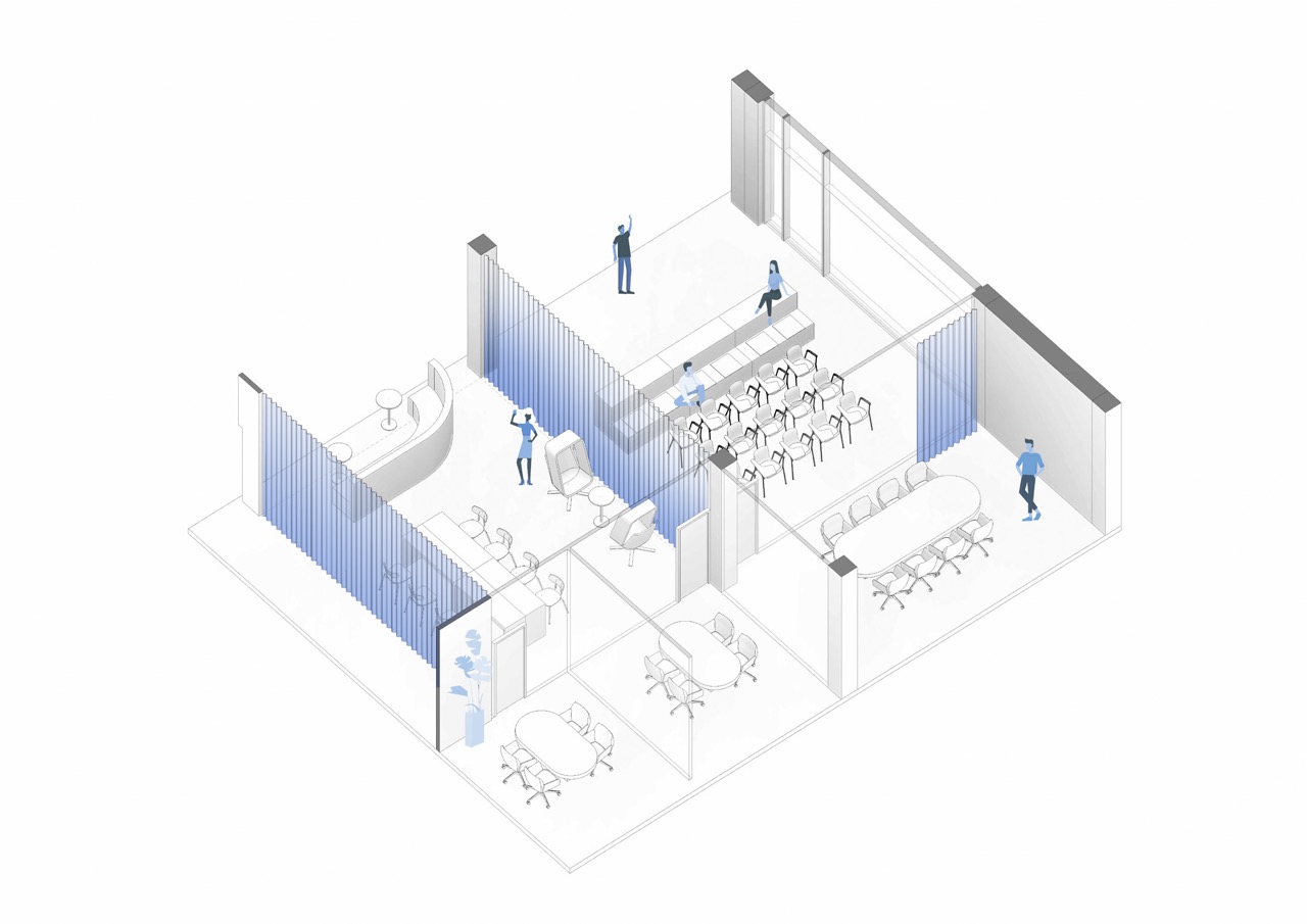 Планировочные решения ориентированы на постоянную трансформацию: открытые зоны для совместной работы легко адаптируются под мероприятия и лекции, переговорные отличаются по масштабу, а лаунж-пространства плавно переходят от зон для неформальной работы к зонам для нетворкинга. Модульная мебель, мобильные перегородки и мягкие текстильные разделители позволяют пространству перестраиваться под разные сценарии в течение дня. Также большое внимание уделено акустическому комфорту, особенно в открытых пространствах. Интегрированные акустические решения и живые растения улучшают качество звука и микроклимат, усиливая связь интерьера с окружающим природным ландшафтом.