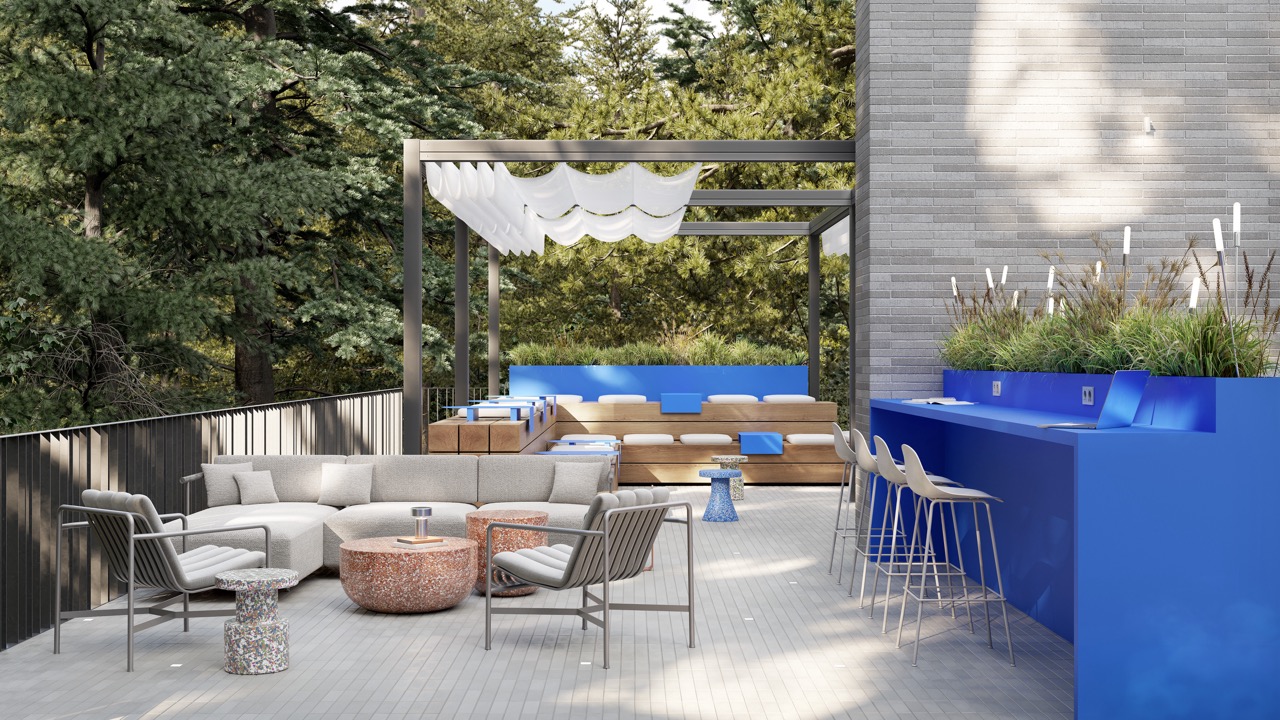 Villa 3 является ключевым общественным элементом будущего комплекса. Трехуровневый комьюнити-хаб включает в себя открытые коворкинг-пространства, переговорные и комнаты для совместной работы, лаунж-зоны и лекционный зал. Верхний этаж расширяет функциональную программу за счет лаунж-зоны и террасы на крыше с панорамным видом. Гибкие тканевые перегородки формируют более камерные пространства и позволяют легко трансформировать интерьер под различные сценарии использования.