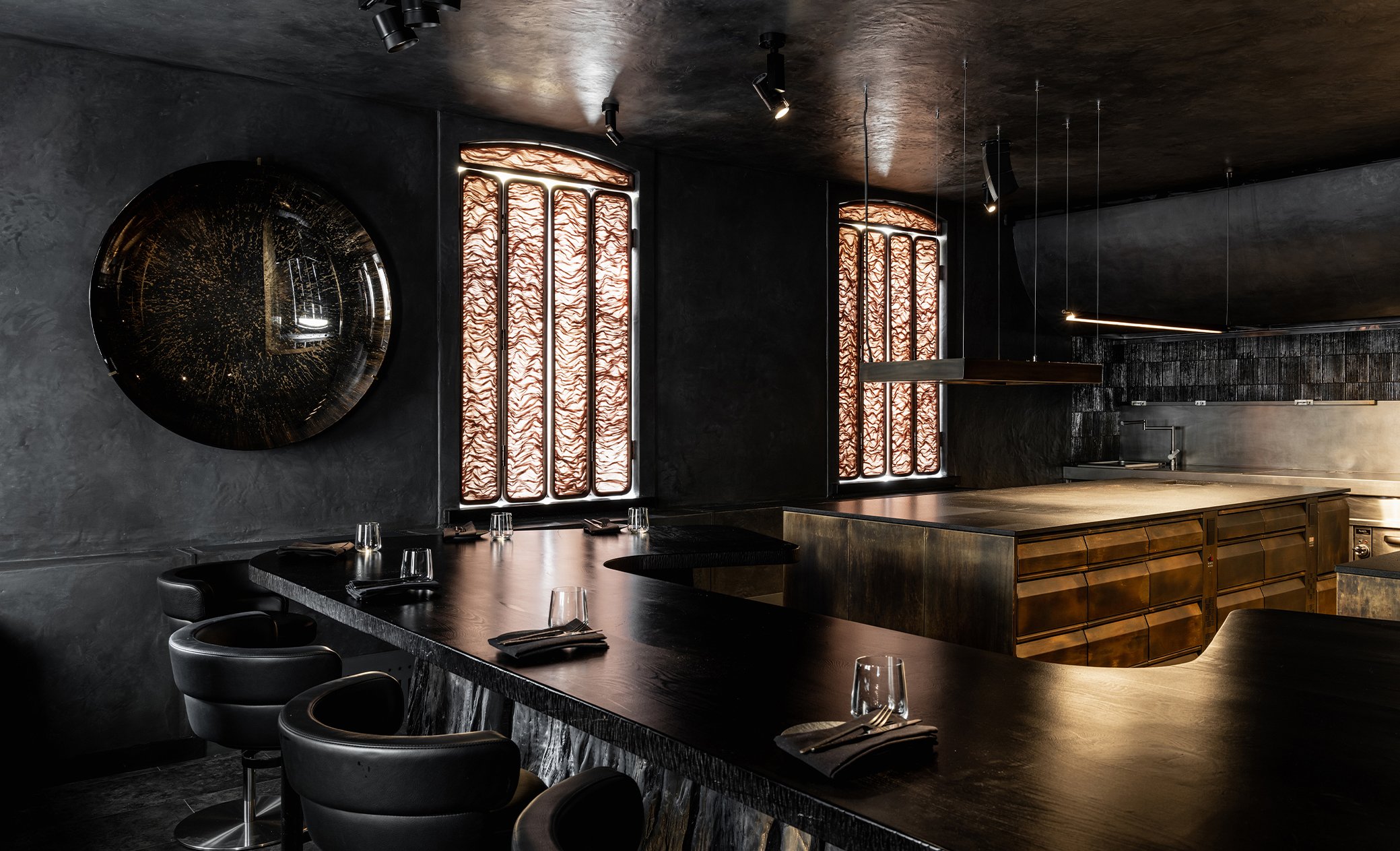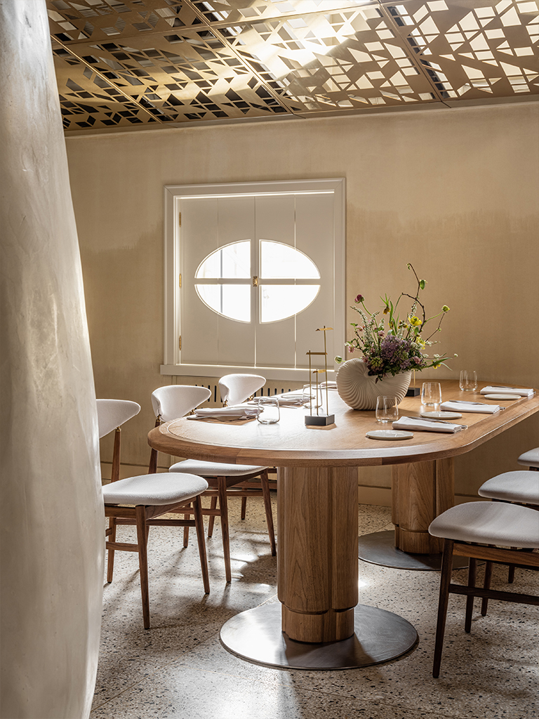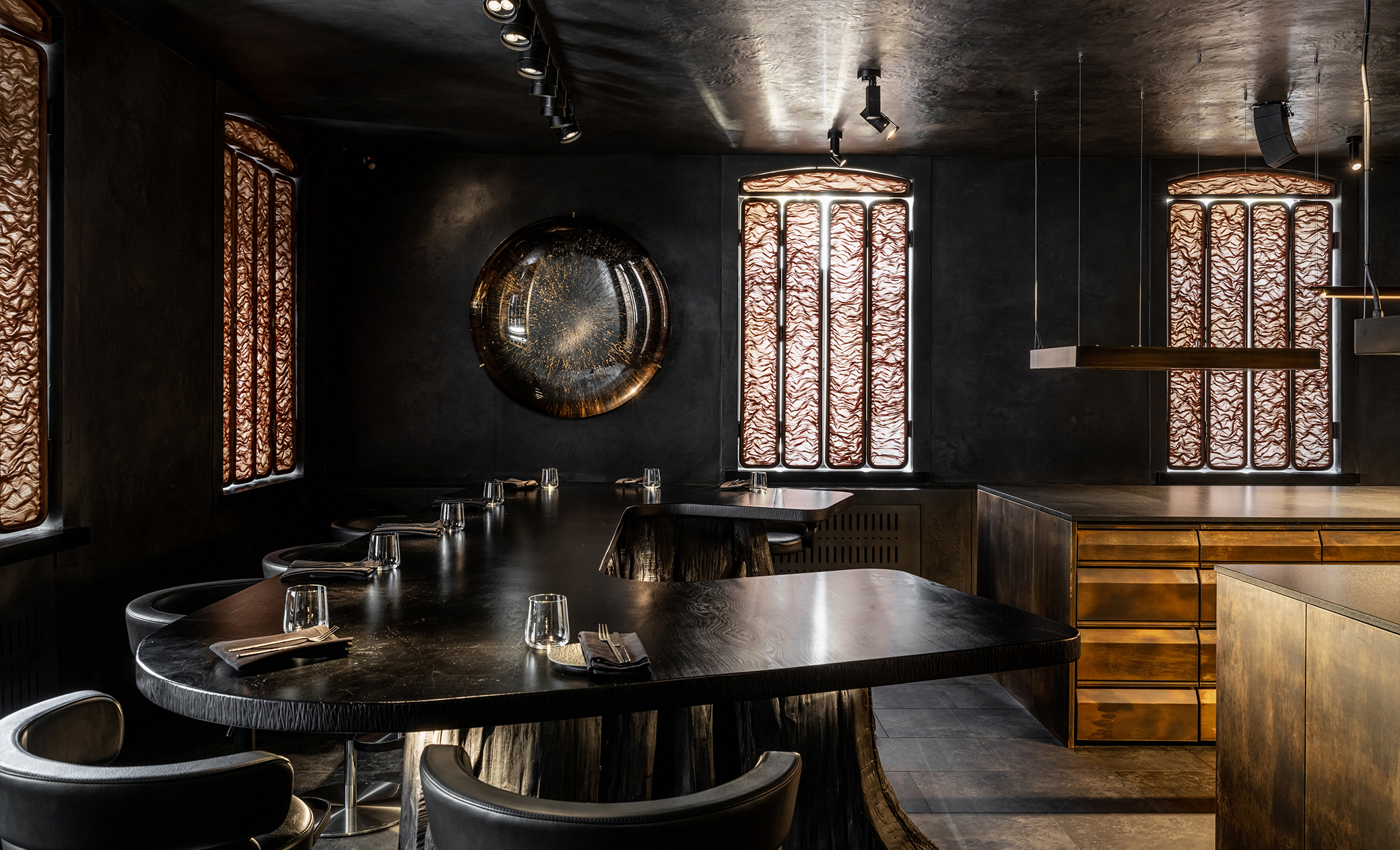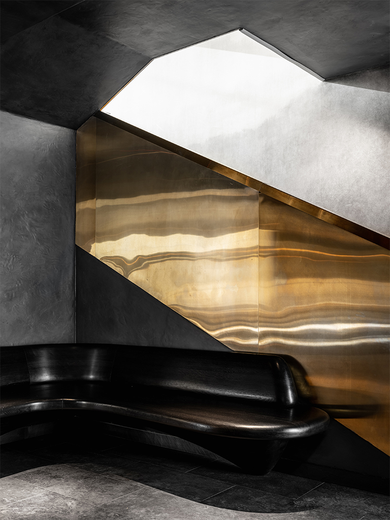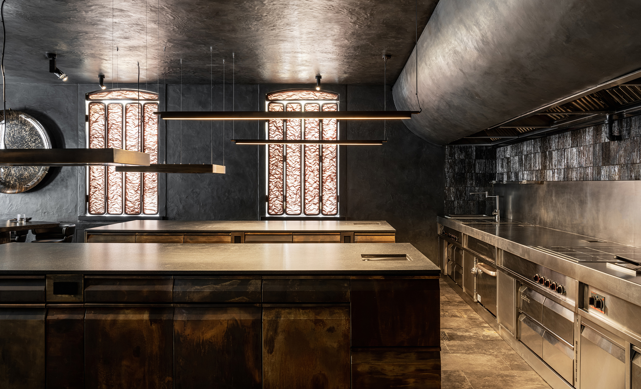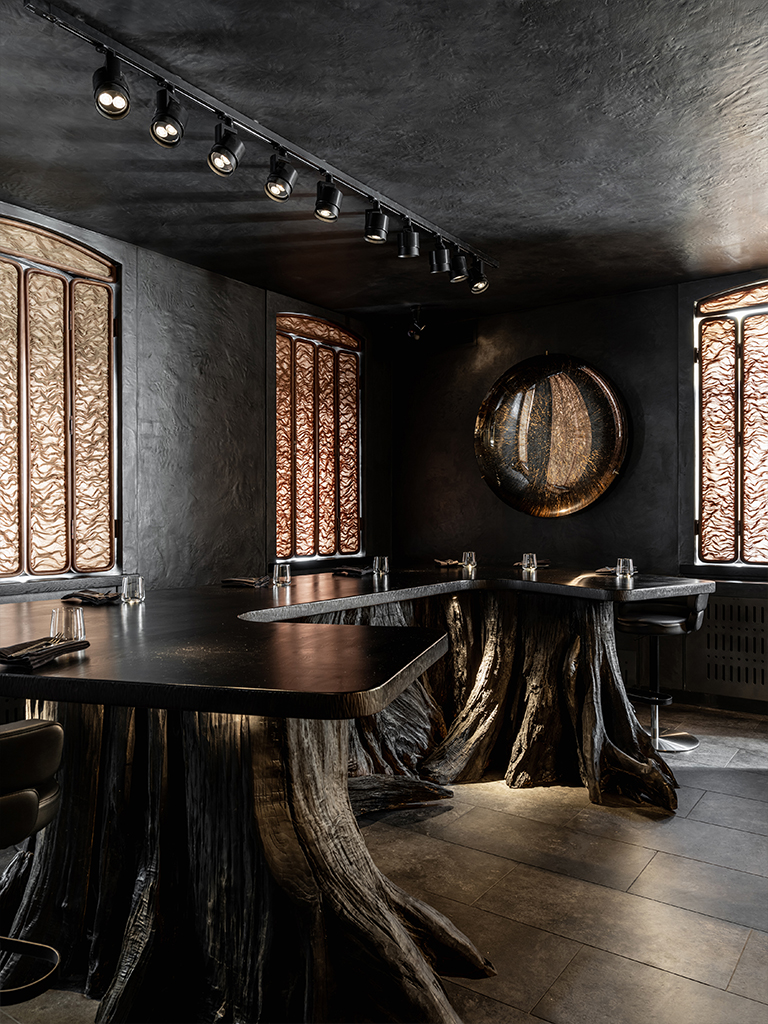 Первый этаж ARTEST напоминает подземное убежище алхимиков, где творится гастрономическая магия. Это место тайны, интриги, мистики. Здесь располагается Chef’s Table на 10 человек, окруженный открытой кухней. Гости становятся частью процесса, наблюдая за тем, как создаются блюда. Важно было сохранить эффект театральности: свет должен выделять только нужные акценты, но не раскрывать все пространство сразу. Мы хотели создать атмосферу таинственности, не разрушая ее избыточной яркостью. При этом необходимо было обеспечить функциональный свет для комфортной работы поваров и сделать так, чтобы гости видели именно то, что нужно шефу, а не случайные детали процесса.
