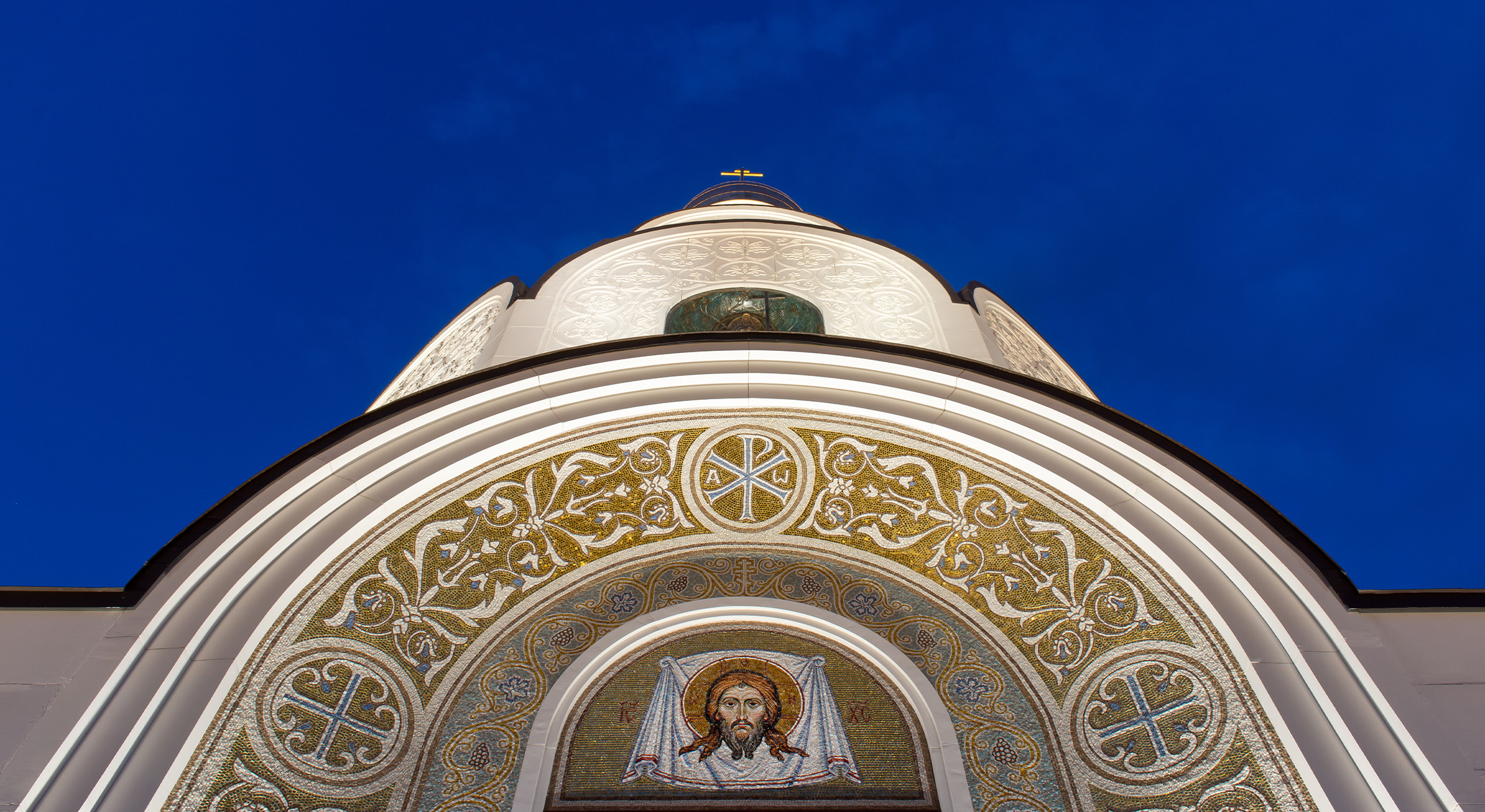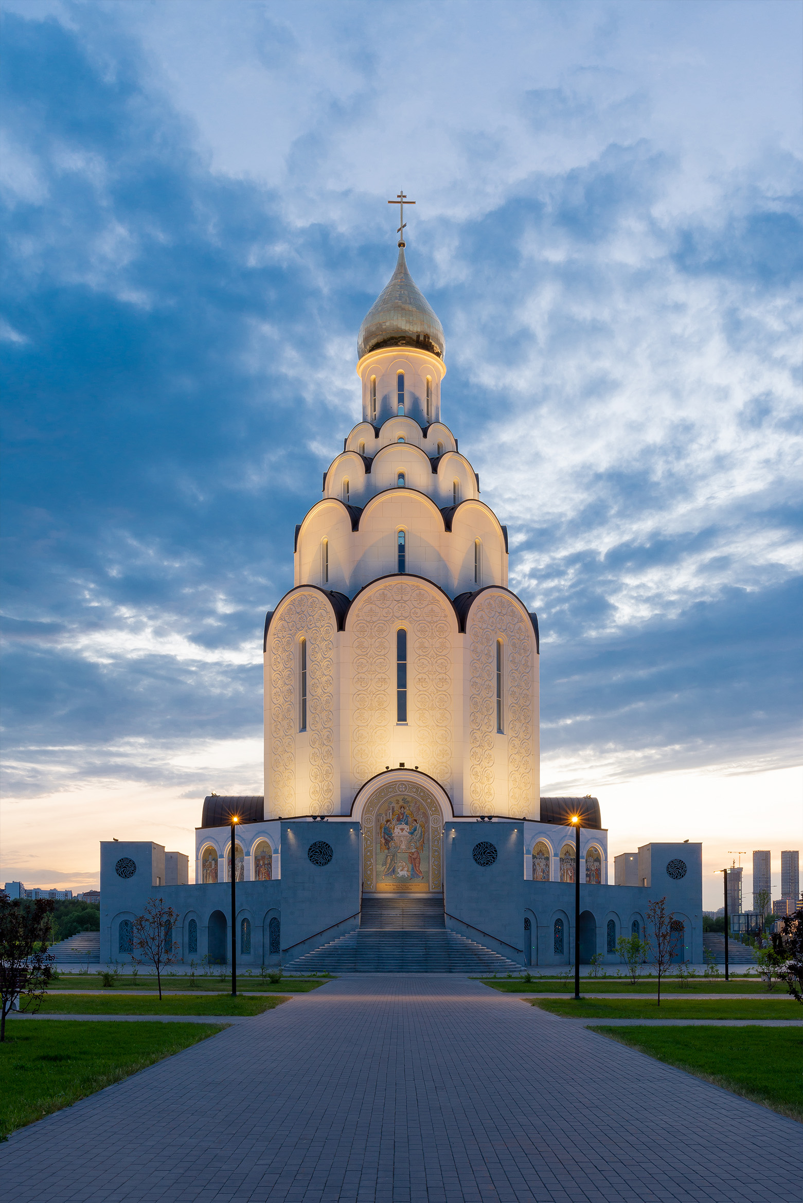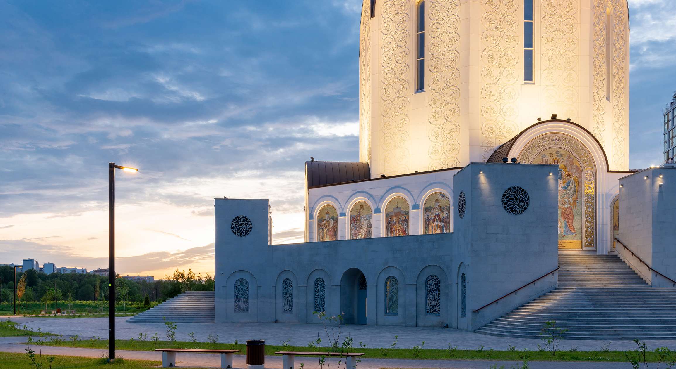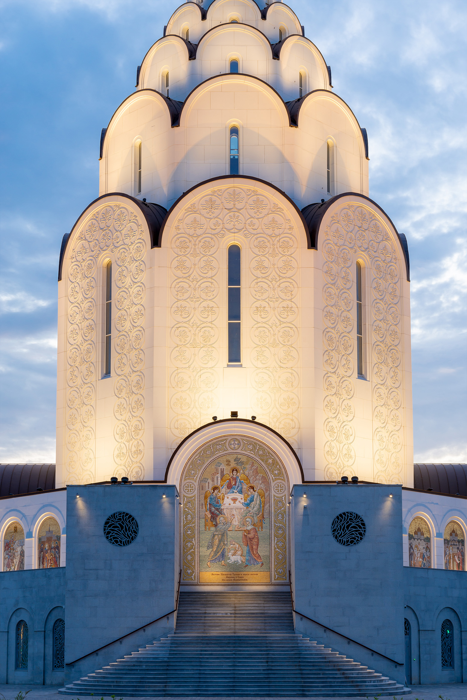 Для белоснежного фасада храма с фактурным растительным орнаментом, были выбраны светильники с нейтрально-белой цветовой температурой. Они лучше всего подчеркивают белый оттенок отделки, а также отражающие элементы мозаики, декоративное оформление порталов и золото купола. Фасад здания декорирован растительным орнаментом, и он отчетливо читается как днем, так и в темное время суток, благодаря архитектурной подсветке, формирующей светотеневой рисунок.