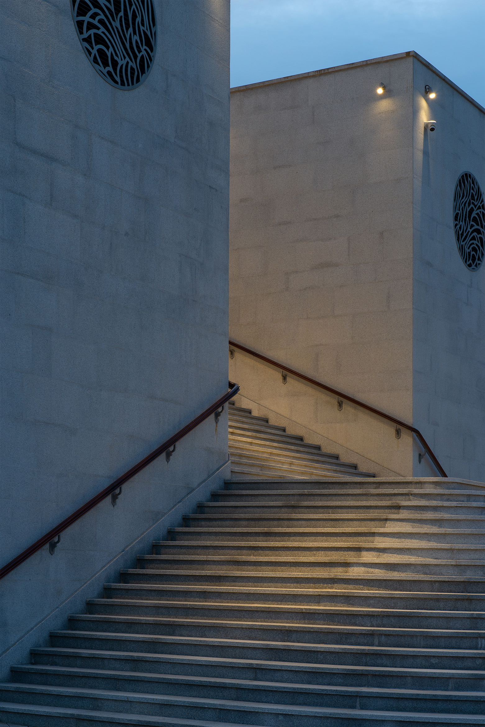 Стилобатную часть, в которой располагается воскресная школа, отделанную серыми плитами, было решено не выделять светом. В сумерках эта часть кажется еще темнее на контрасте с верхними подсвеченными ярусами белого цвета. Создается ощущение, будто здание приподнято над землей. Такой прием делает его «возвышенным» над всем мирским, но в то же время сохраняет связь между землей и небом через освещение входной группы.