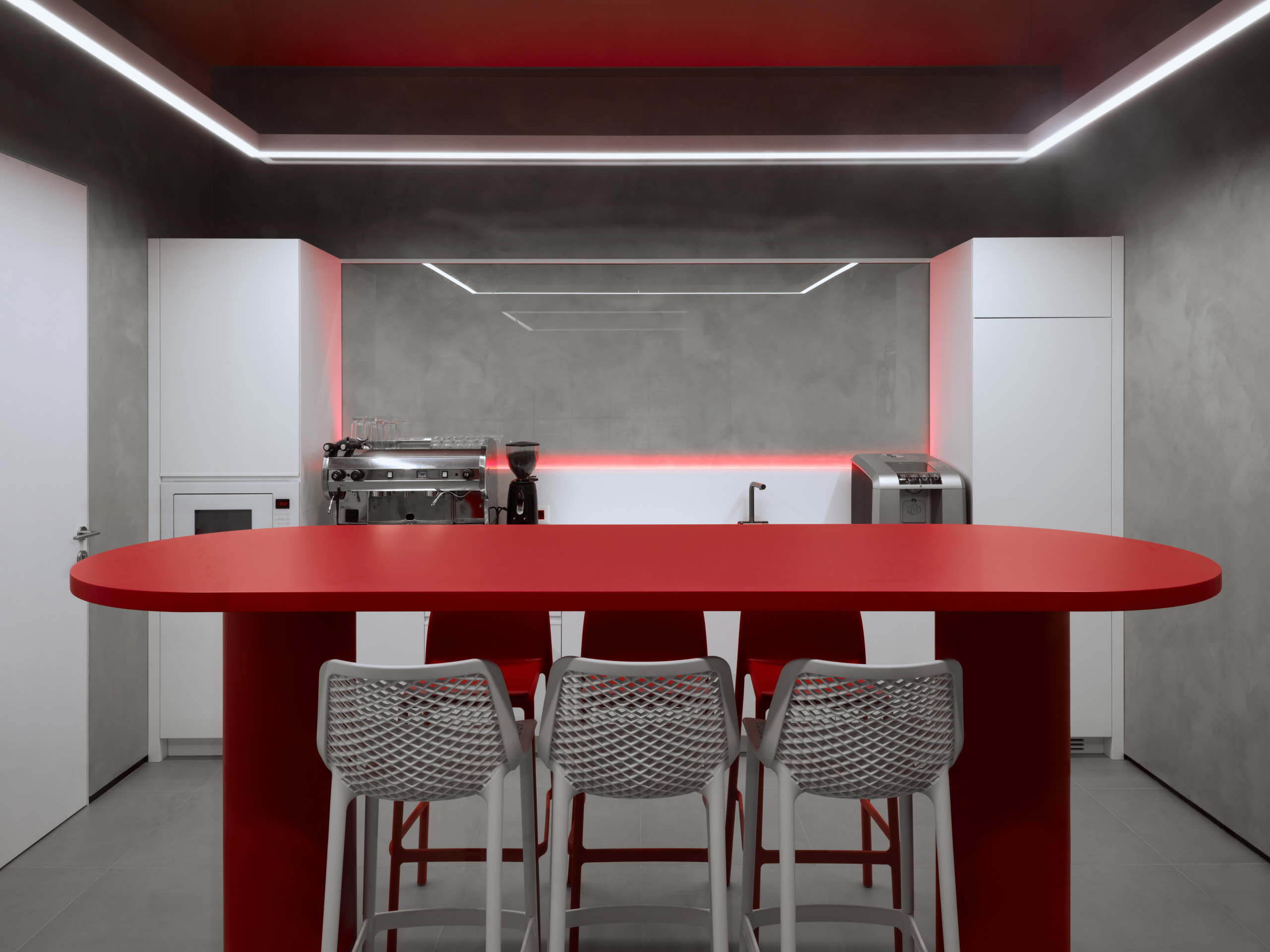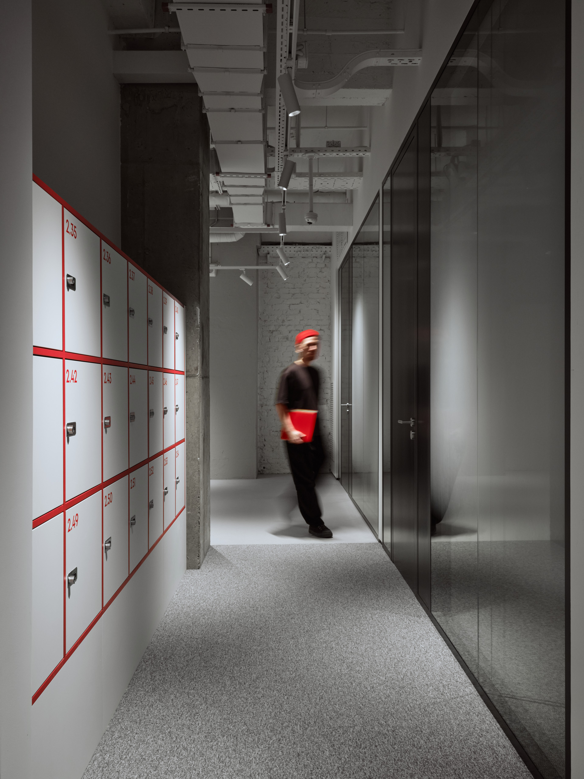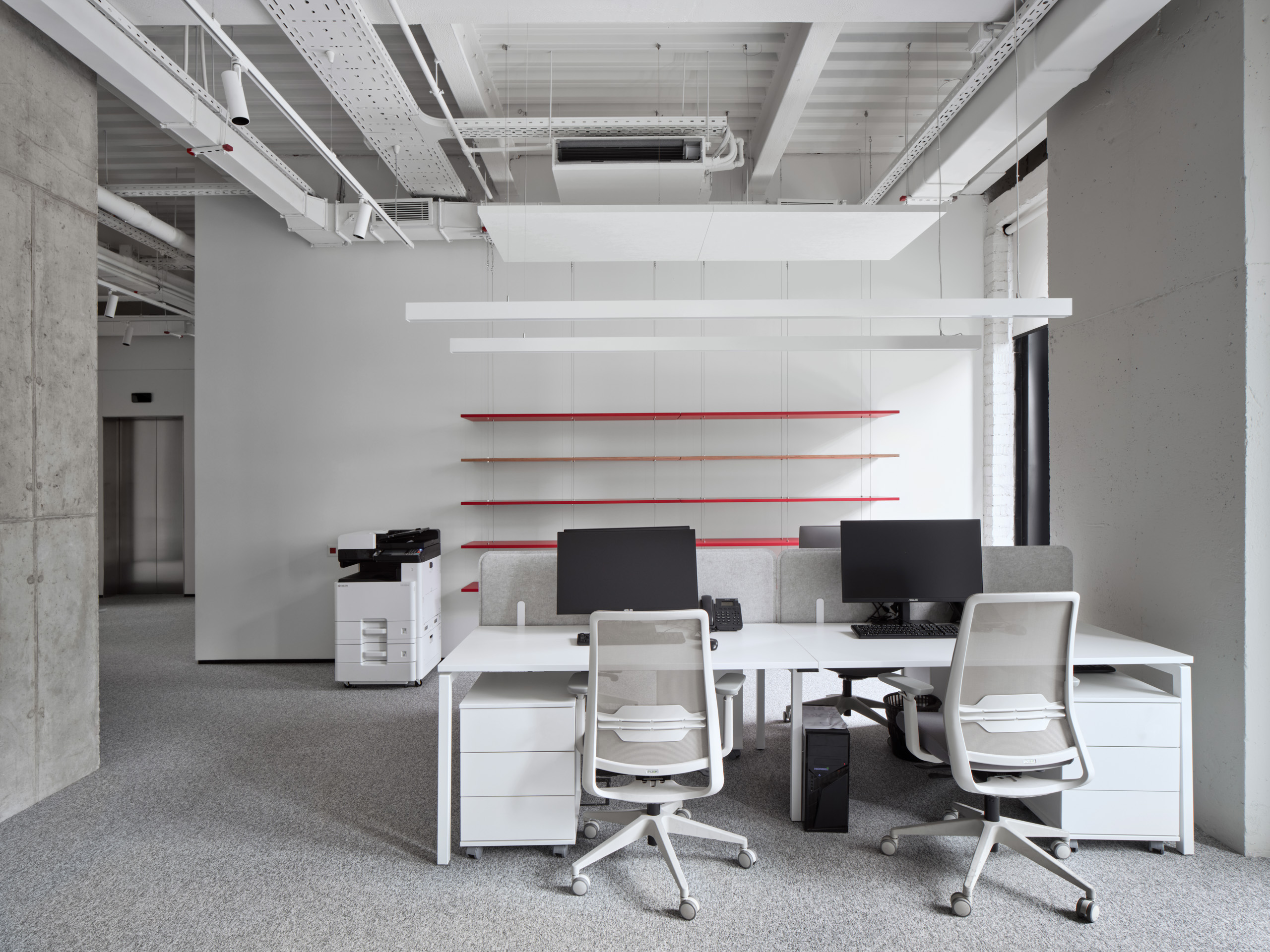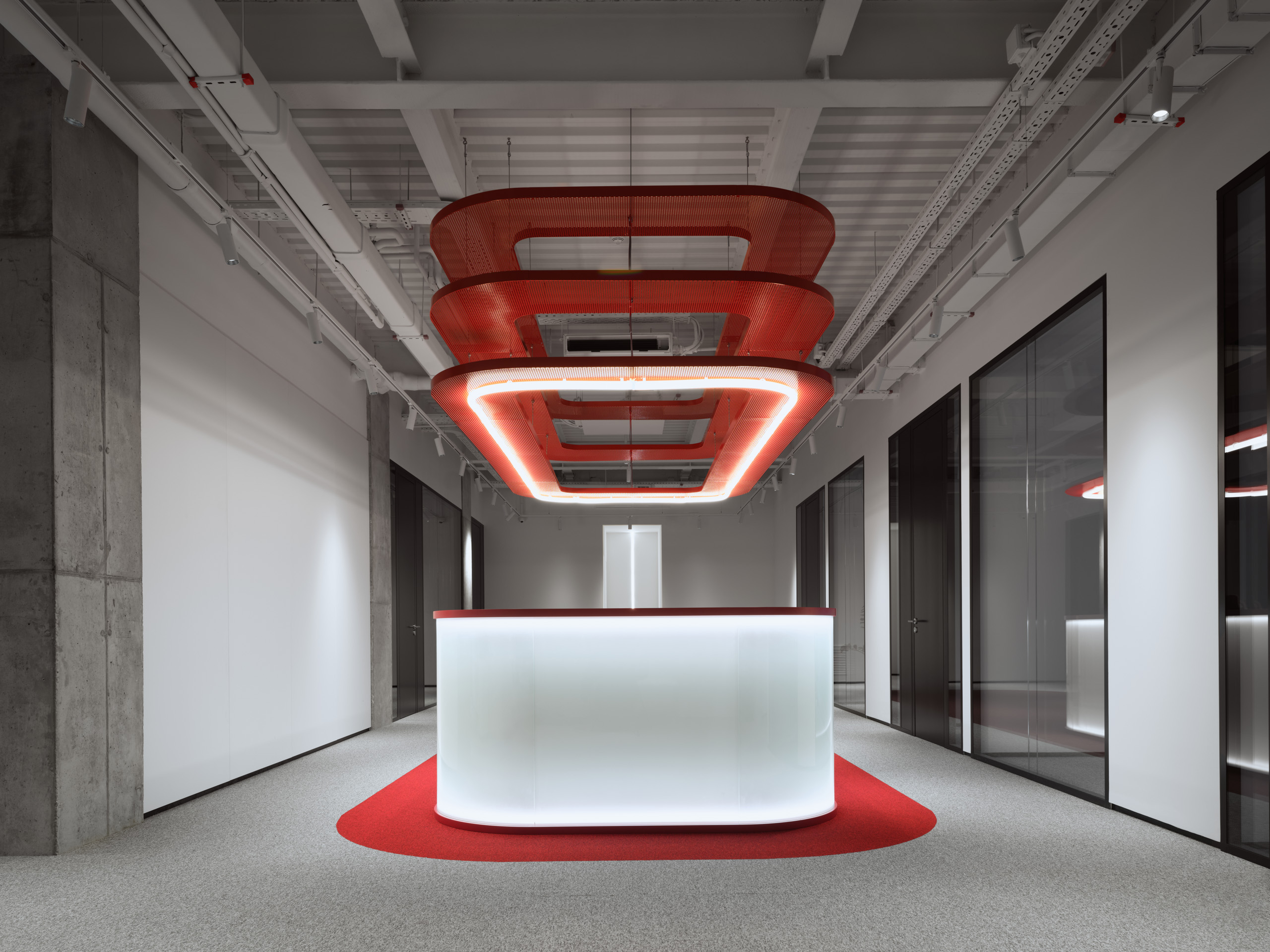 Цветовая гамма световых приборов соответствует цветам, используемым в основной отделке интерьера (белый, серый, красный). Задуманы и акценты: например, подсветка холодным светом прозрачной стойки рецепции, выделяет ее, делая похожей не искрящуюся льдину. В зоне сан узлов тонкие подвесные красные цилиндры не только обеспечивают функциональное освещение раковин, но и становятся декоративным элементом на фоне грубых бетонных стен. Еще один прием — светильник над ресепшн на 3 этаже. Он собран из кабеленесущих лотков, по мотивам которой сделаны офисные стеллажи на подвесах. На нижнем ярусе этого светильника расположен источник света, повторяющий овальную форму конструкции. Диффузный свет освещает саму зону рецепции, а также обозначает средний ярус, проходя через перфорацию, таким образом передавая объем оригинального объекта.