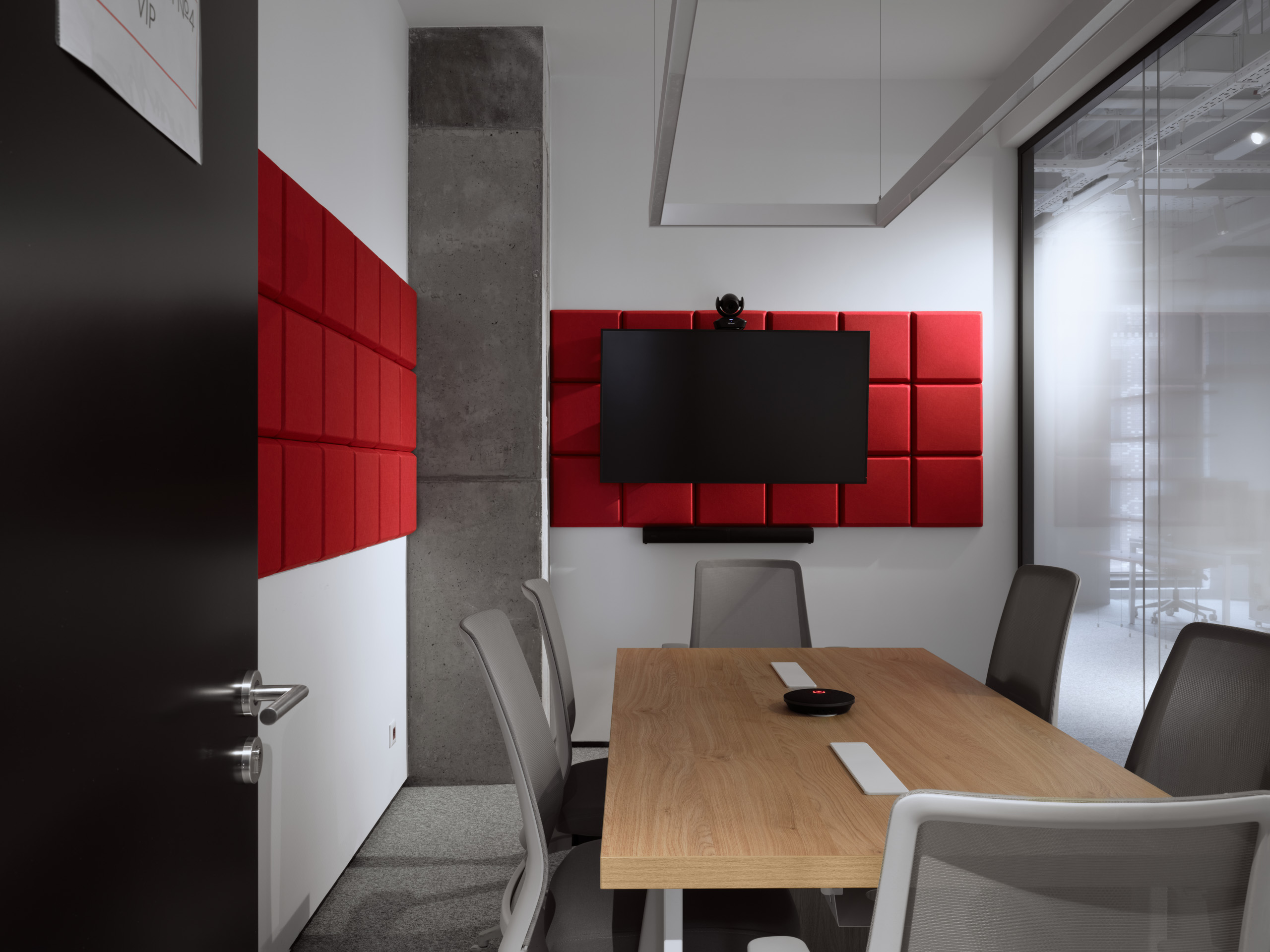 Переговорные комнаты, спортзал и кафе освещают подвесные системы прямоугольной формы с широкой оптикой. Для переговорных также предусмотрены встроенные светильники, позволяющие достичь равномерности освещения во всем пространстве, в том числе в углах. Благодаря наличию групп света можно просто и удобно регулировать освещение и менять его в зависимости от ситуации (активное обсуждение, спокойная беседа и т.д.).