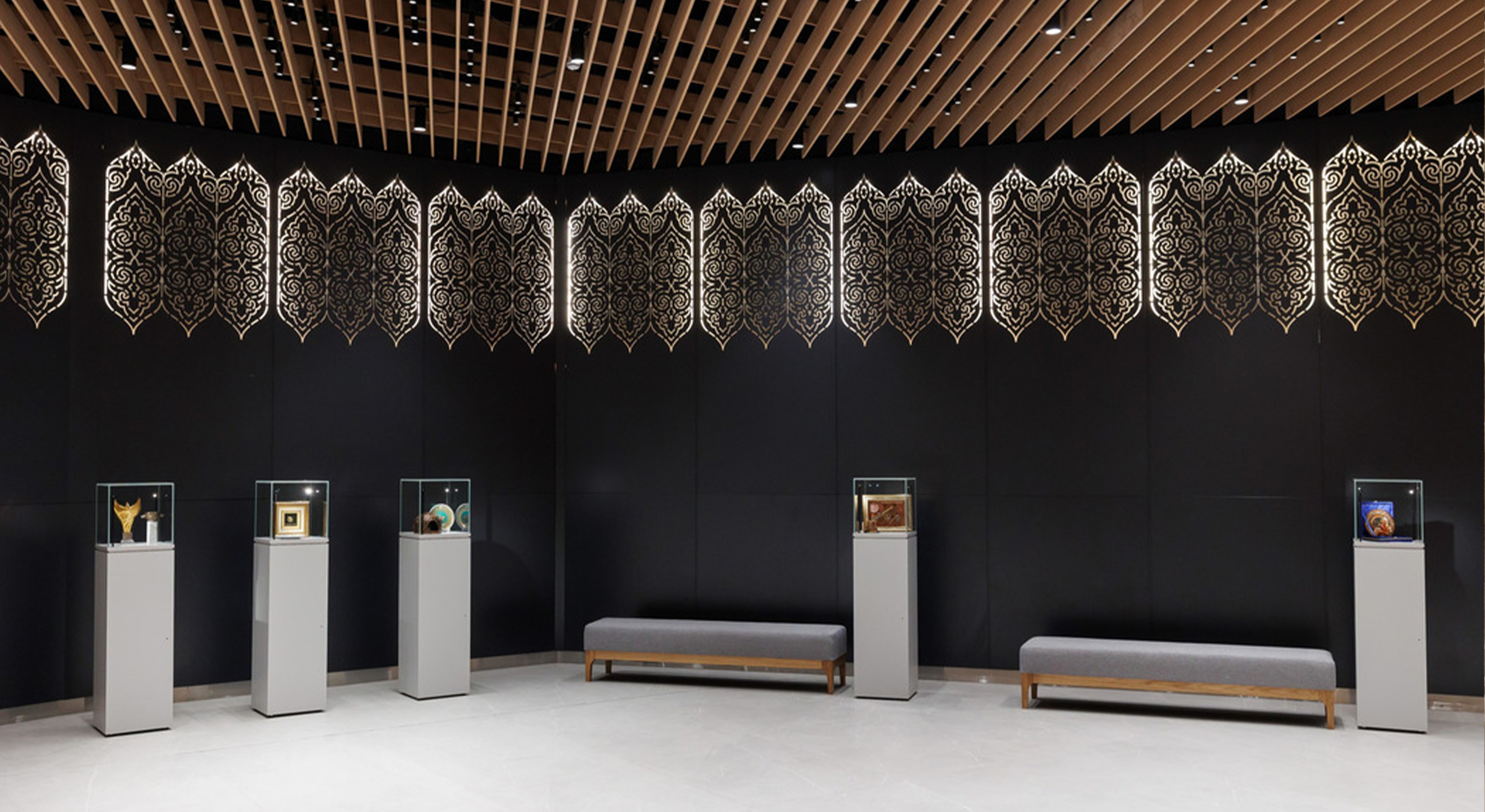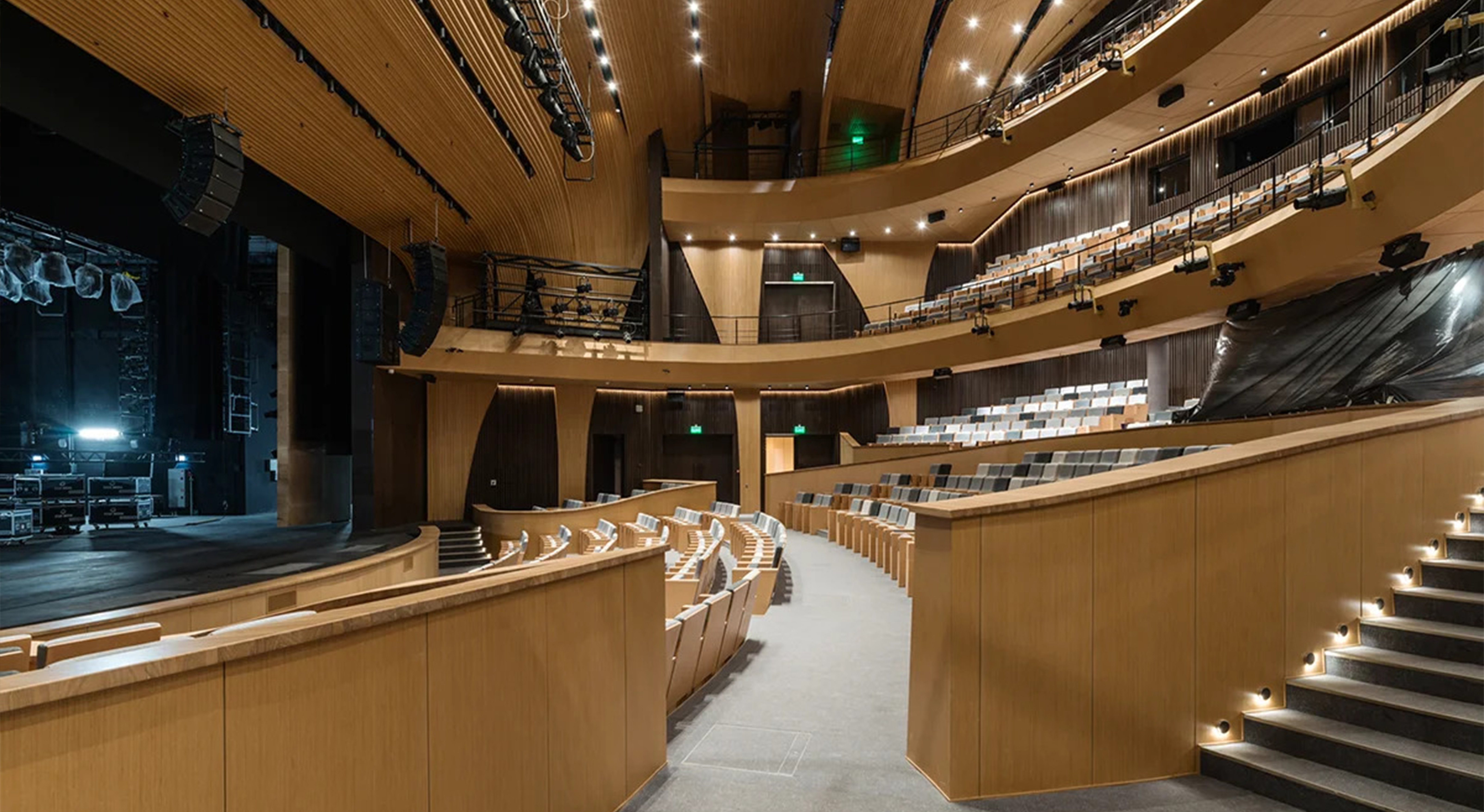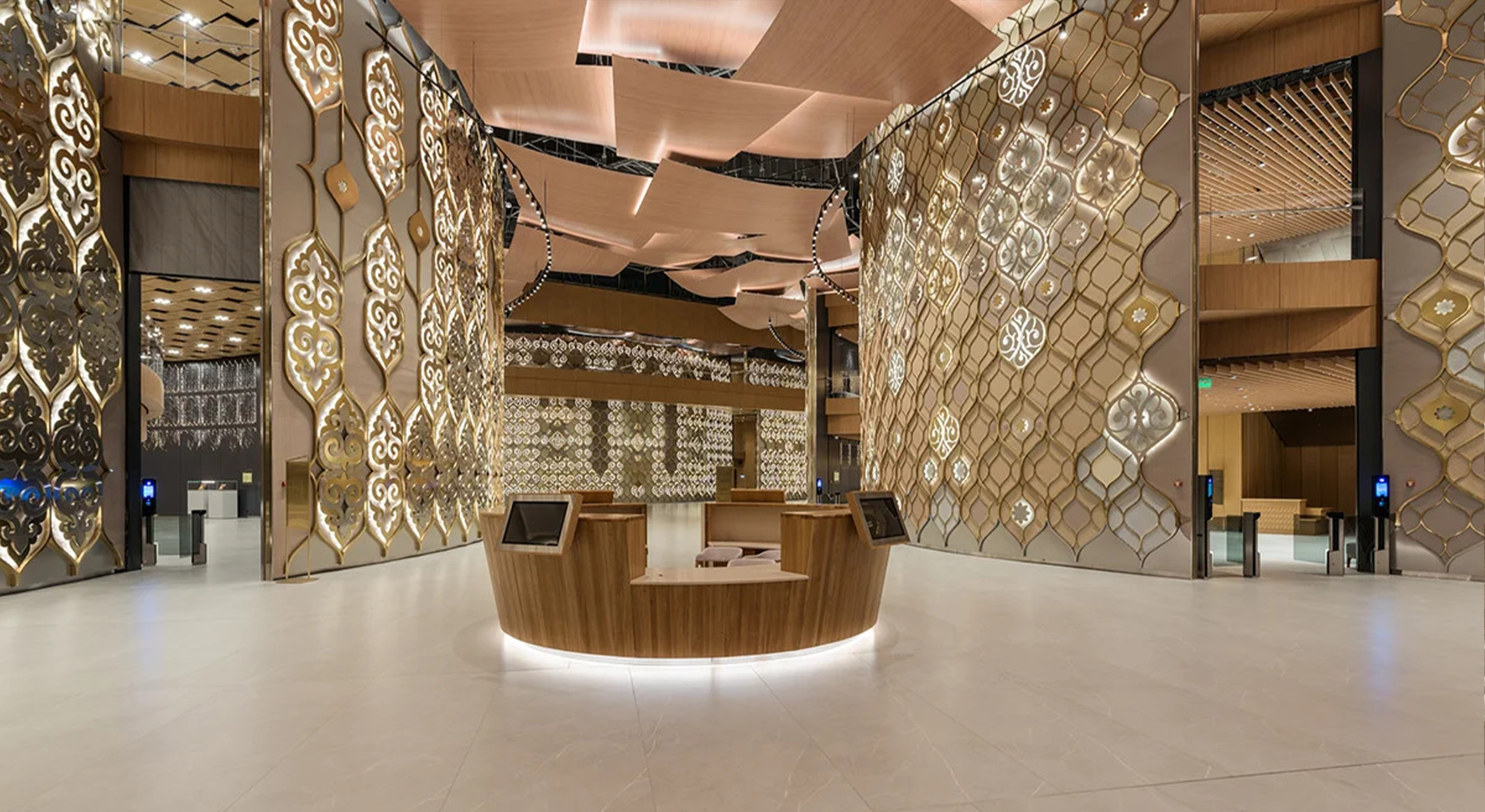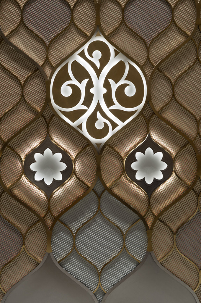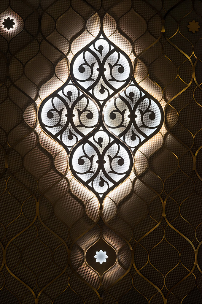 Световые решения для интерьера нового театра можно условно разделить на две части: общественные пространства для зрителей и закрытые зоны для сотрудников и персонала. Для каждой из них были разработаны оптимальные условия освещения, отвечающие функциональным задачам и авторским решениям архитекторов проекта. Стены театра украшают узоры, вдохновленные традиционными татарскими женскими украшениями. В проекте предусмотрено 16 стен-лепестков. Разные оттенки металла, отделка «серебром» и «золотом» в декоре лепестков, их переливчатый отсвет и многослойность придают стенам ажурность и легкость. Днем на них играет естественный свет, а в темное время суток лепестки оживают благодаря искусственному освещению. Эффектная контражурная подсветка узоров не только создает дополнительный акцент на элементах и добавляет объем, но и играет заметную роль в формировании общей освещенности пространства. Стены-лепестки венчает подвесная система с прожекторами, повторяющая их изгиб и создающая эффектные блики на золотых узорах.