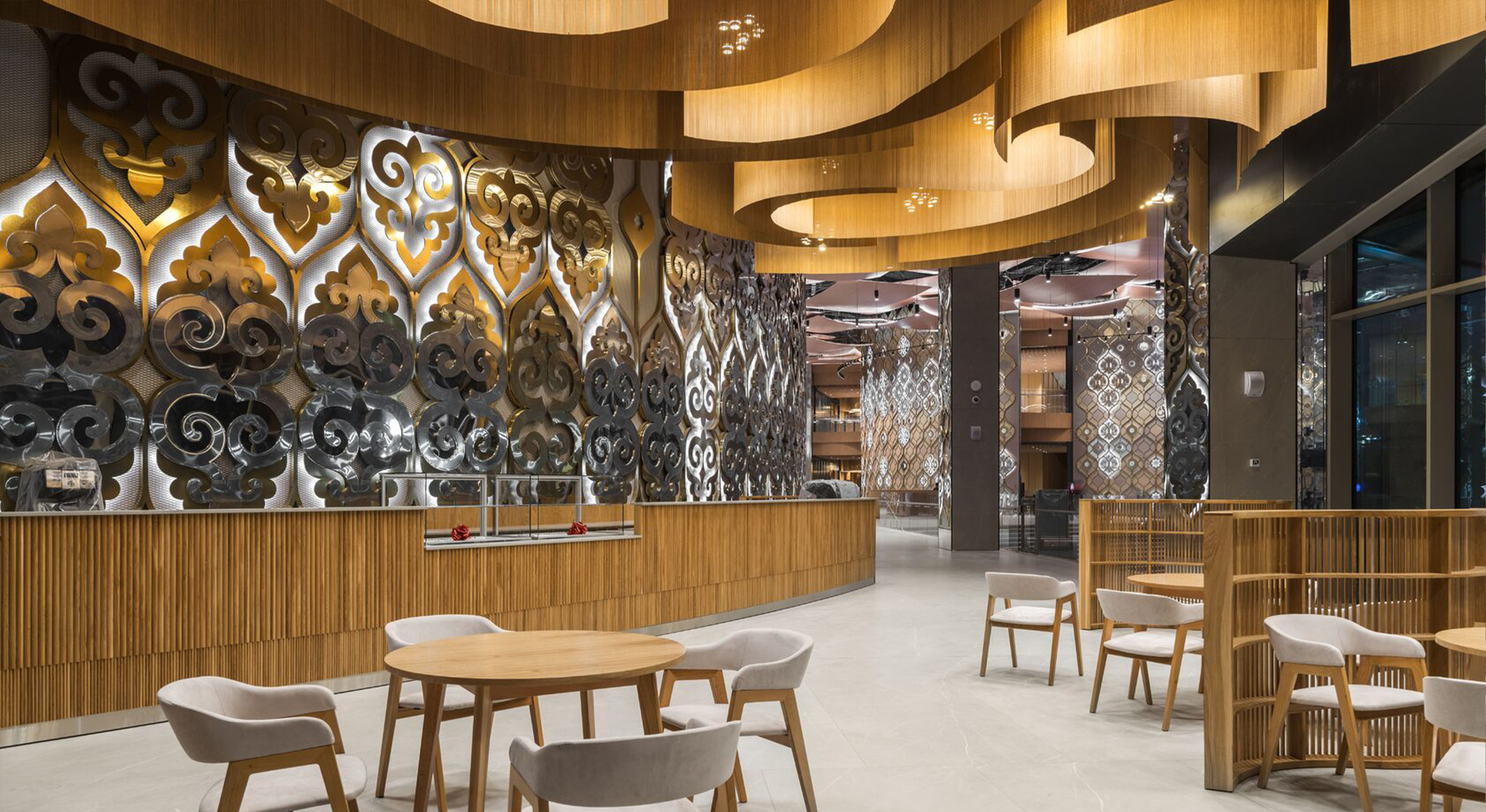 Еще одним уникальным объектом стала вертикальная подвесная волнообразная конструкция в зонах буфетов и в видовом ресторане, напоминающая занавес театра.