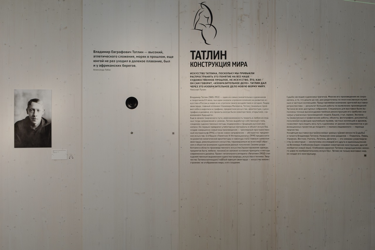 П.С.: Владимир Татлин — художник уникального диапазона: талантливый график и живописец, сценограф, пионер промышленного дизайна, автор самого известного авангардного архитектурного объекта, визионер и изобретатель. Семь разделов выставки строятся вокруг ключевых произведений мастера, каждый из которых знаменует новый период его насыщенной жизни. В эпоху авангарда личность художника и его произведения тесно сплетены, а необычная судьба Татлина, изобиловавшая нетривиальными и даже кинемотаграфичными сюжетами, нашла прямое отражение в его работах. Также нам показалось важным раскрыть поэтическую сторону его натуры: он был очень музыкален и любил стихи. Специально для выставки был создан саундтрек (команда Cinematica, композиторы Глеб Андрианов и Павел Поляков), который складывается в сложную пространственную звуковую инсталляцию. Для каждого раздела написана своя музыкальная тема. Они играют не единовременно, а последовательно, иногда накладываясь друг на друга: звуки доносятся из соседних разделов не перебивая, но дополняя. Таким образом каждый раз получается свой уникальный звуковой маршрут или ландшафт.