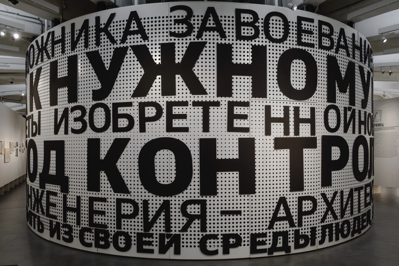 Юрий Аввакумов: Выставка в плане похожа на детскую вертушку из квадрата бумаги, разрезанного и сложенного в форме винта, вращающегося на ветру. Шесть прямых отрезков временных стен, направленных по касательной к центральному барабану, образуют разделы выставки, развивающейся в хронологическом порядке: плаватель – певец – управник – вестник – учитель – летатель – делатель. Основной строительный материал – трехслойные стеновые панели из цельной древесины, покрашенные полупрозрачными белилами, составлены внахлест. Каждый раздел сопровождается аудиоточками с цитатами Владимира Татлина и его современников. Точки находятся на высоте высокого роста художника. Центральный барабан покрыт татлинскими лозунгами. Графический дизайн осуществлен Михаилом Аникстом и Дмитрием Мордвинцевым.