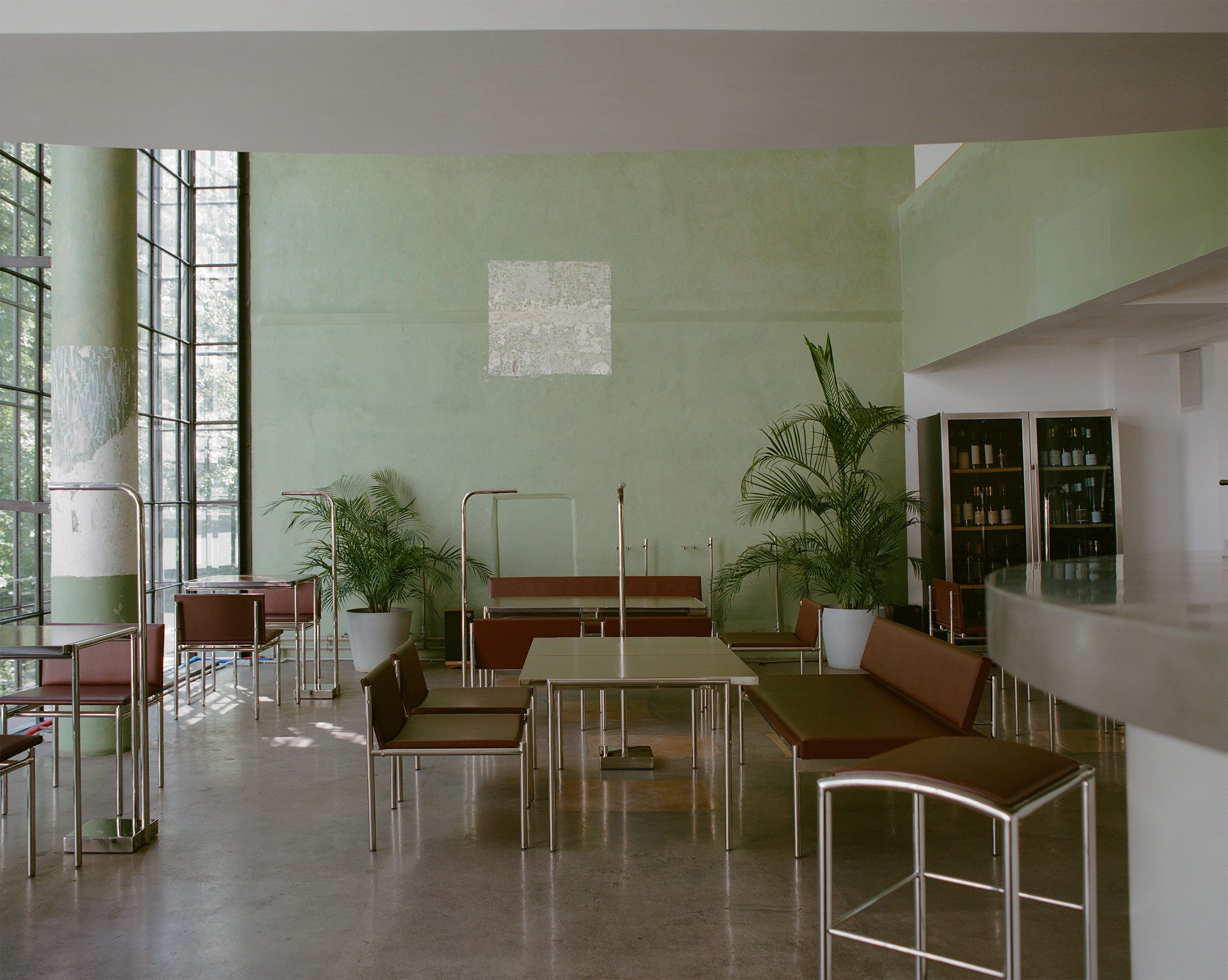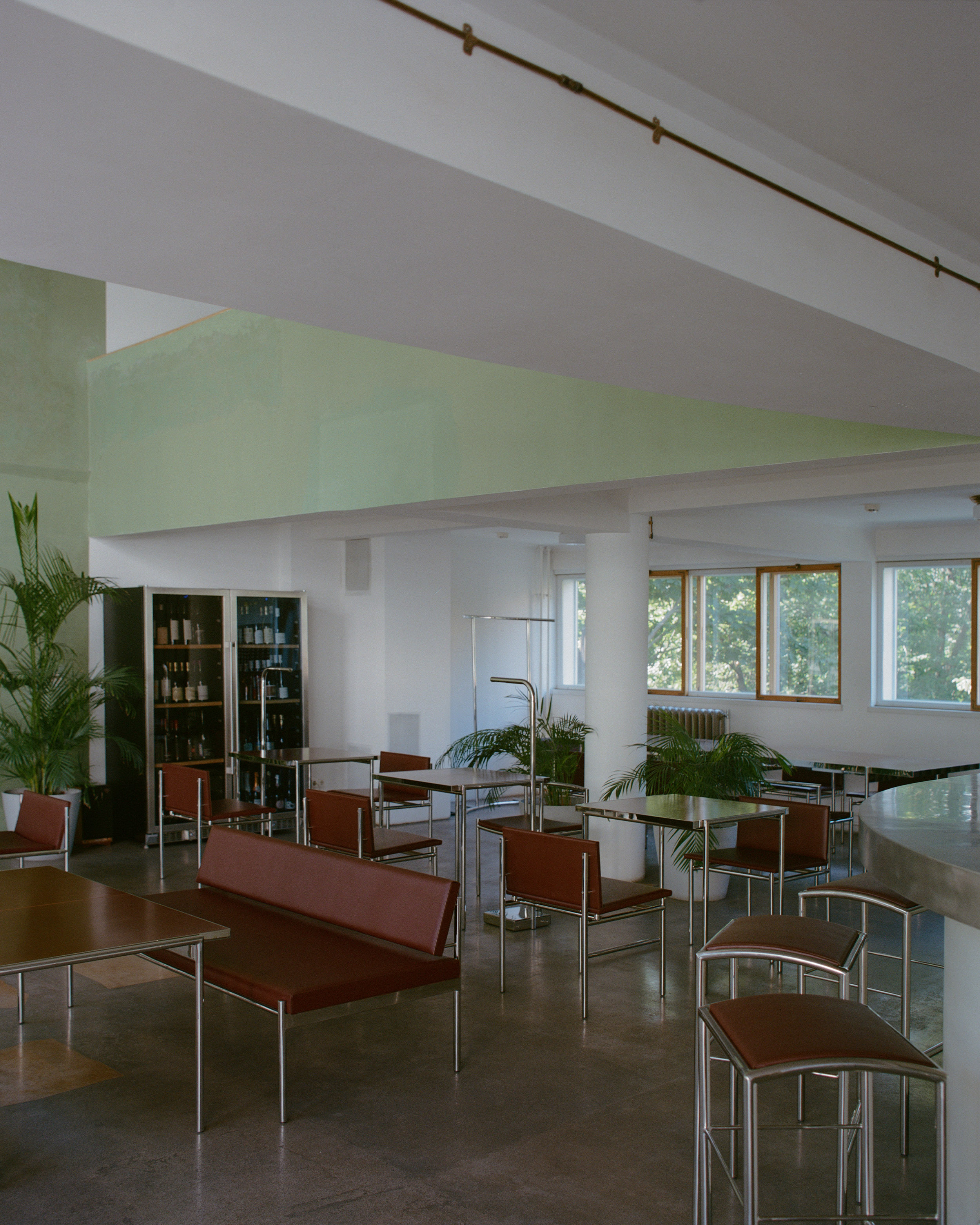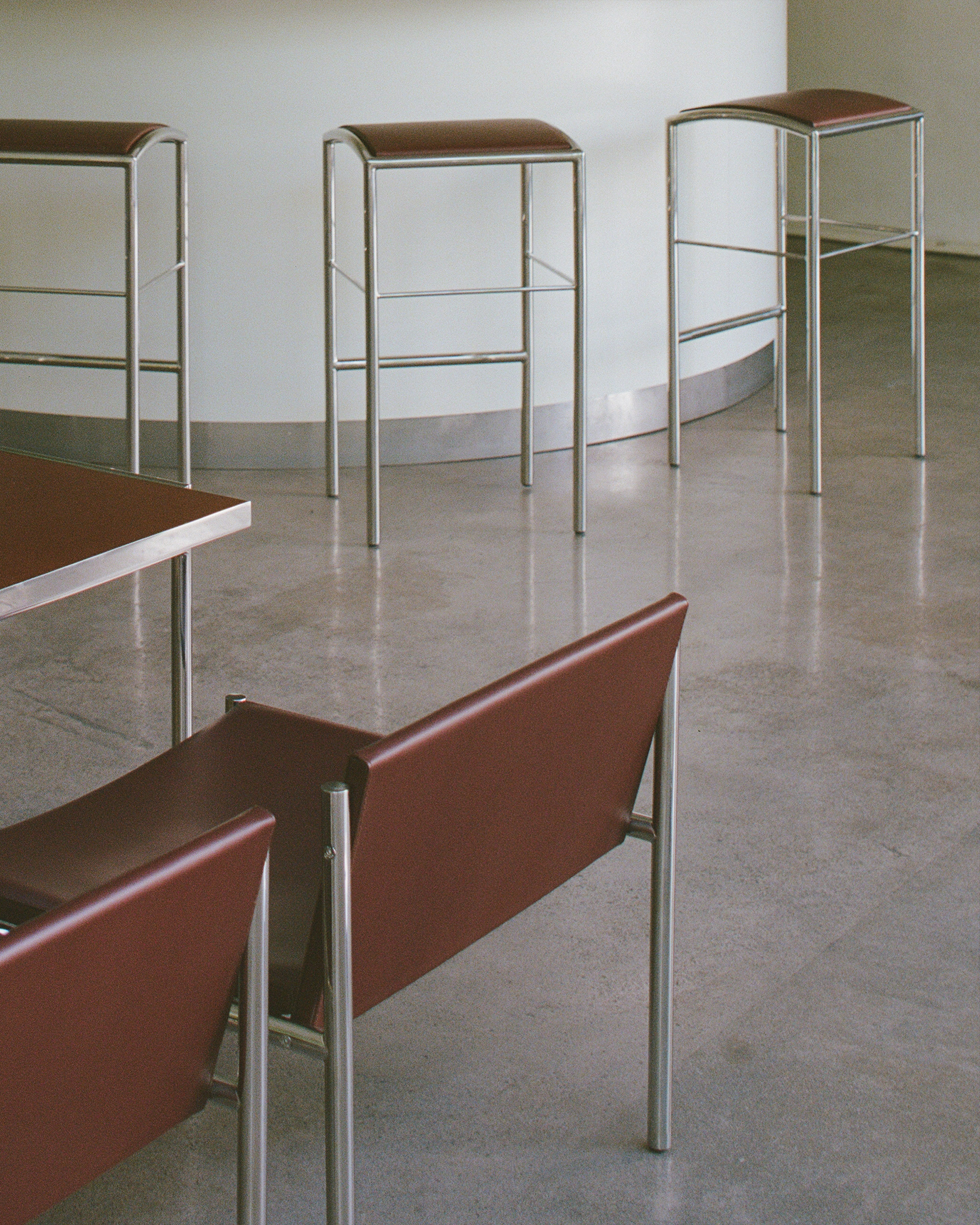 Стулья выполнены из красно-коричневой кожи и напоминают отделку в общественных зданиях советской эпохи, а столешницы сделаны из текстолита — материала, который обычно не используется в эстетических целях.