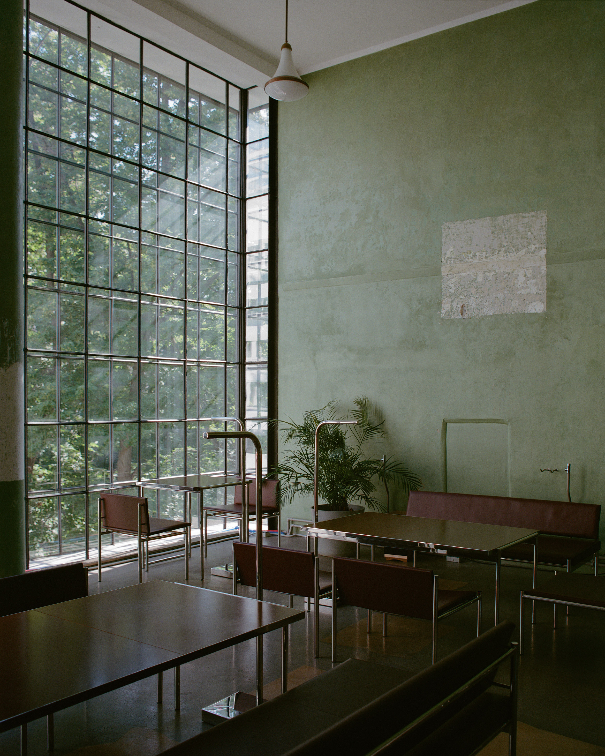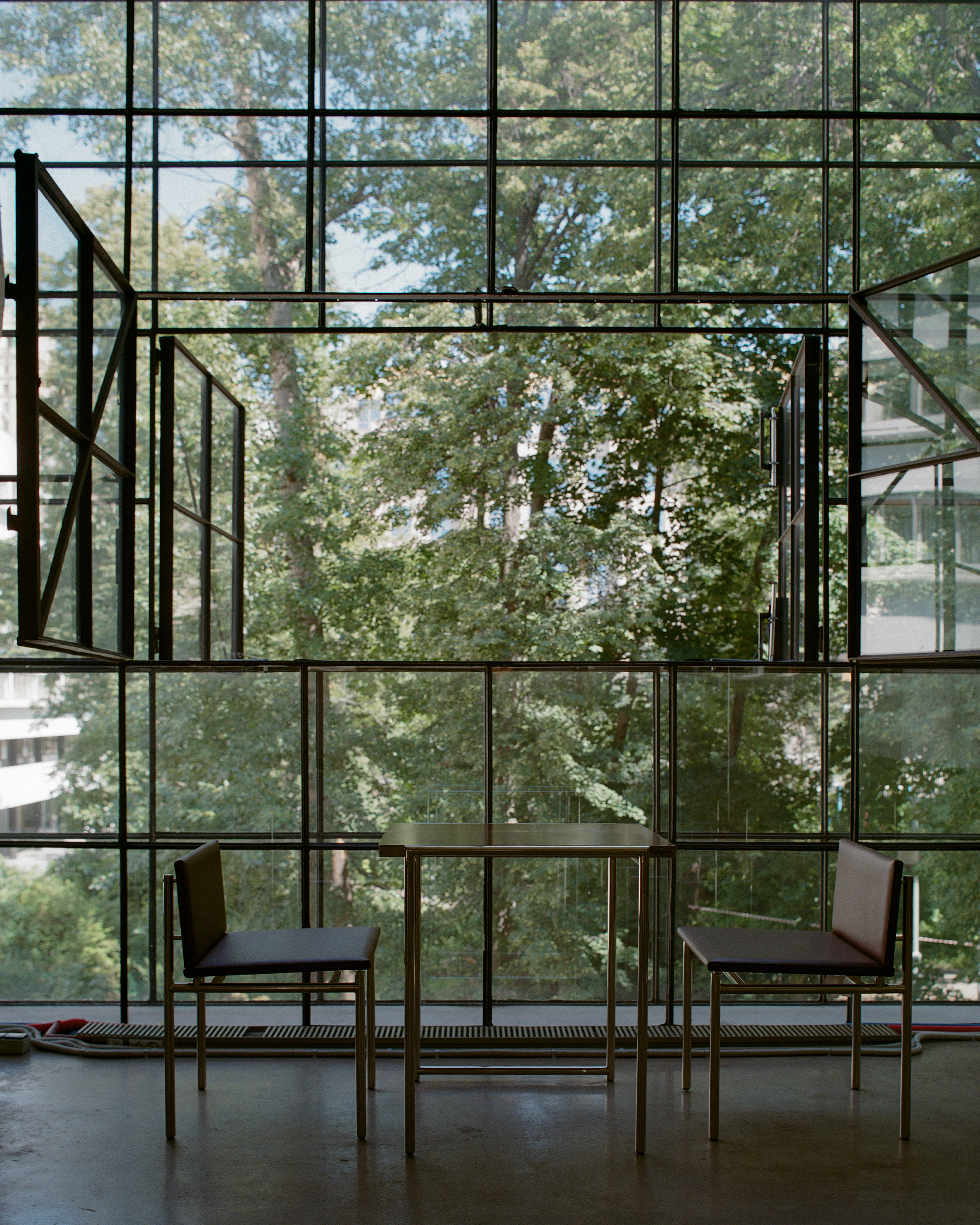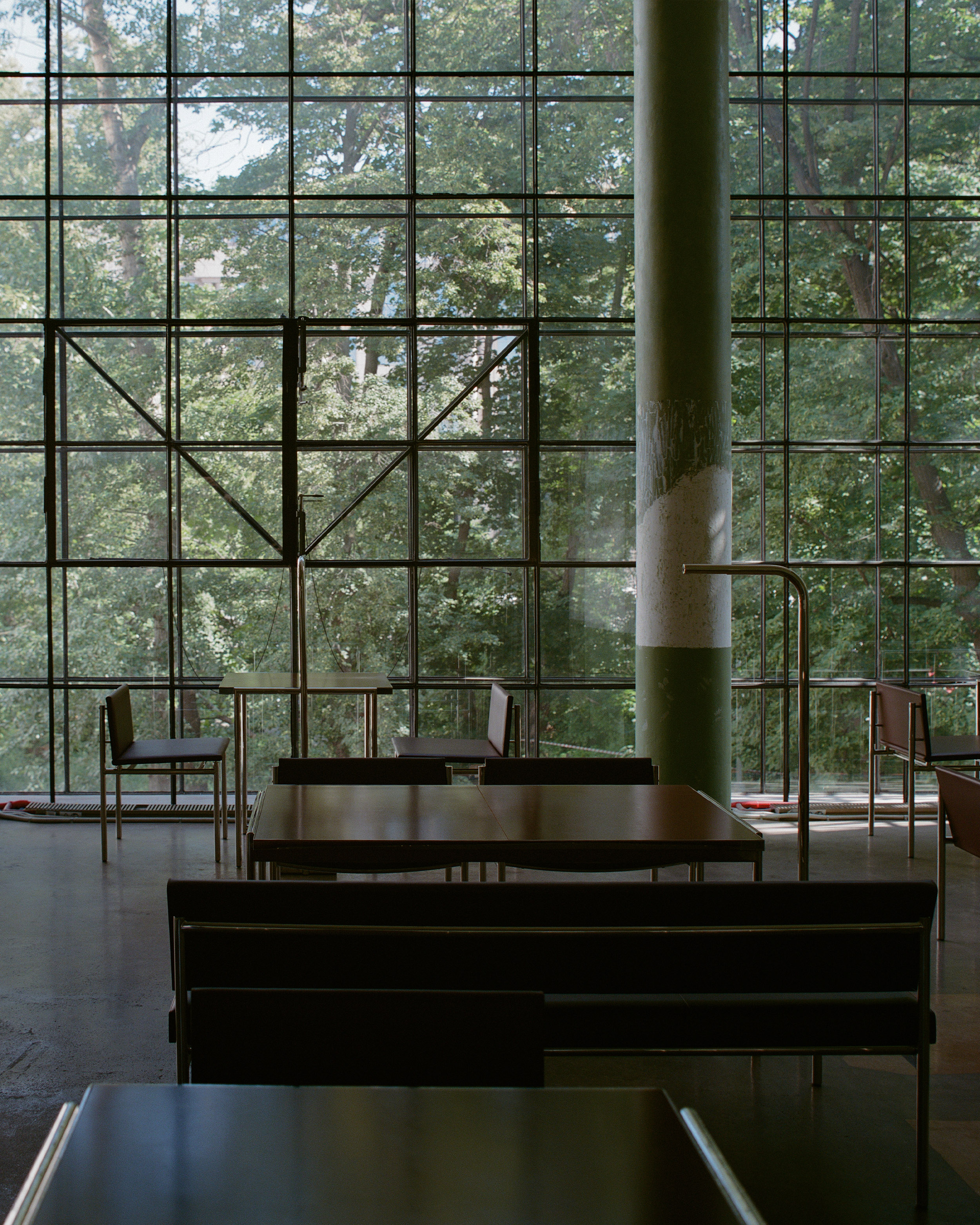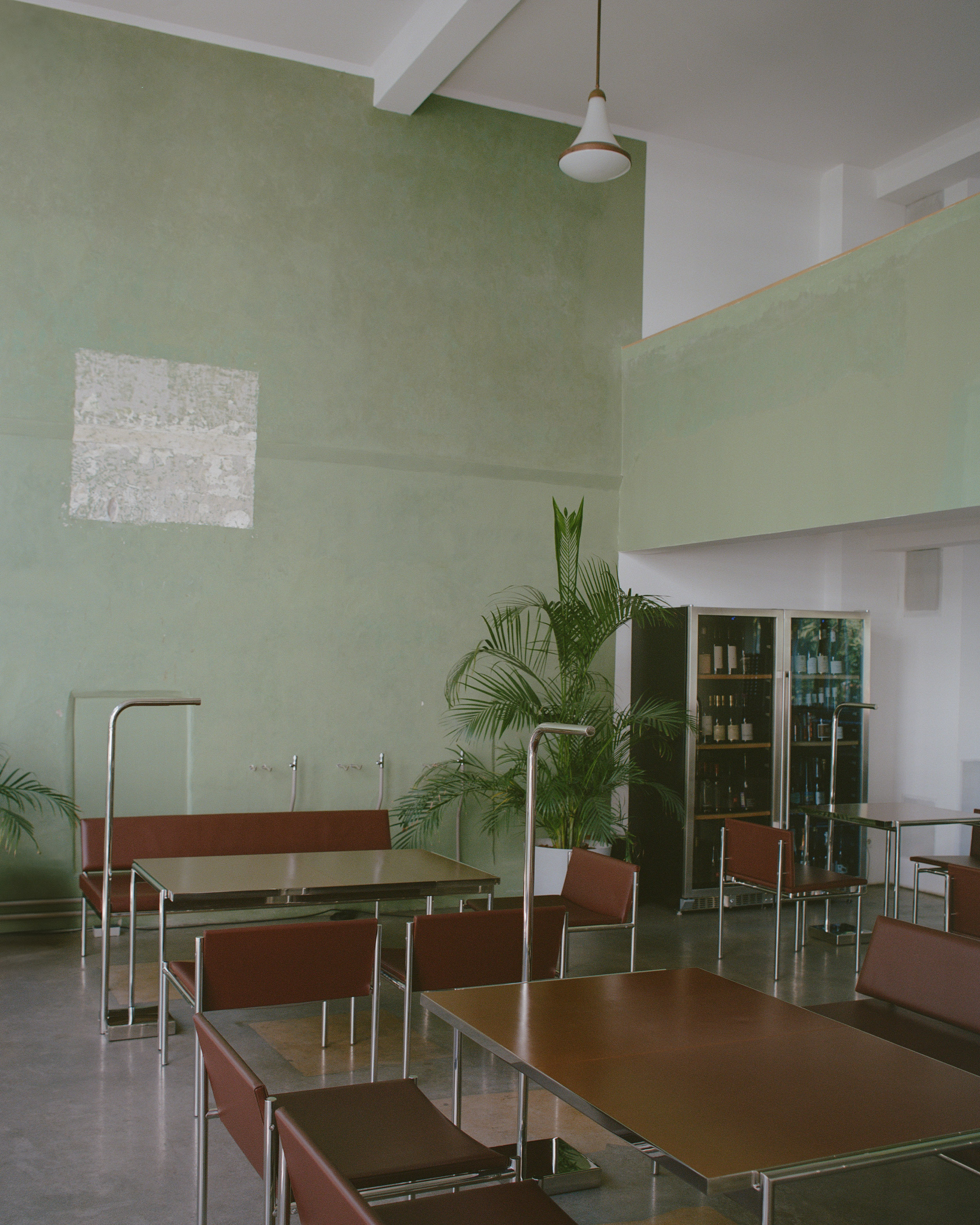 Стулья выполнены из красно-коричневой кожи и напоминают отделку в общественных зданиях советской эпохи, а столешницы сделаны из текстолита — материала, который обычно не используется в эстетических целях.