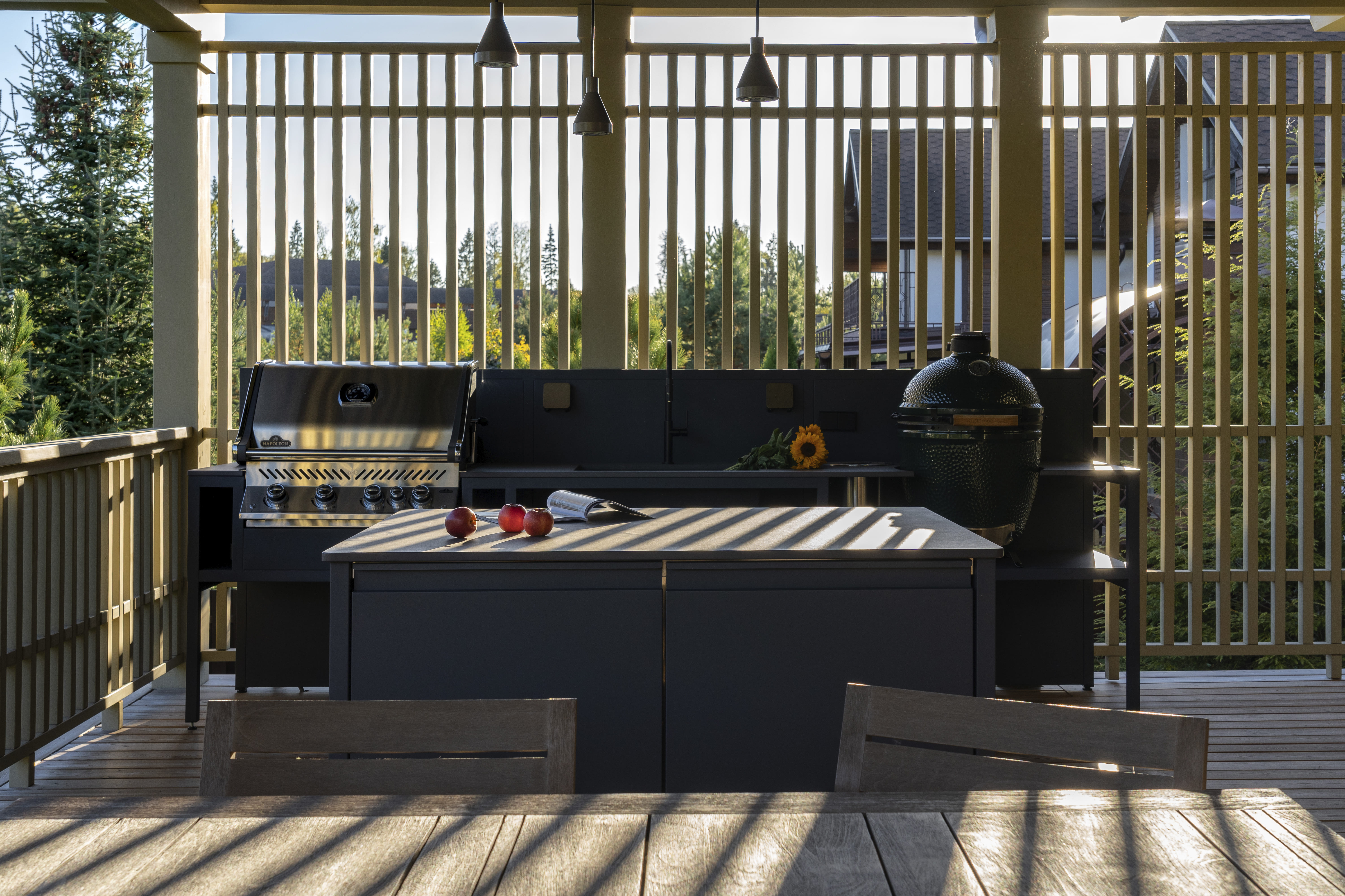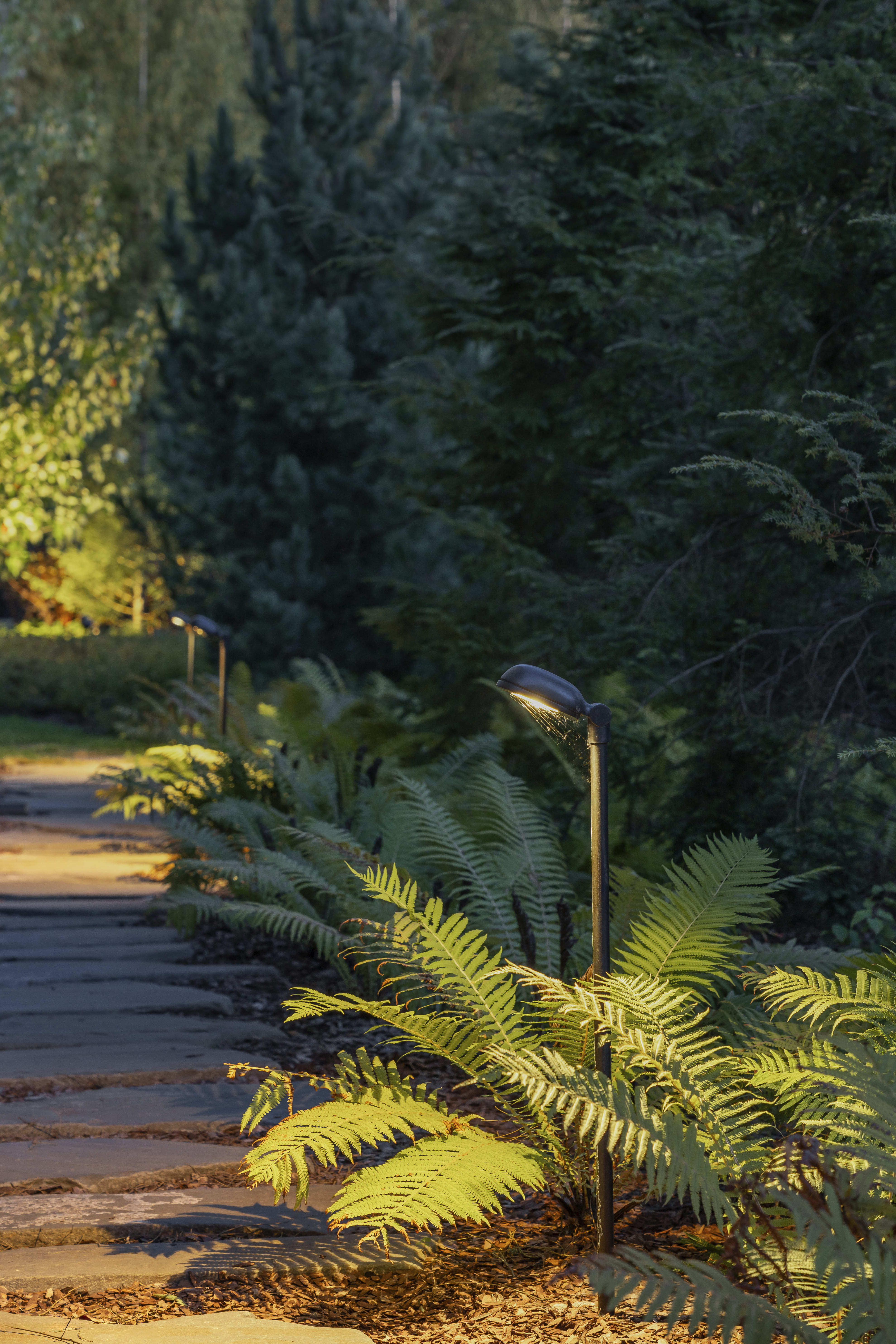 Мискантус служит своеобразным смягчением контуров участка, а его высокие стебли, колышась на ветру, придают месту загадочности. Особое внимание было уделено оформлению садовых дорожек. Вдоль каменной тропинки высажены папоротники. Их насыщенные оттенки контрастируют с камнем и создают таким образом визуальную глубину. Вечернее освещение превращает уголок в новую живую картину. Садовая кухня служит местом притяжения для всех членов семьи. Здесь можно устроить праздничное застолье, приготовив домашнюю еду на гриле. На террасе кухни можно насладиться тишиной и покоем.