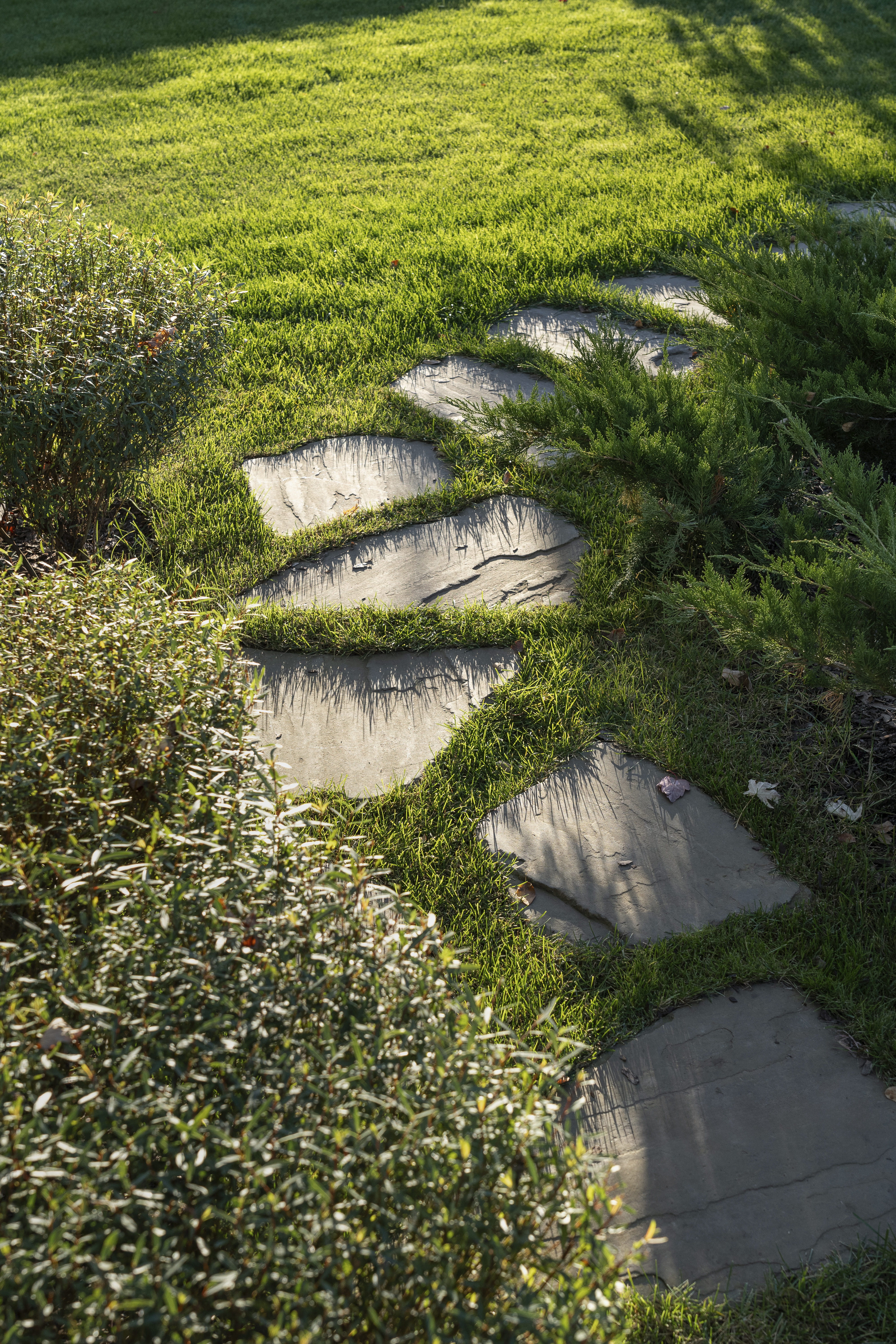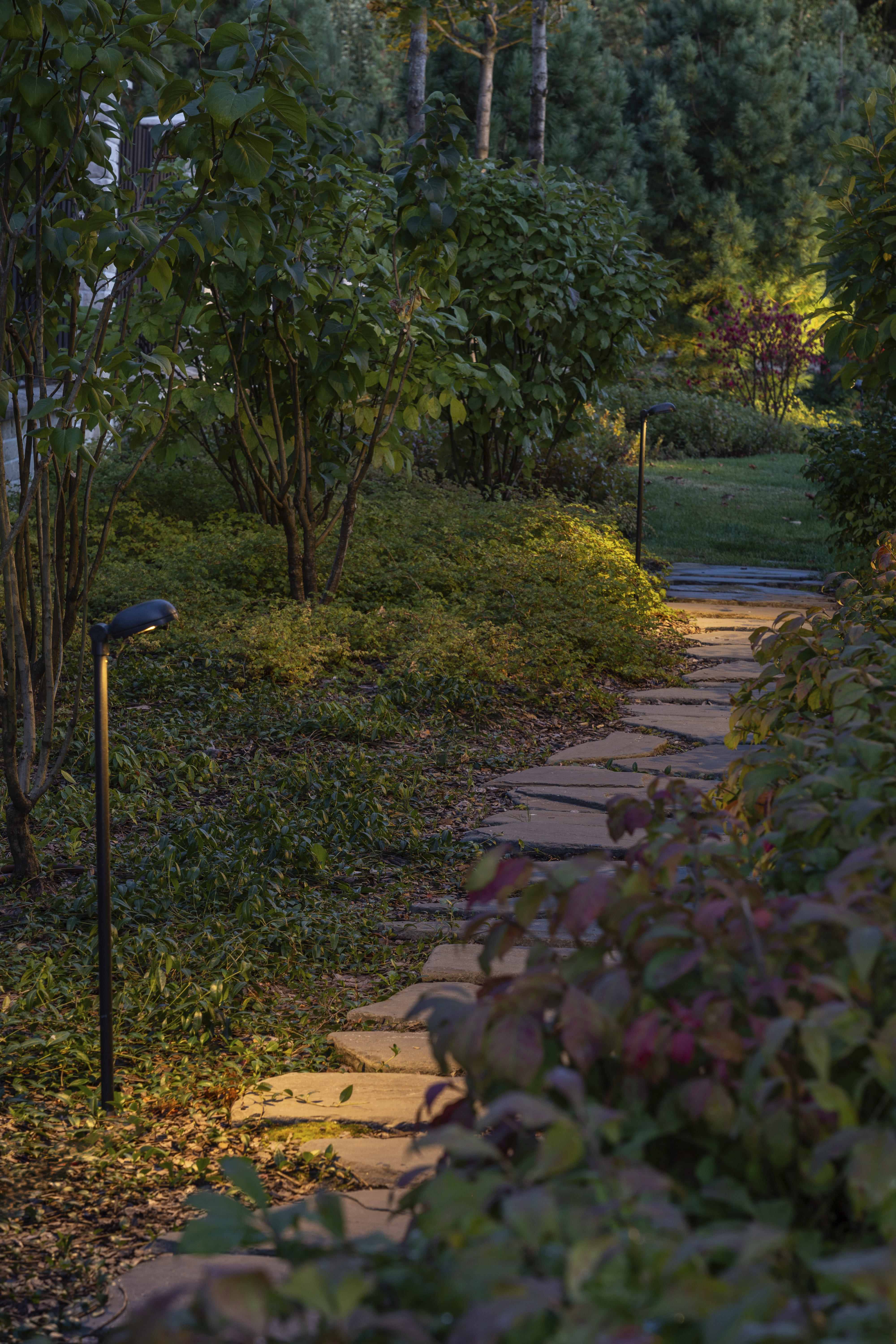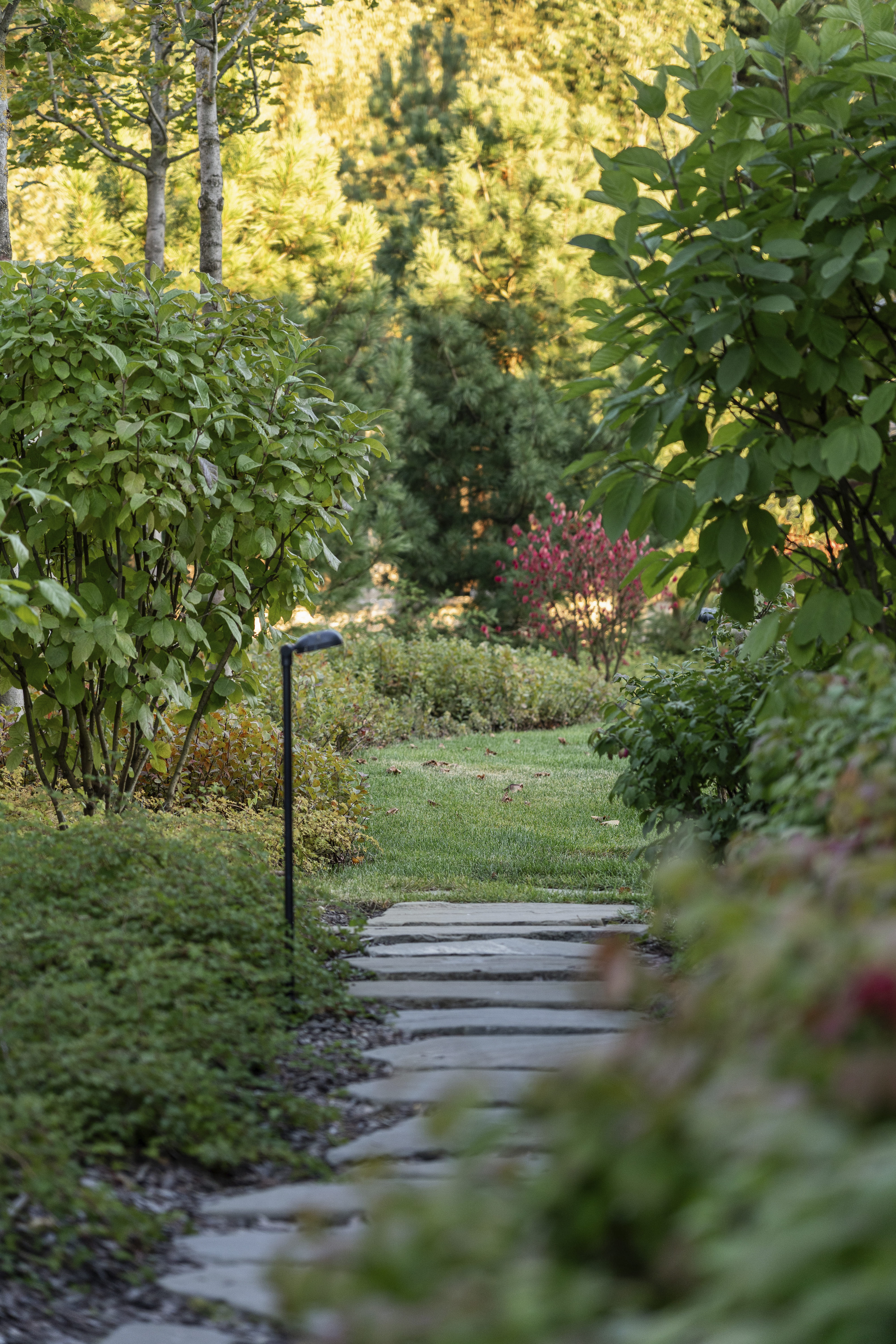 В отличие от многих традиционных решений, здесь отсутствуют классические цветники. Вся динамика и игра фактур достигаются за счет многоярусных кустарников, обеспечивающих декоративность в течение всего года.